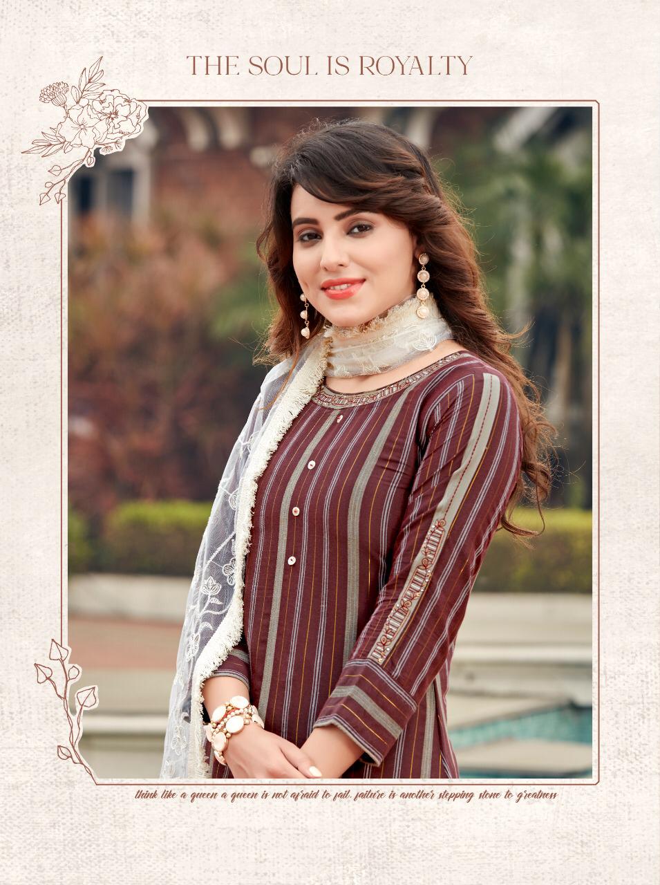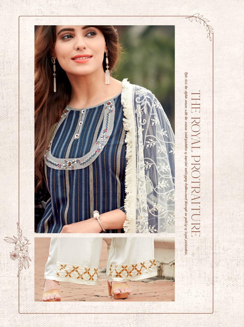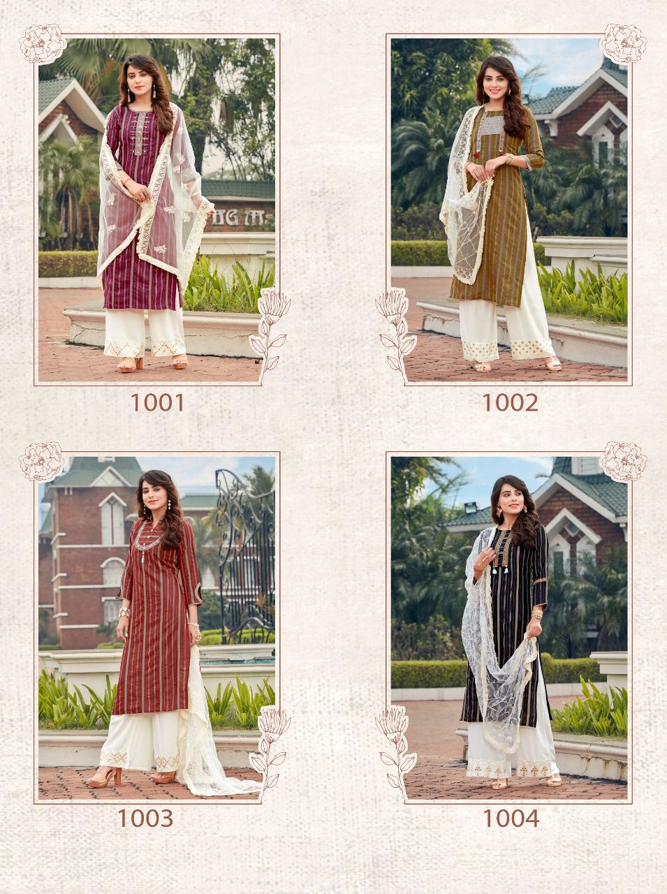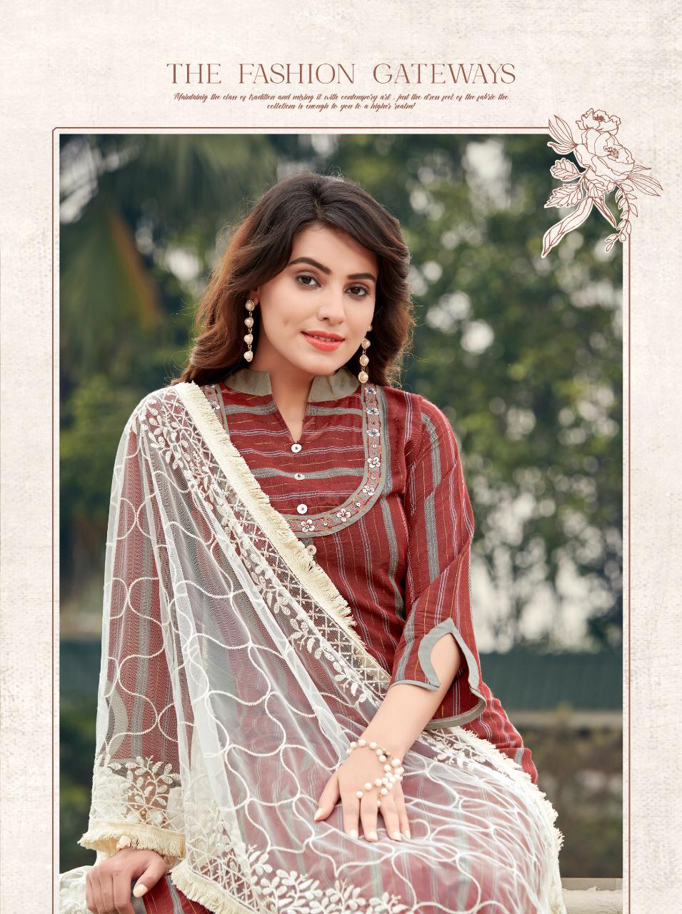 Brand Name : Ladies Flavour Catalog : Lucknowi Designs : 7 Fabric:- Top :- Rayon Lurex with Embroidery Work Bottom :- Rayon With Embroidery Paper Work Duppata :- Lucknowi( 2.20 mtr cut) Size : M(38), L(40), XL(42), 2XL(44), 3XL(46) Rate :- 945/- Dispatch :- Within 3-4 Days |