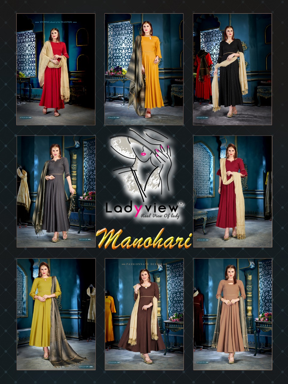 Fashion Of Kurti With Dupatta We Launch MANOHARI Brand Name : Ladyview Catalog : Manohari Design : 8 Fabric : Pure Weaving Butti Rayon With Decent Lace Work Dupatta : Banarasi Size:- M(38),L(40),XL(42),XXL(44) Length :- 56" Rate :- 795/- GST 5% Extra Disptach date:-Today Full set only .. Regards_ LADYVIEW |