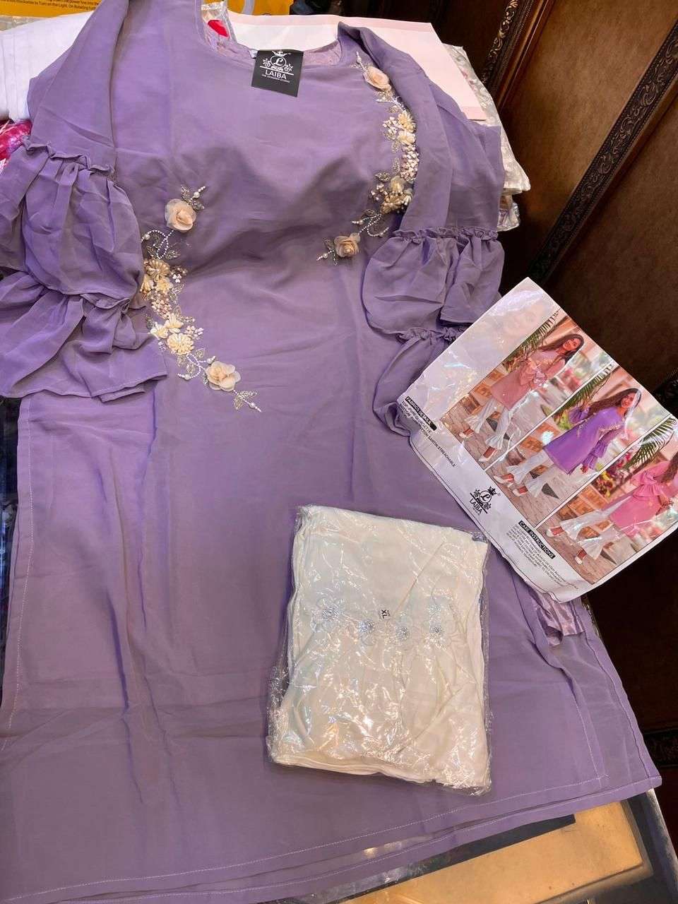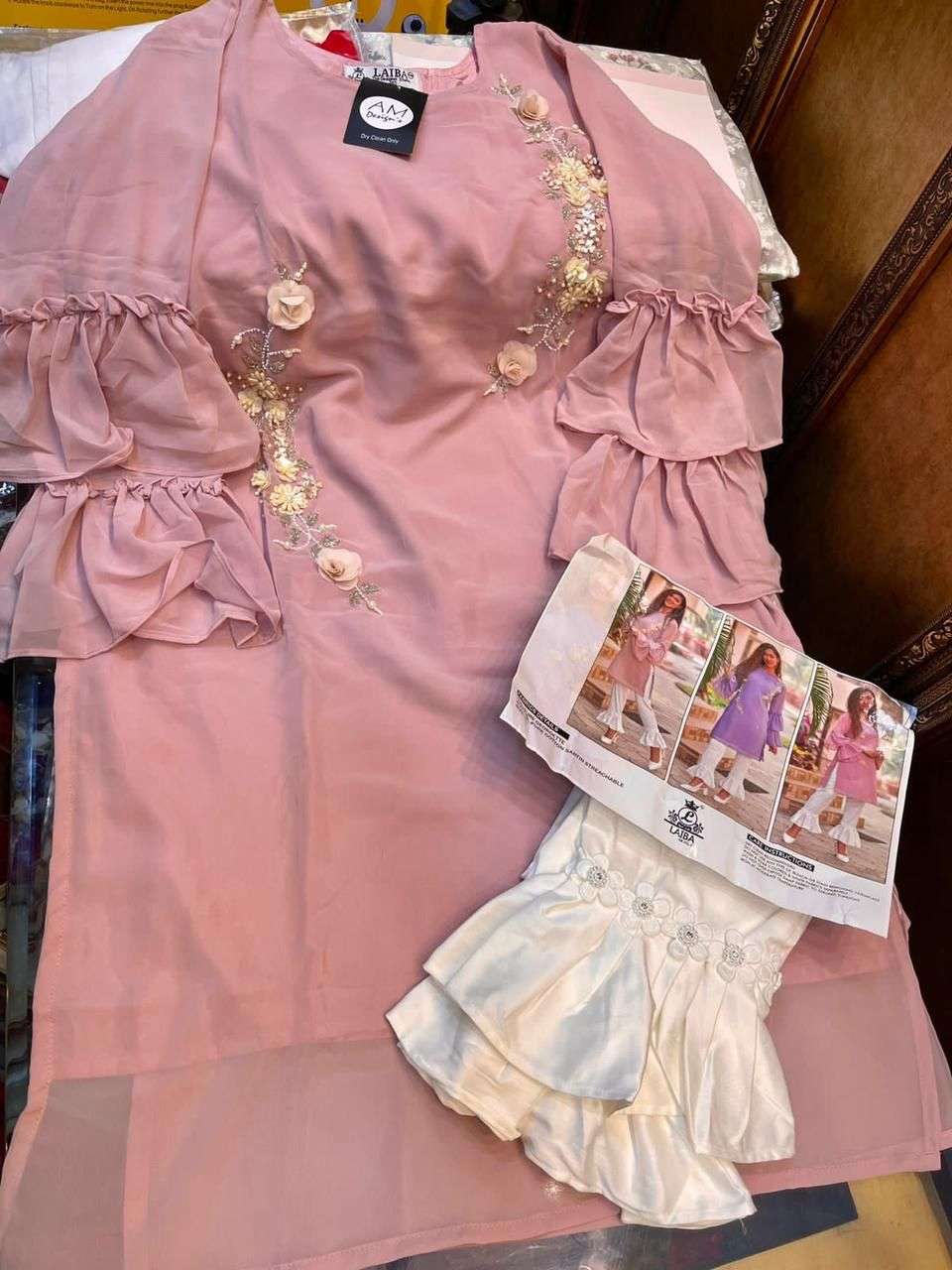 ASTONISHING COLLECTION            ORIGINAL BY  LAIBA THE DESIGNER STUDIO        AM VOL-89 Description  Designer  Tunic with classy  Hand work  with 3D flowes paired with Beautiful 2 layered frill sleeves and paired with Designer  cigarette pant with beautiful Diamond Gpo lace Details Top:- Pure Georgette Pant :- Pure cotton sartin streachable Colour Pink / Coffee / lavender  Size Chart  Top xl size chest (42) Bottom xl size (34-38) Rate 1199/-each       Colour may slightly vary due to light effect Very very Limited Stock      Dispatching ready |