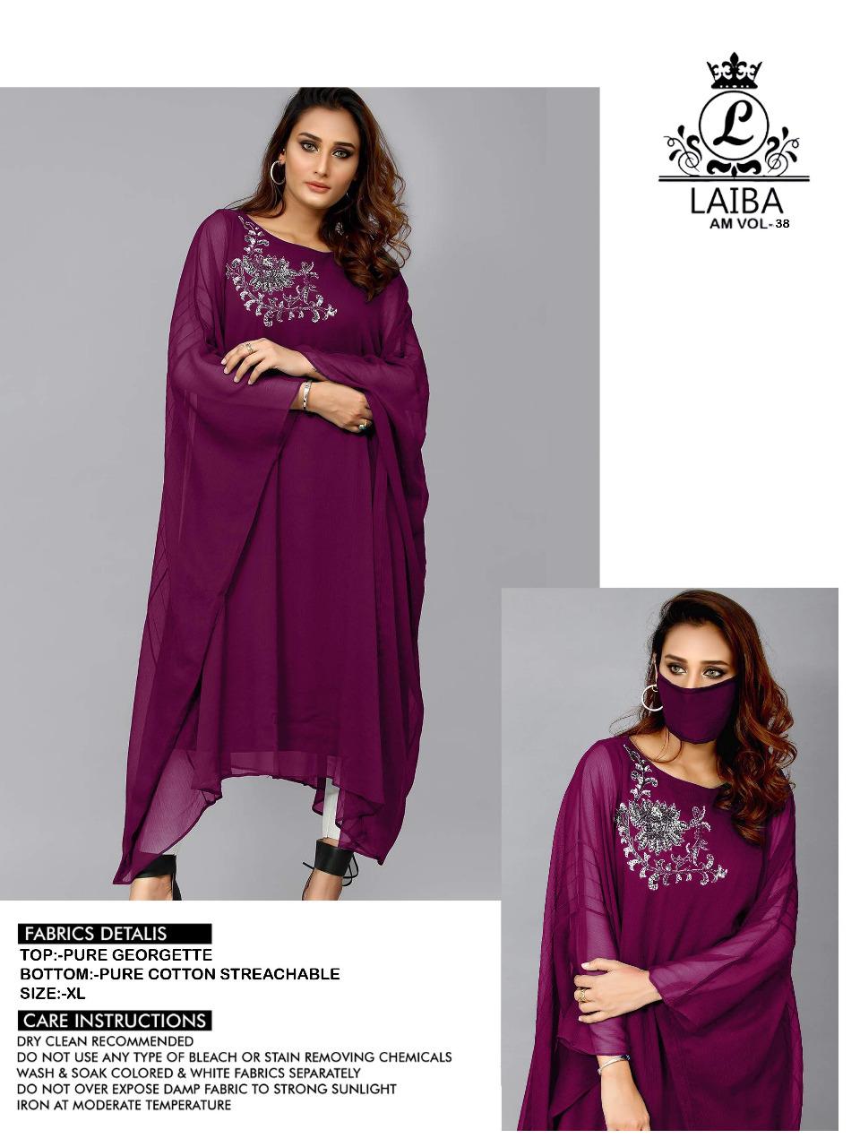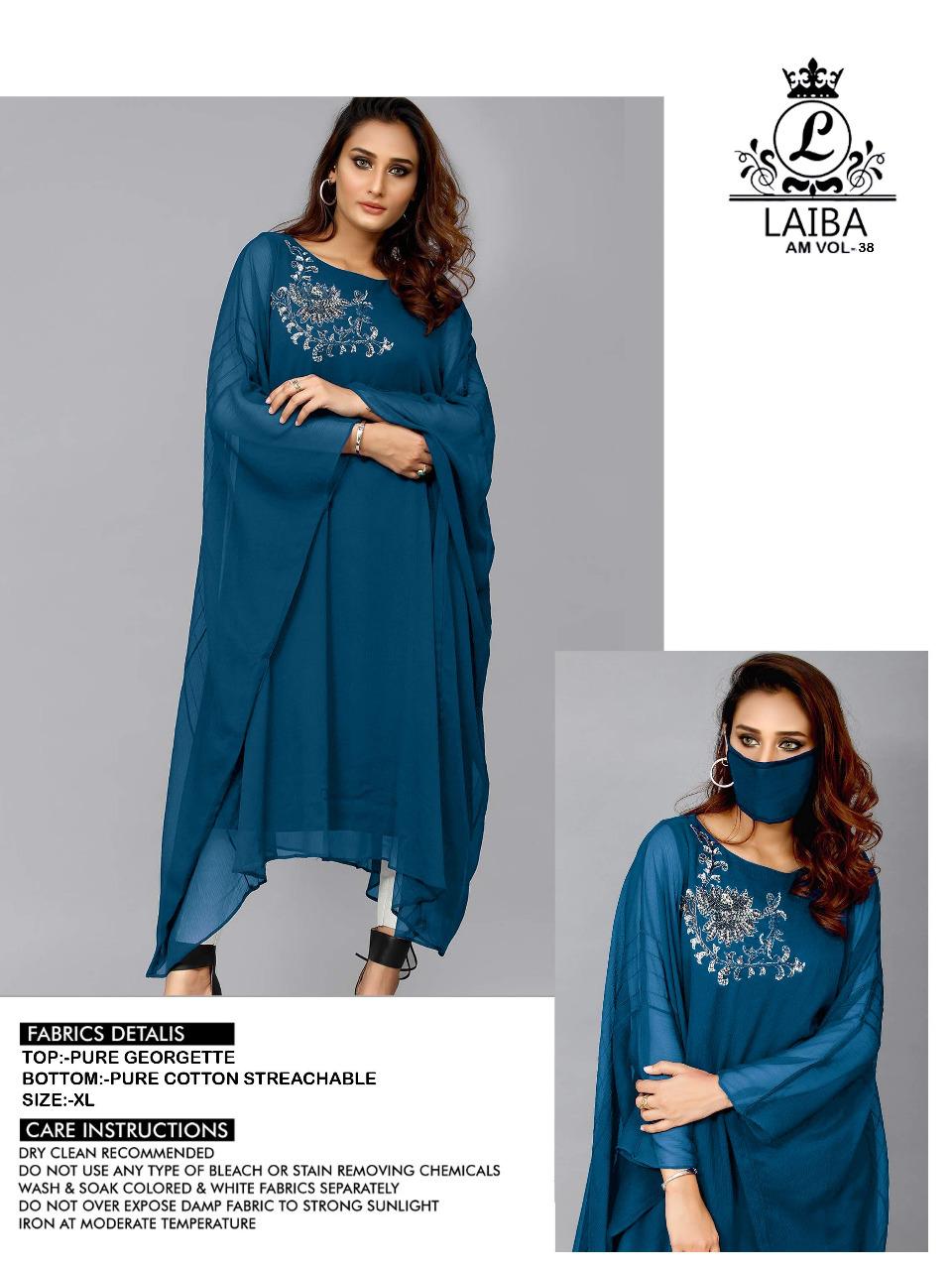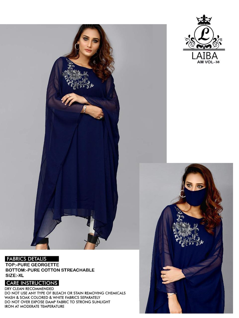 SURAT LAIBAs KAFTAN EDITION‼️ Look Formal yet Classy in our new Designer collection ➖➖➖➖➖➖➖ LAIBA THE DESIGNER STUDIO by AM VOL-38 ➖➖➖➖➖➖➖➖ 🔴 Description🔴 〰〰〰〰〰〰〰 Designer Long Tunic with beautiful classy kaftan with hand work 🔴 Details🔴 〰〰〰〰〰〰〰 ✨ Top:- Pure Georgette ✨ Bottom :-Pure cotton streachable ✨ Colour :- 3 colors NAVY BLUE , WINE , RAMA ✨ Top xl size chest (42) ✨ Top length:-44+ MASK INSIDE ✨ Rate 899/-each Krishna Creation Surat |