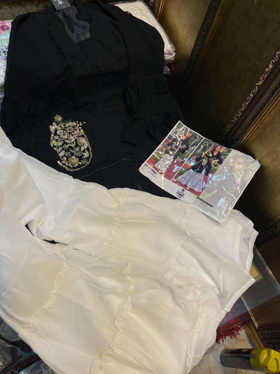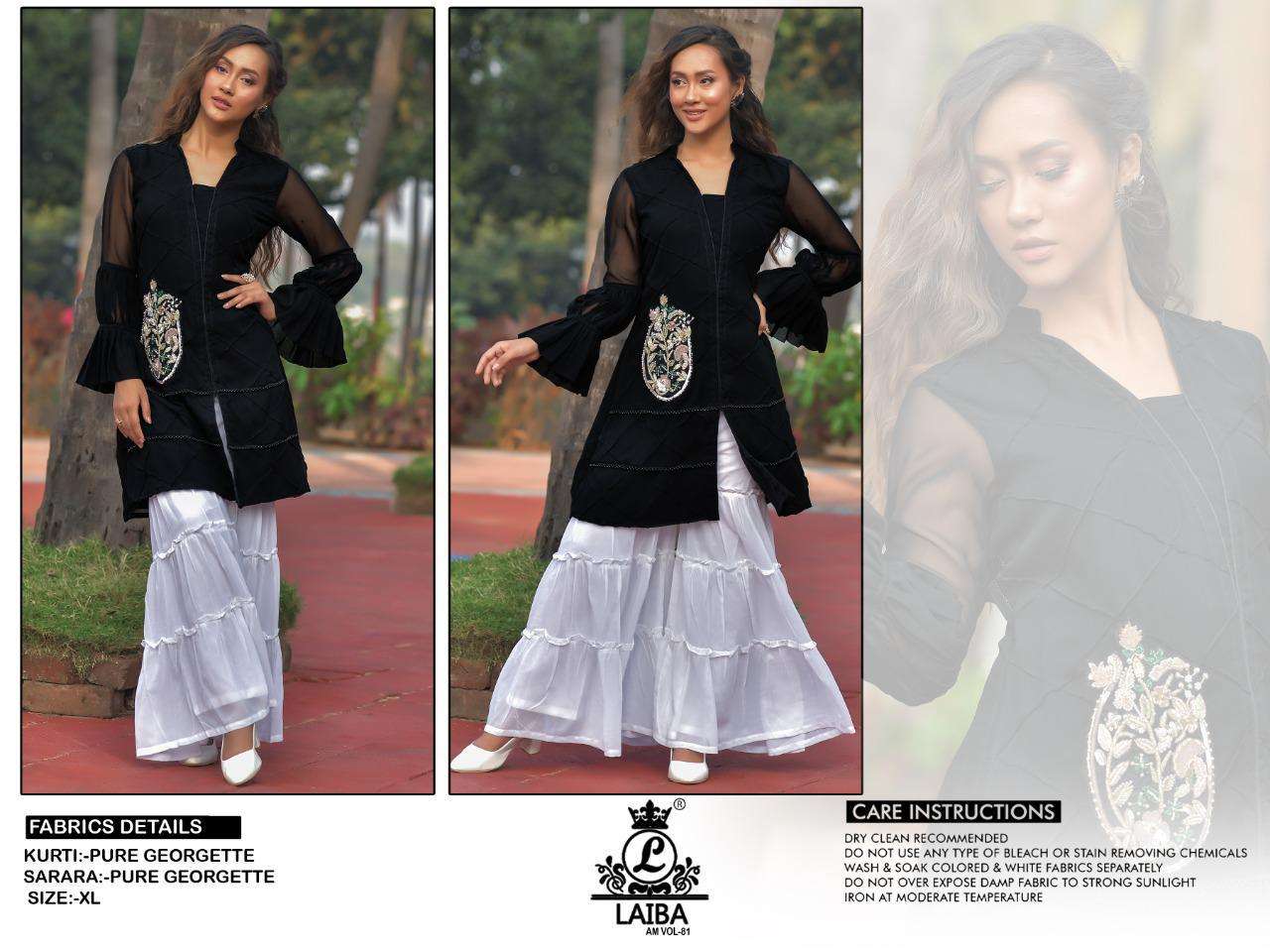 EXTRA-ORDINARY COLLECTION            ORIGINAL BY  LAIBA THE DESIGNER STUDIO        AM VOL-81 Description  Designer  Tunic with classy  HANDWORK  AND BEAUTIFUL STITCHING PATTERN & Paired with Designer  Georgette  Sarara Details Top:- Pure Georgette Inner :- Pure heavy santoon Sarara :- Pure Georgette Bottom inner:- Pure santoon Colour  BLACK  Size Chart  Top xl size chest (42) Bottom xl size (34-38) Rate 1599/-each       Colour may slightly vary due to light effect Very very Limited Stock      Dispatching ready |