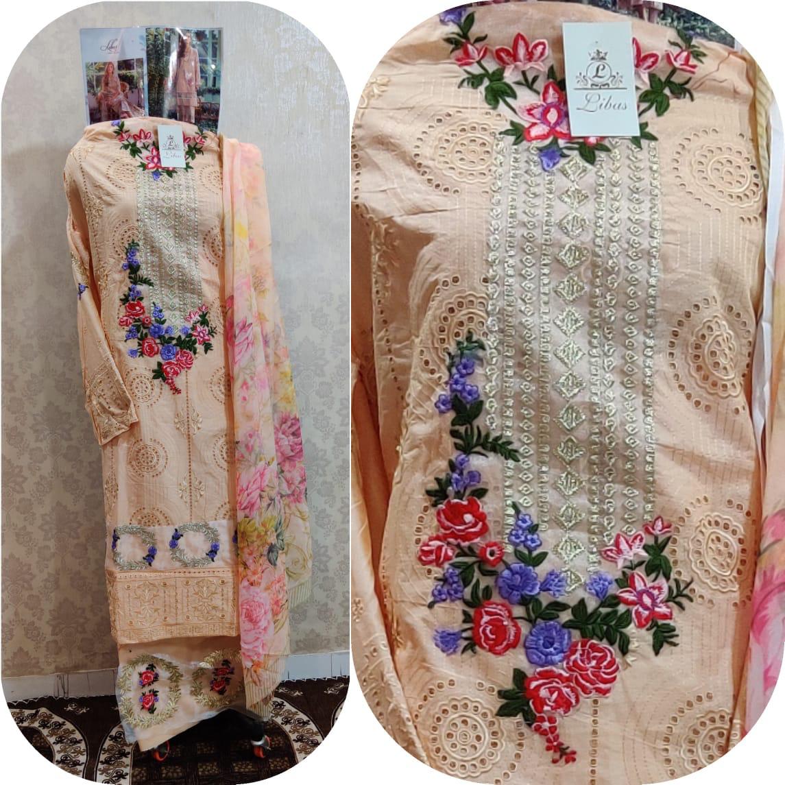 Look Formal yet Classy in our new Designer collection ➖➖➖➖➖➖➖ LIBAS LPC-05 ➖➖➖➖➖➖➖➖ BORING EMBROIDERY WORK 🔴 Details🔴 〰〰〰〰〰〰〰 ✨ Top:- Pure camric cotton with heavy embroidery ✨ Duppata:-Tabby silk with digital print ✨ Bottom :-Heavy lawn cotton ✨ Colour :- Light Peach ✨ Rate:-949+GST MINIMUM ORDER. 3 pcs 🔴Very very Limited Stock🔴 |