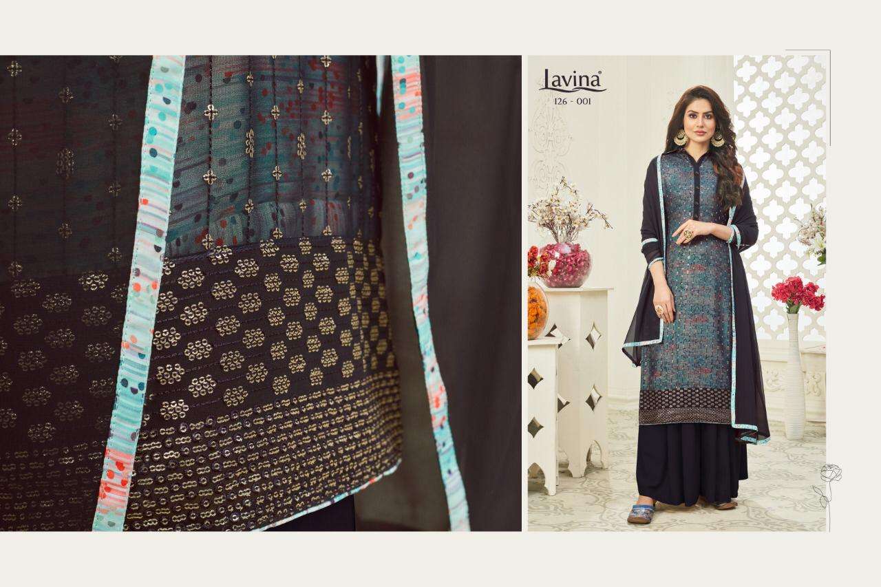 Lavina Vol 126 with square Top classic georgette seqvance Emboidery Innar sentoon digital prints Bottom sentoon dyed Duptta naznin chiffon Rate 1195 |