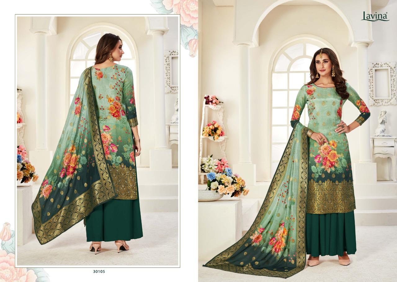Lavina vo 30 By Lavina . Top georgette Emboidery Bag georgette digital prints Bottom innar sentoon Duptta georgette with work Rate 1340 per Pcs . Set to set . GST 5 Percent Extra. Delivery 2 days |
