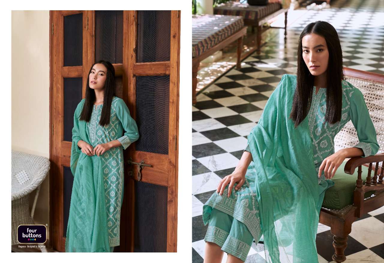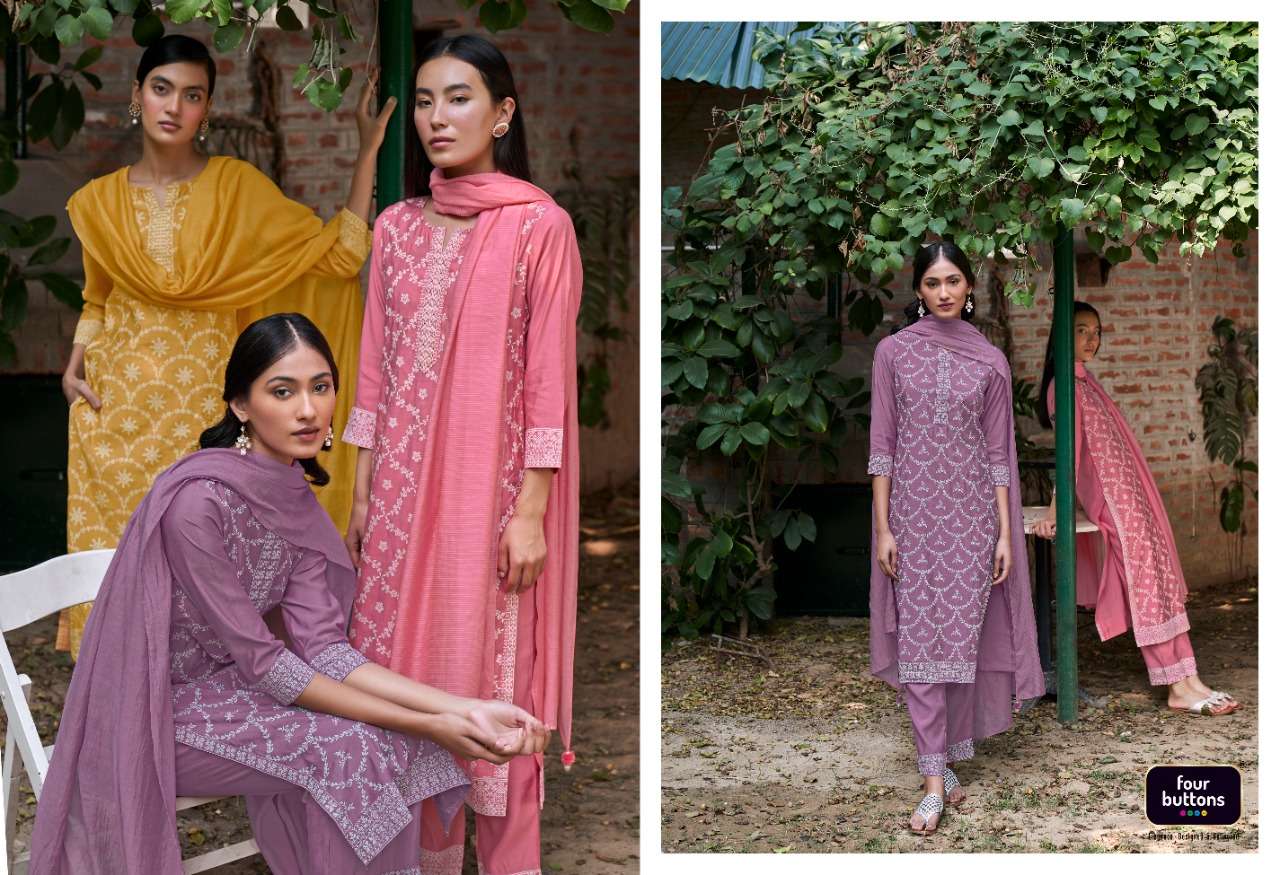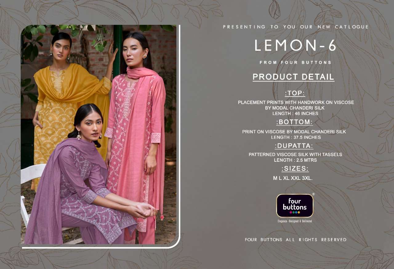 FOUR BUTTONS proudly launches its NEW collection 2023 "LEMON-6" FABRIC KURTI - PLACEMENT PRINTS WITH HANDWORK ON VISCOSE BY MODAL CHANDERI SILK BOTTOM - PRINT ON VISCOSE BY MODAL CHANDERI SILK DUPATTA- PATTERNED VISCOSE SILK WITH TASSELS RATE - Rs 1099/- per pcs SIZES - L, XL, XXL, 3XL |