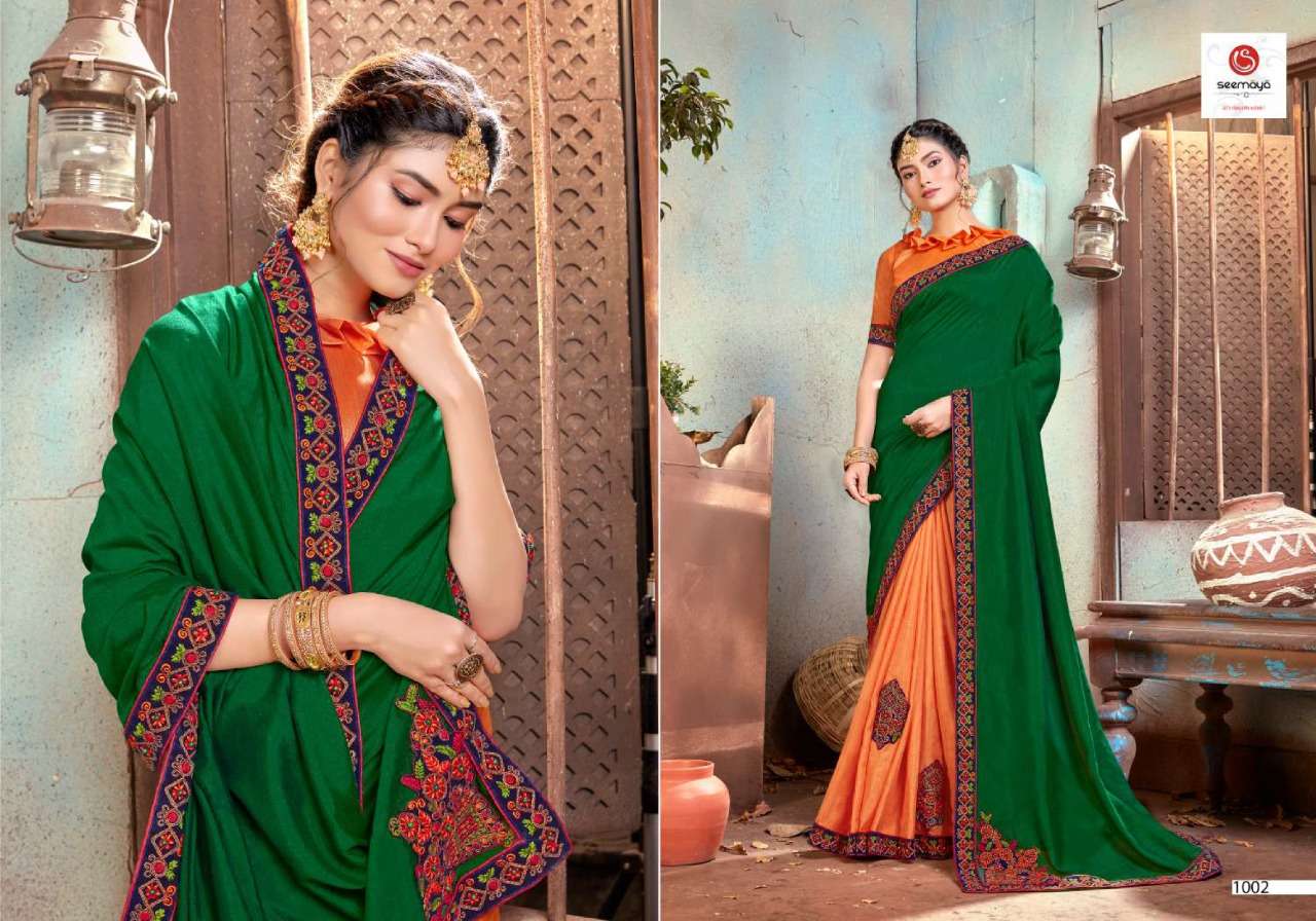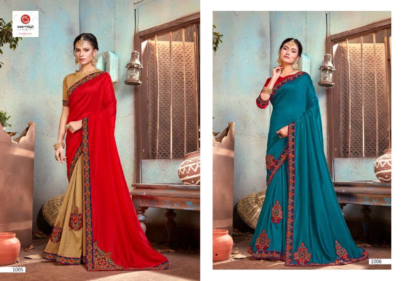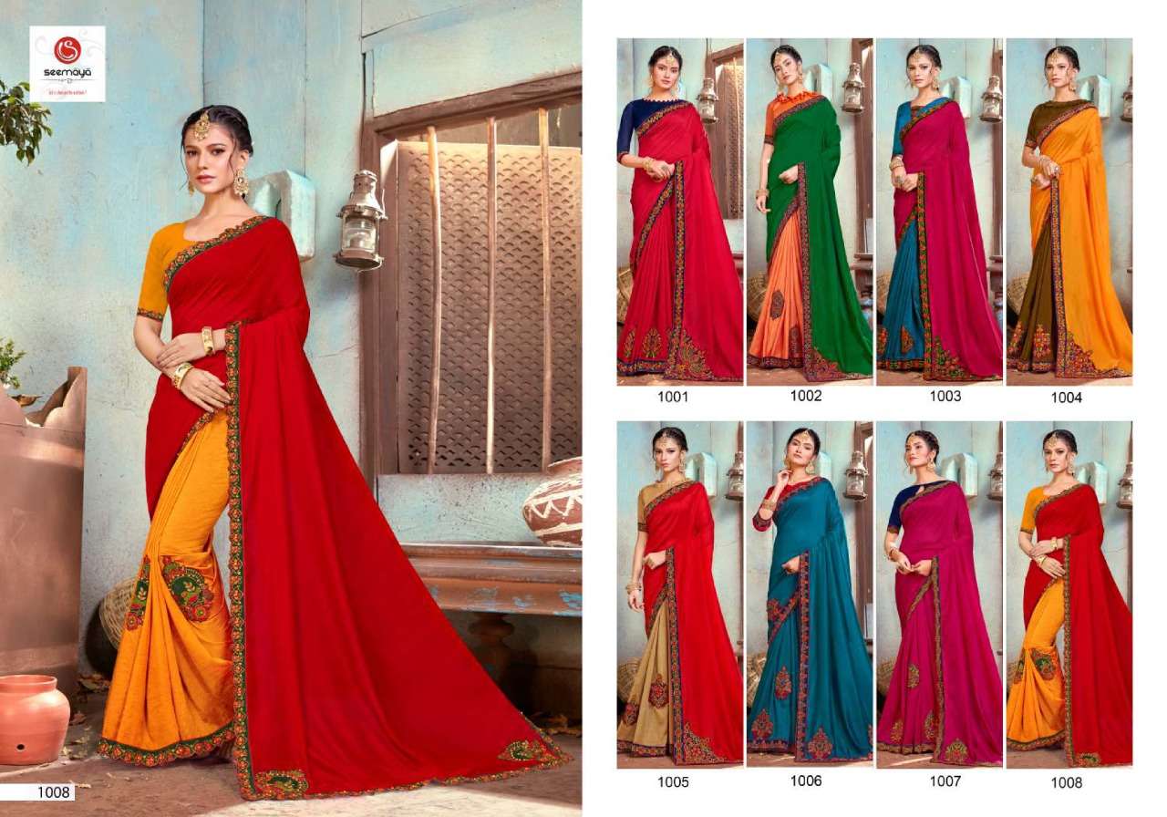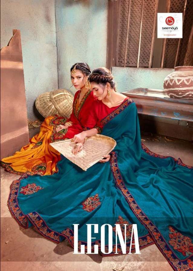 _NEW LAUNCHING _ LEONA Brand:- SEEMAYA Rate:- 820/- Fabric:- VICHITRA SILK BLOOMING FABRIC WITH FANCY WORK AND BORDER Total Designs:- 08 _Packing pcs :- set to set Matching :- SINGLE COLOR Cut :- 6/30 mtr |