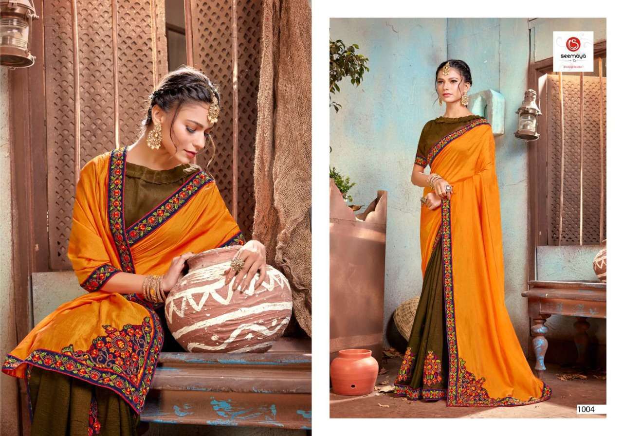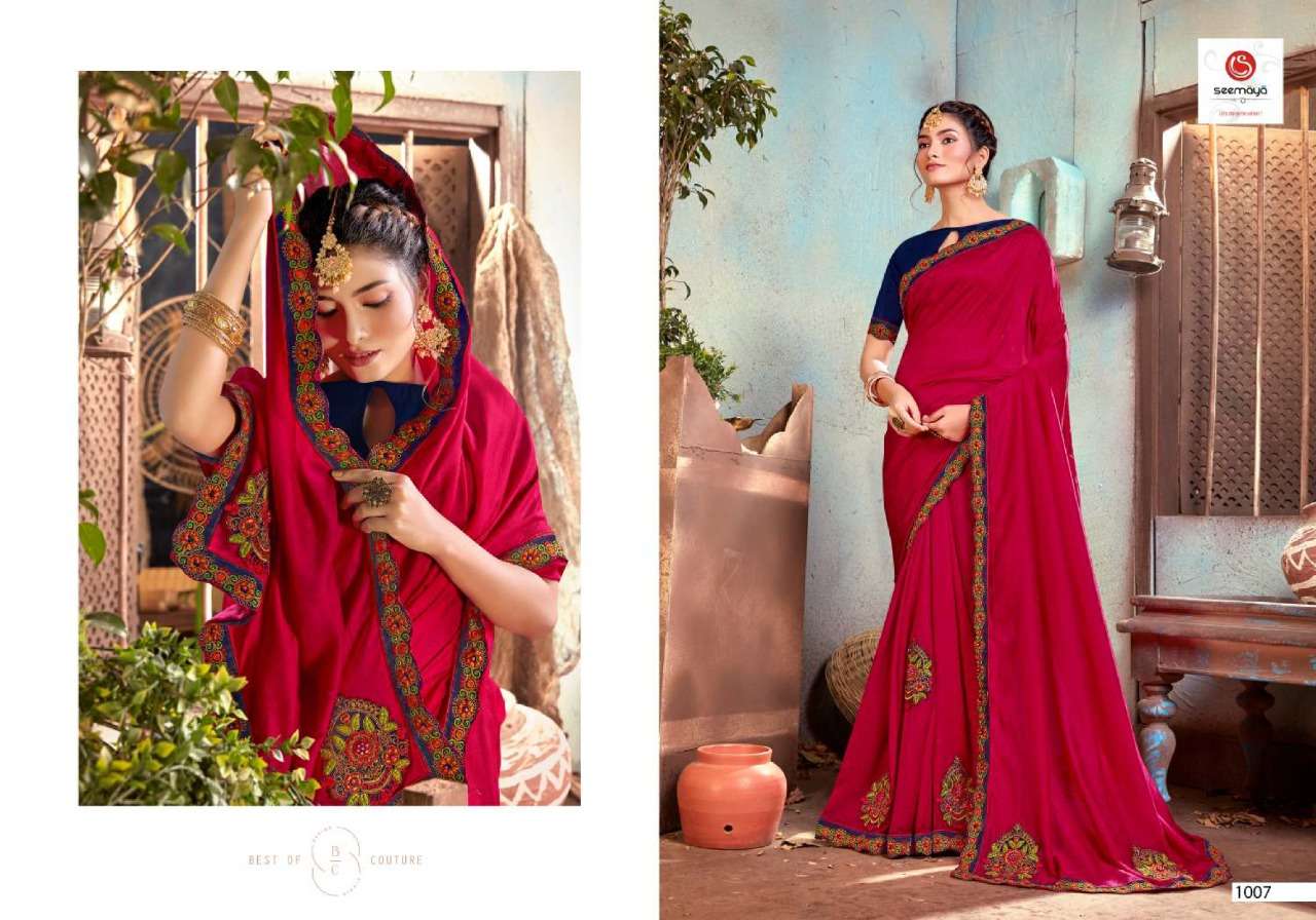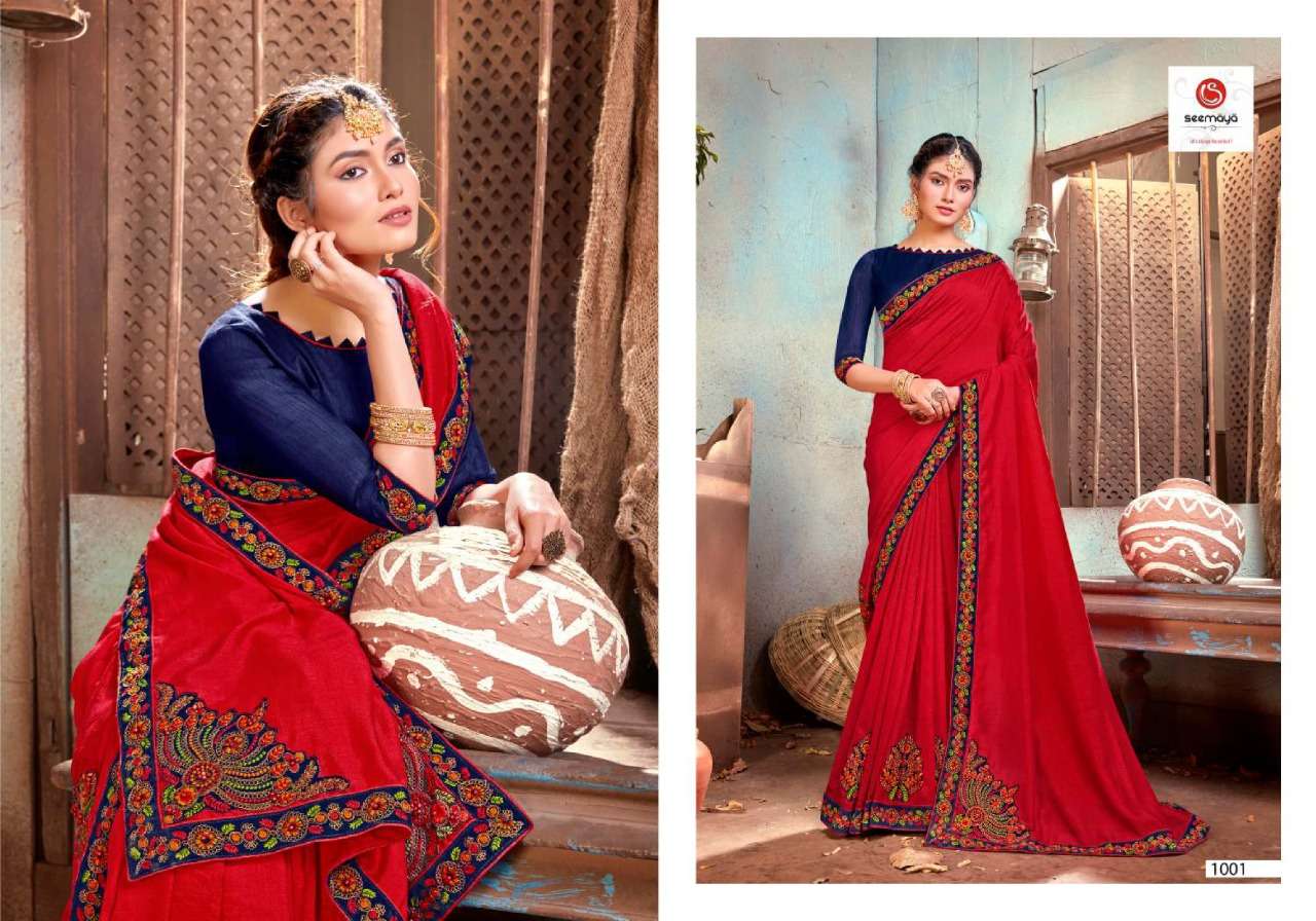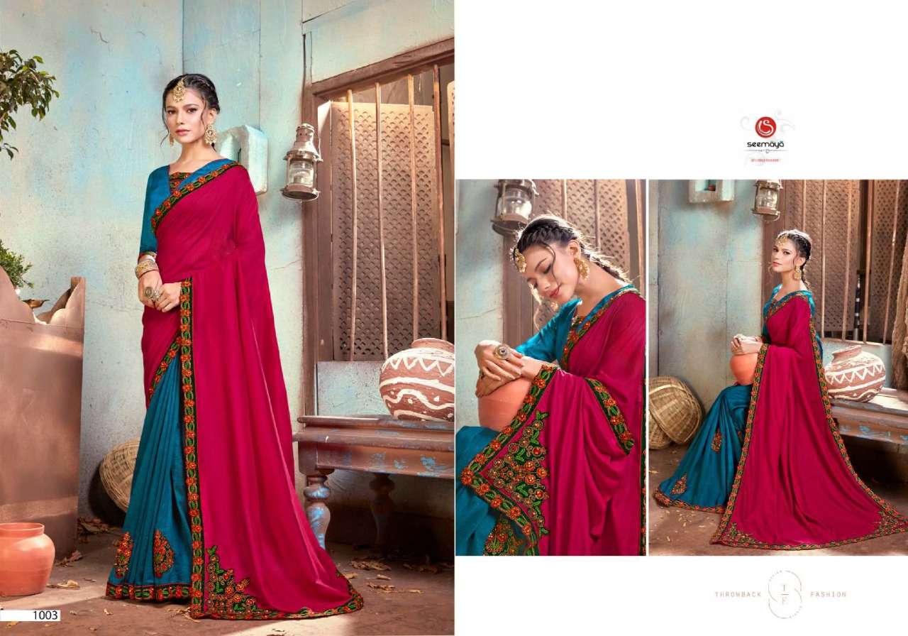 _NEW LAUNCHING _ LEONA Brand:- SEEMAYA Rate:- 820/- Fabric:- VICHITRA SILK BLOOMING FABRIC WITH FANCY WORK AND BORDER Total Designs:- 08 _Packing pcs :- set to set Matching :- SINGLE COLOR Cut :- 6/30 mtr |