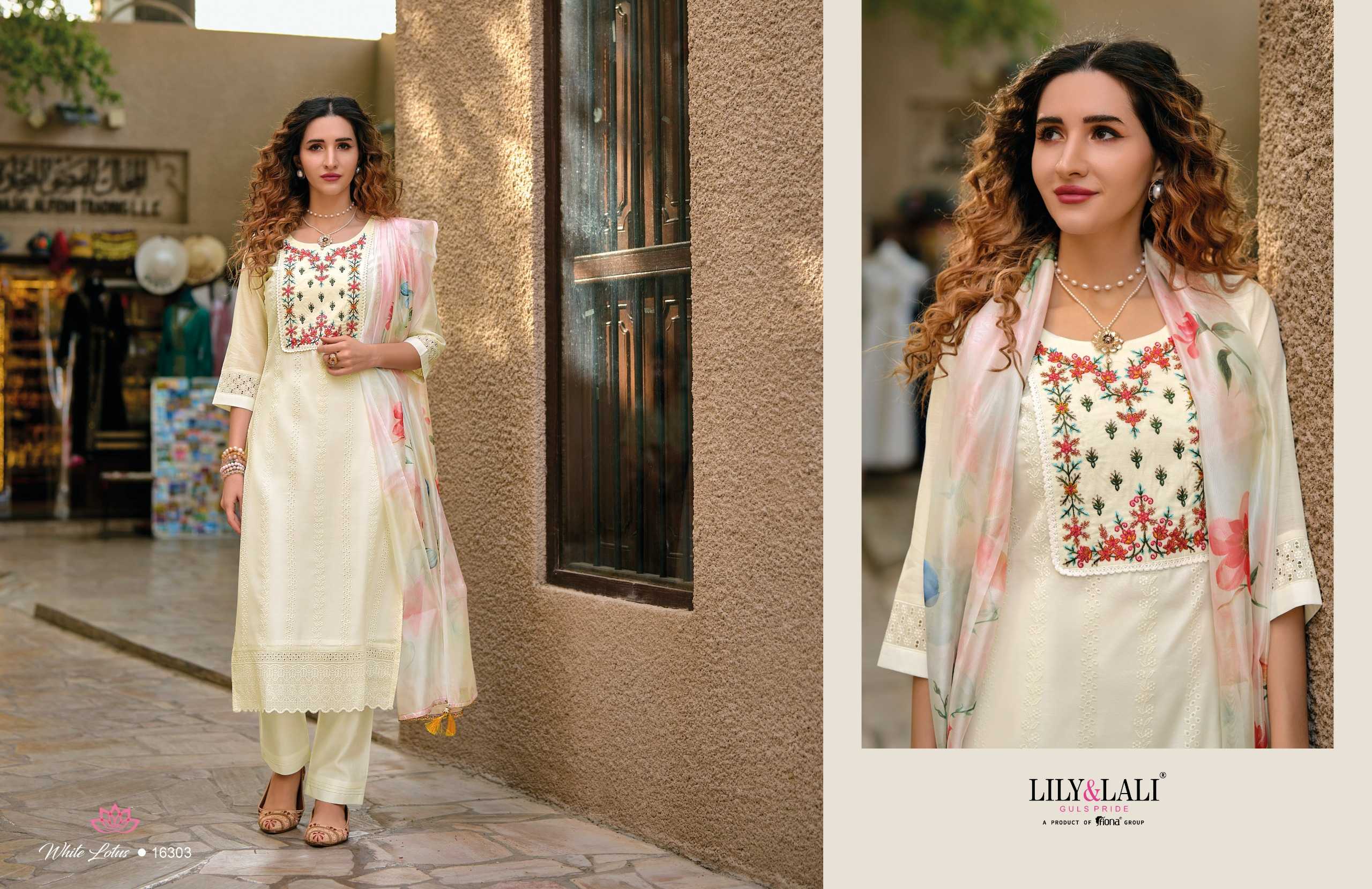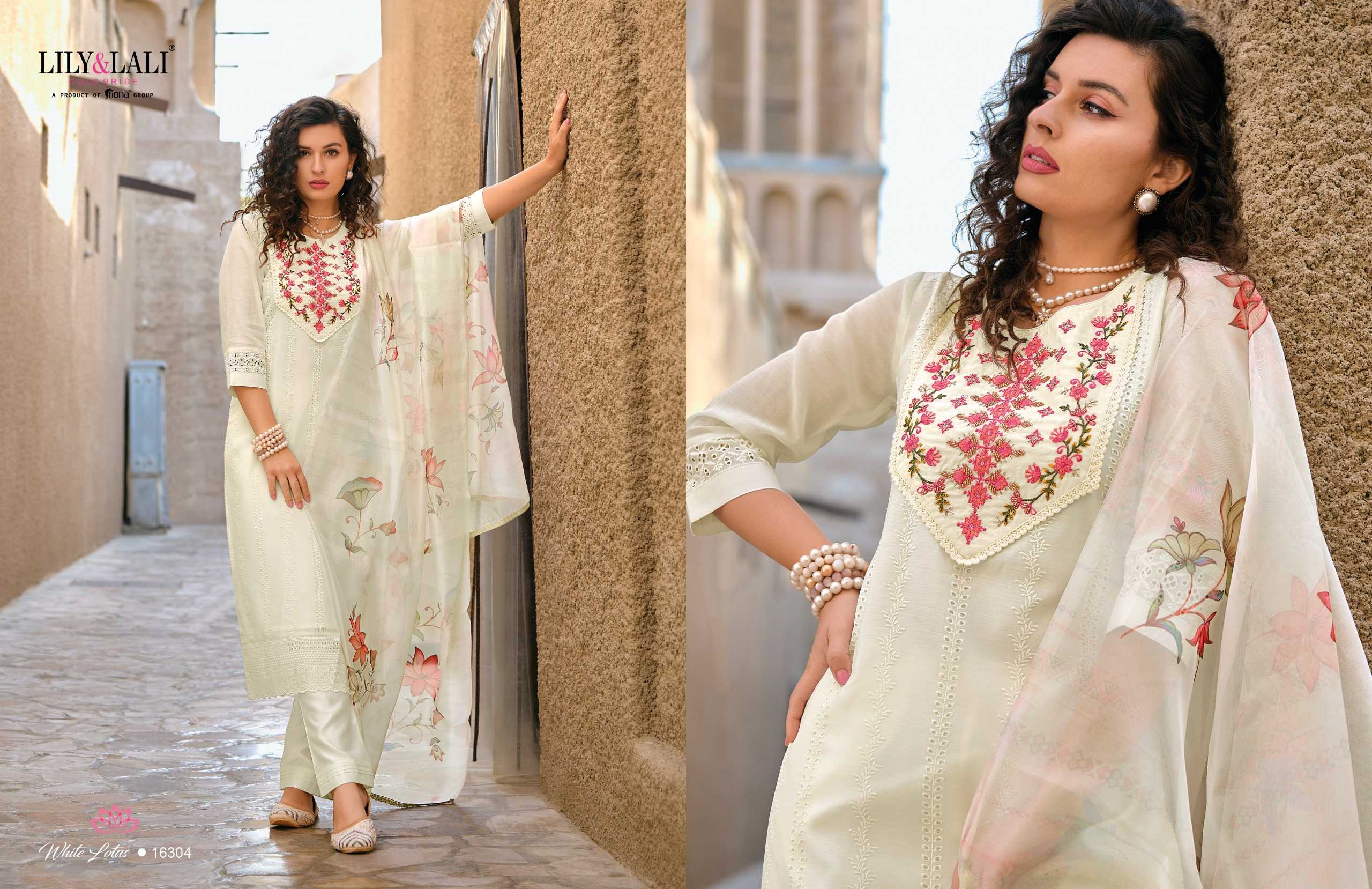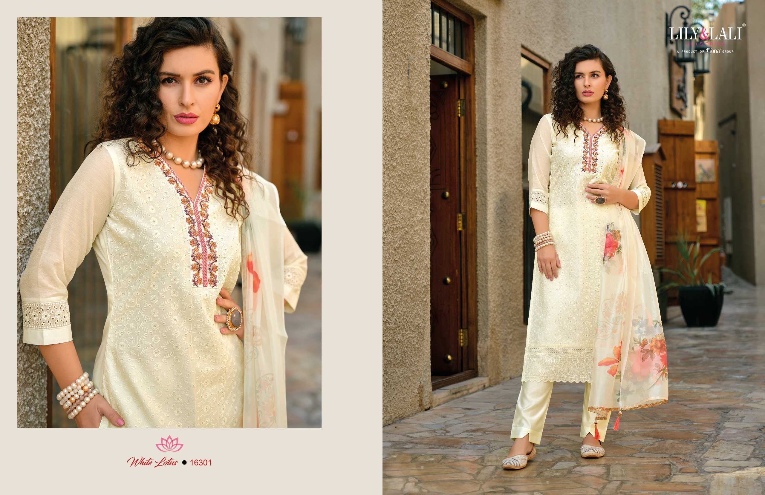 lily and lali white lotus readymade designer white special classy look kurti pant dupatta