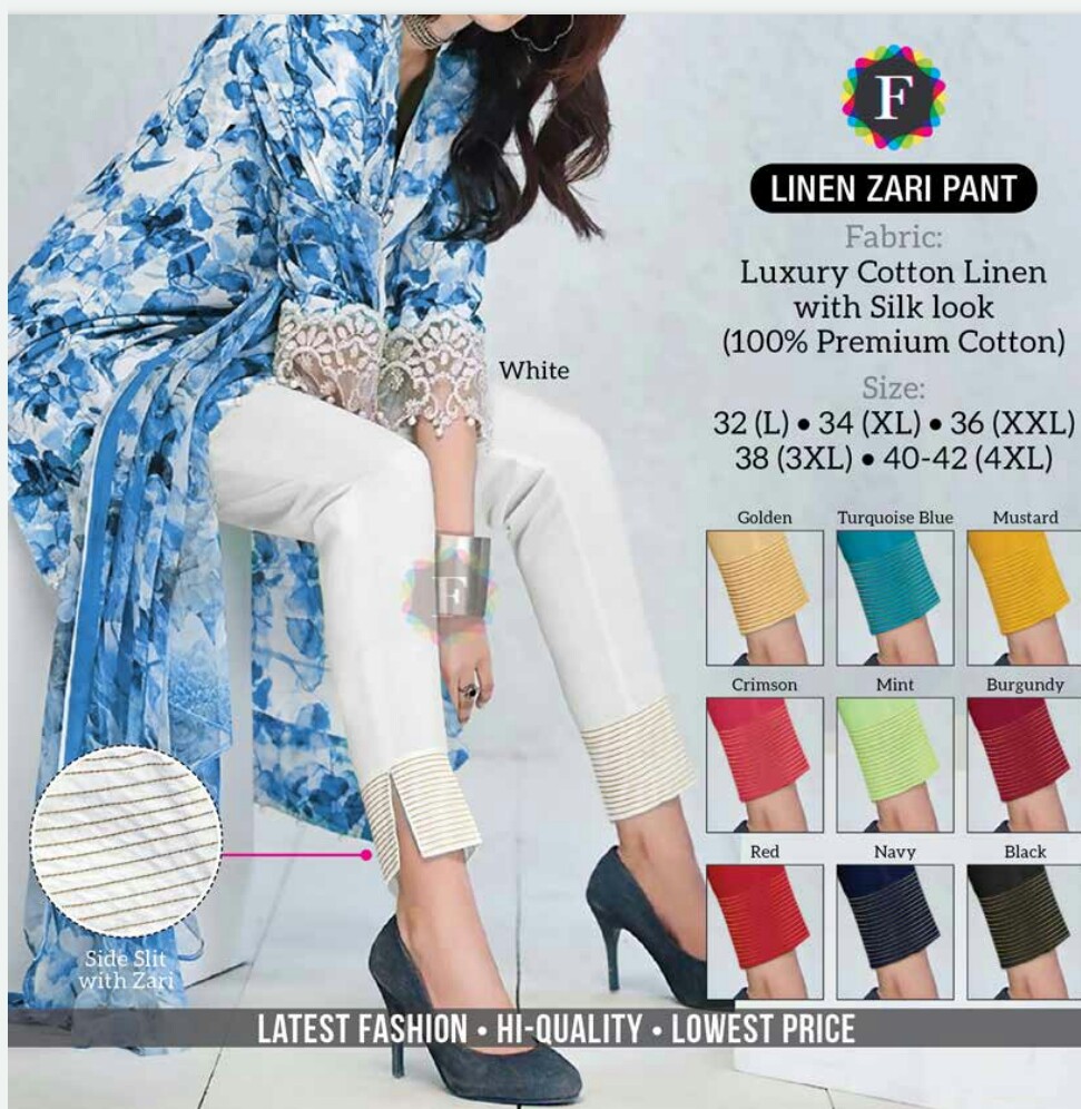LINEN ZARI PANT Fabric: Luxury Cotton Linen with Silk Look (100% Premium Cotton) Style: Ethnic USP: Side Slit with Zari Size: 32 (L) • 34 (XL) • 36 (XXL) 38 (3XL) • 40-42 (4XL) Available in 11 colours wholesale price ₹400/- ₹25 extra for (4XL Size) GST 5% EXTRA Happy Selling |