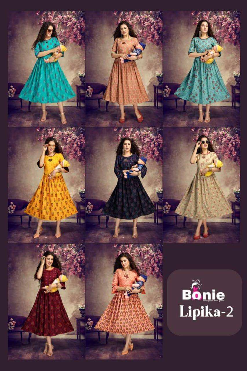 | Other Details | â â â â â â â â â â â â BRAND - Bonie Catalogue Name   LIPIKA vol.2 Details Fabrics & Style * - *HEAVY  RAYON 14KG PALIN AND color PRINT STYLE feeding top Size - XL, XXL,3XL Designs - 8PC's in a bag  Rate - RS. 465/- + 5%GST Booking Started |
