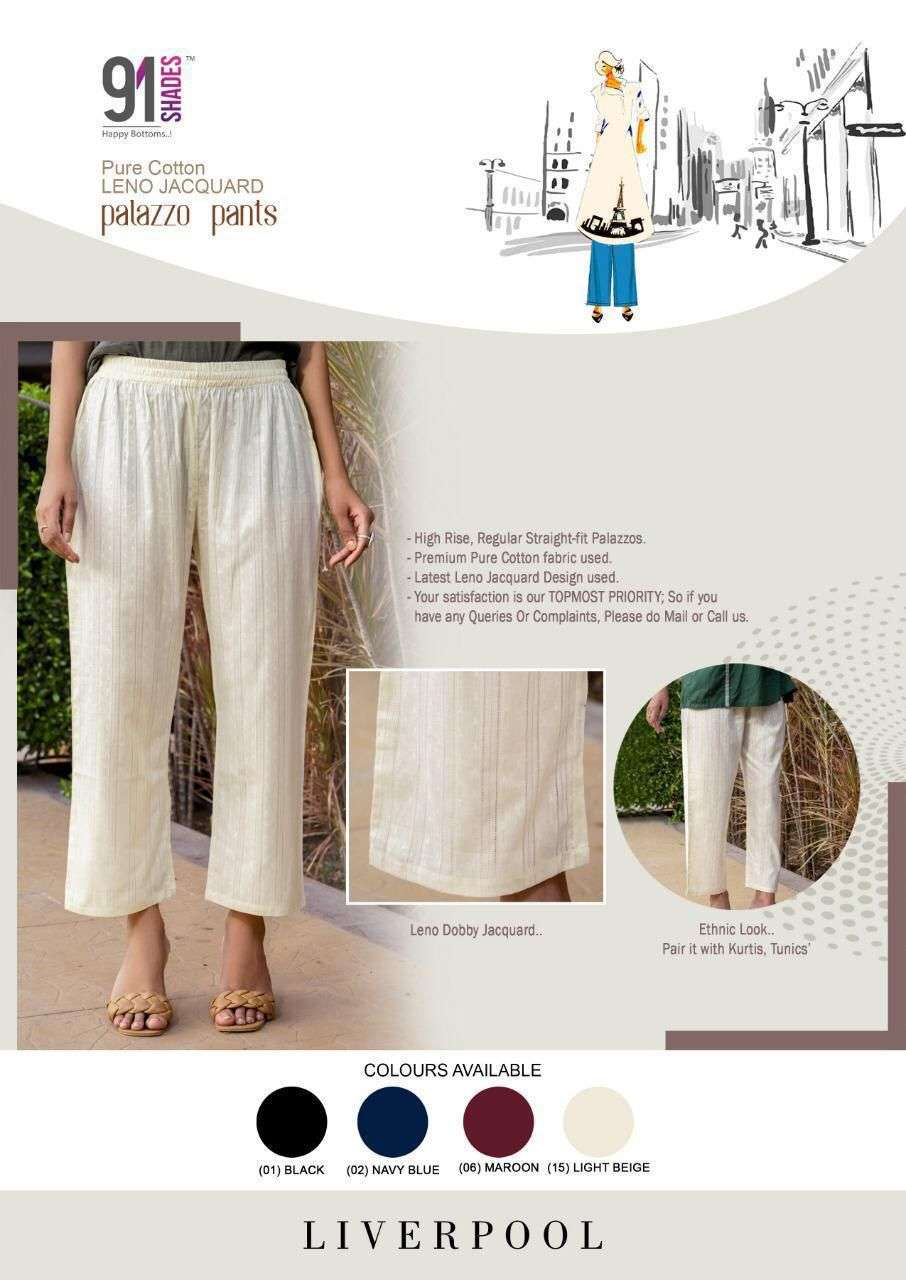 Brand - â91SHADESâ Item - BottomWear Itemname - LIVERPOOL Desc. - Leno Jacquard Palazzo Pants Fabric - Â Pure Cotton (Woven) Colours - 4 Sizes - 3 sizes-> S/M ,L/XL , 2XL/3XL RATE @ 285/- #Kindly Note that Sizes are Optional & Colours Compulsory. Â |