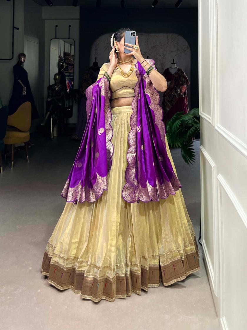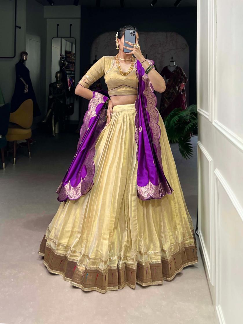 🌷Lehenga choli🌷 An heirloom in motion – the Paithani way 💜 LNB2012CRM Lehenga (Stitched) Blouse (Unstitched) Dupatta Package contain : Lehenga, Blouse, Dupatta Weight : 1.300 kg Rate : 1450/- |