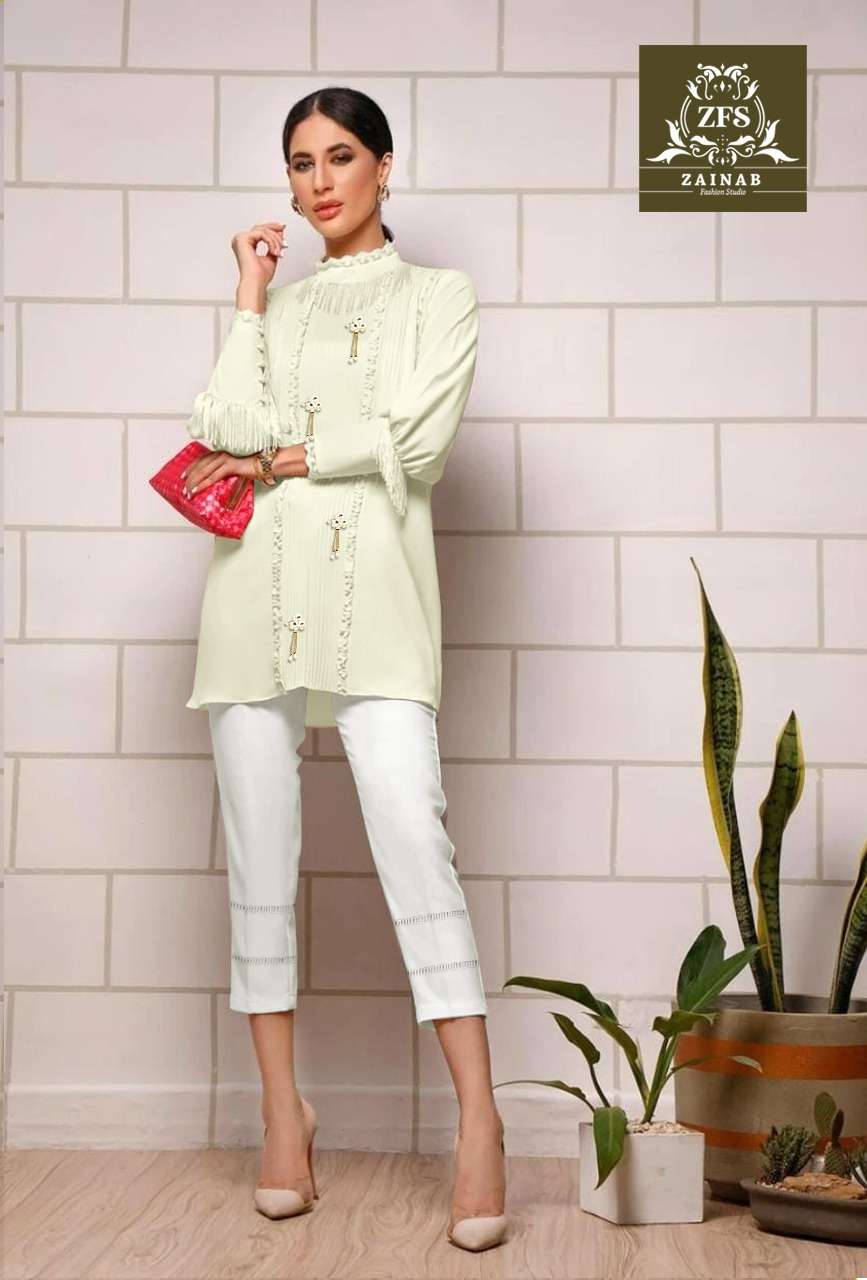 Formal Classy Collection   (LPC :-103) Look Formal yet Classy in our new Designer collection         Present by    ZAINAB FASHION STUDIO Description  Designer Luxury Tunic with beautiful classy Flower Work  With Lace Work & Classy Fril Work paired with Designer  Stylish Cigrate pants With Lace Work Fabric Details Top:- Pure Georgette Pant:- Pure Cotton Strachable Colour :- 01     (1) pearl Of White     Size Chart  Top XL size chest (42) Bottom Waist Xl Size (36-42) Top Length(38) Bottom Length(38/39) Rate:- 1050/- Colour may slightly vary due to light effect Despatching At Tomorrow |