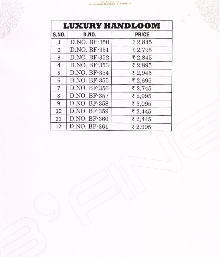 CATALOUG NAME – LUXURY HANDLOOM SERIES – BF- 350 TO BF- 361 TYPE - SAREE FABRIC – BANARASI SILK JECORD GST 5 Percent Extra. Delivery - 4-5 Days |