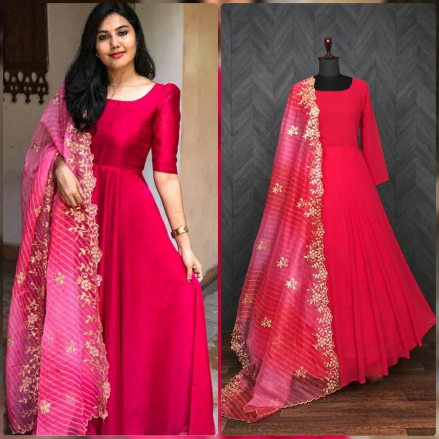 💃🏻PREMIUM DESIGNER GOWN COLLECTIONS💃🏻 💖#Gown This Pink beautiful flaired with Half sleeves gown comes along with cotton lining and Organza Printed With Embroidered Cutwork dupatta. GOWN :- 👇 DUPATTA :-👇 PACKAGE CONTAIN :- Gown,Dupatta COLOUR :- 1( Rani ) WEIGHT :- 0.520 KG BEST RATE :- 599/-₹ |