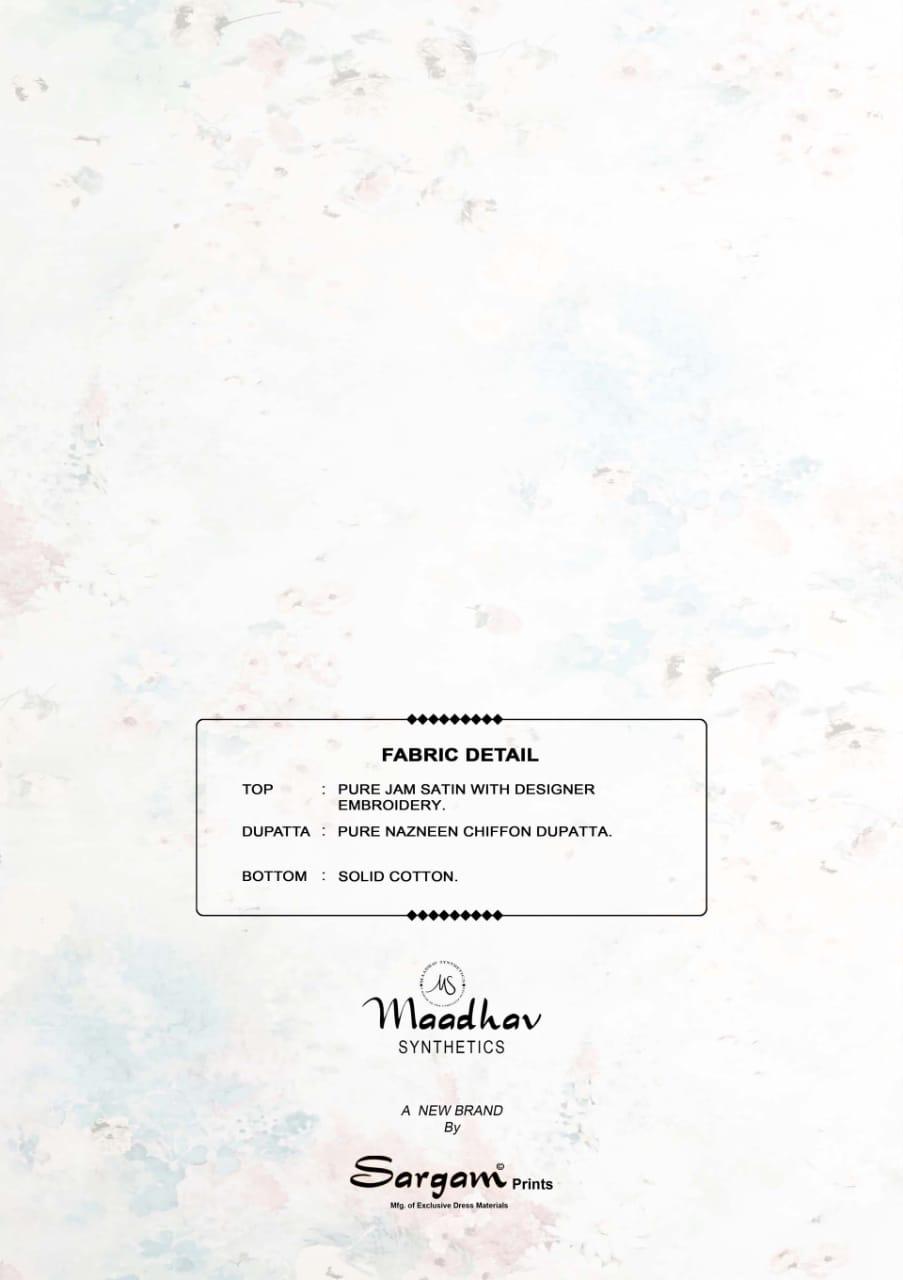 Maadhav Presents ELITE Fabric Details Top: PURE ZAM NAGETIVE PRINTS WITH DESIGNER WORK Bottom :SOFT COTTON Dupatta: NAZNEEN PRINTED Designs: 8 PCS Rate: ₹585 per Pcs . Set to set GST 5 Percent Extra. Delivery 3 days HSN CODE: 5407 Regards Sargam Prints |