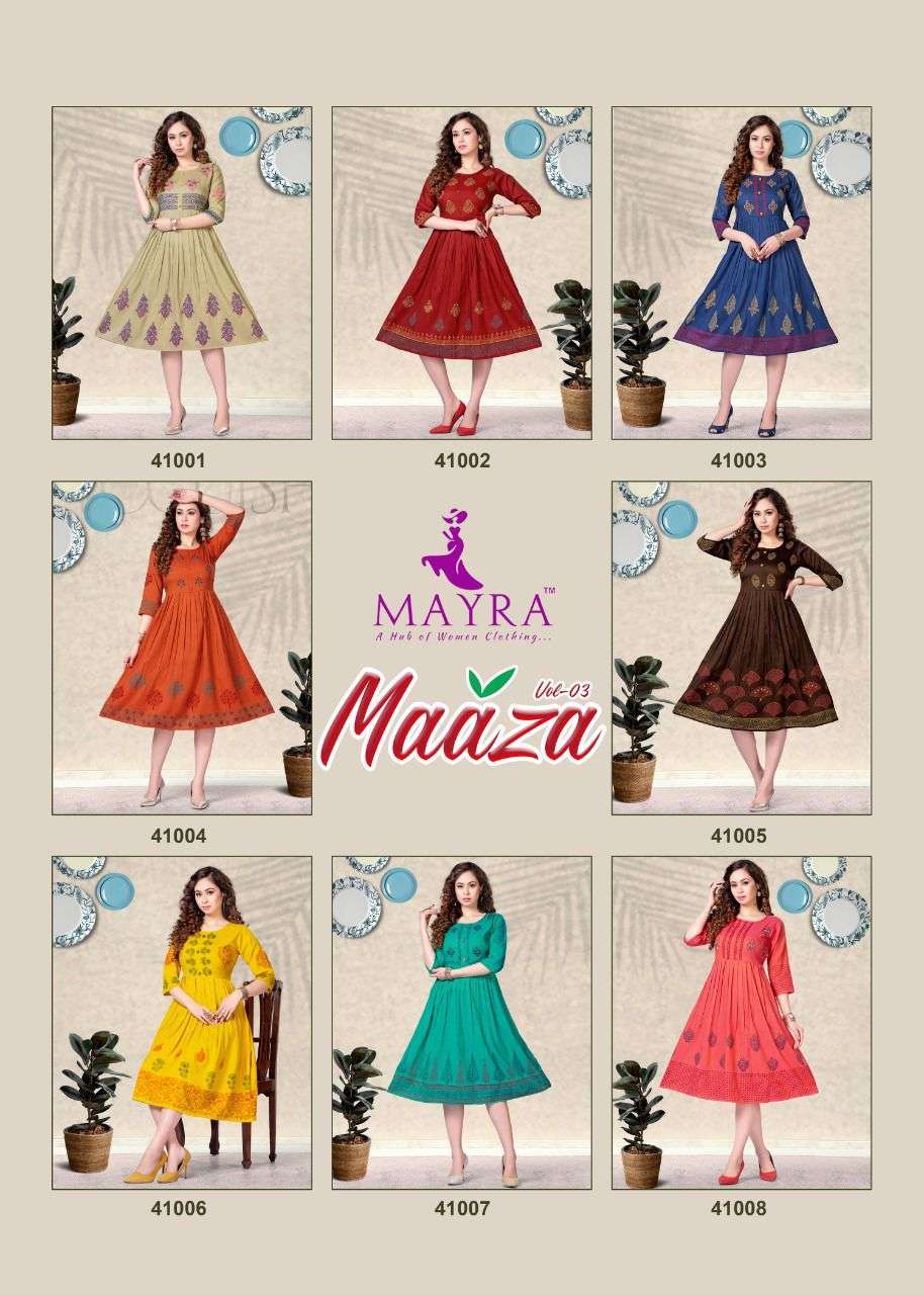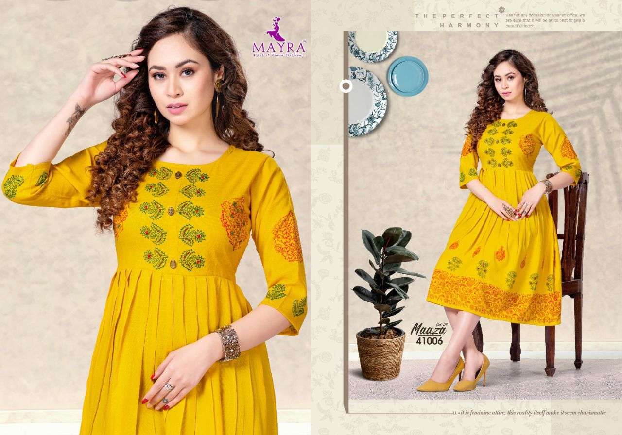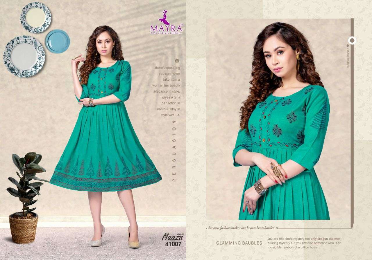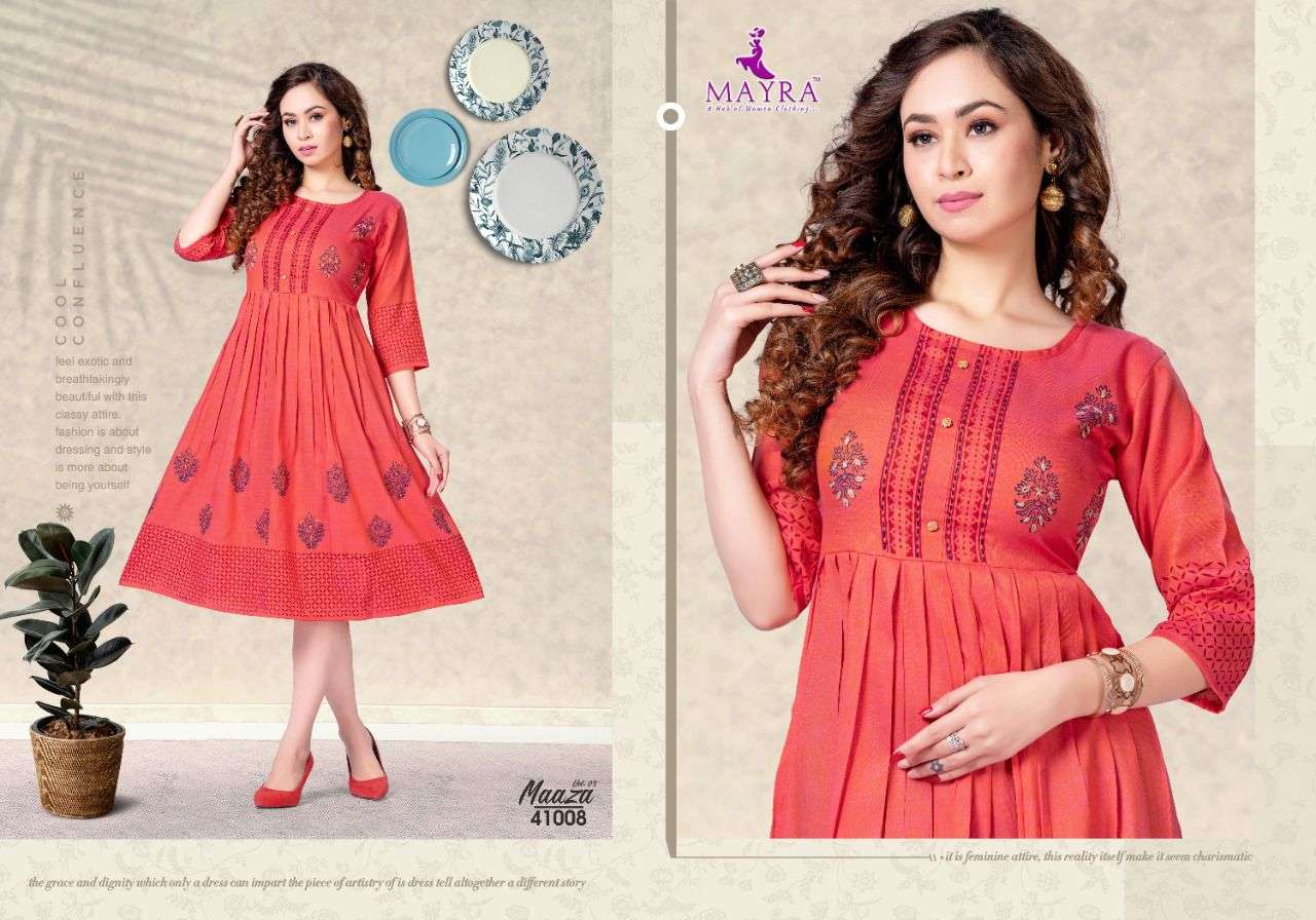 MAAZA Vol-3 BY MAYRA HEAVY RAYON 2 TON WITH Hand work and block and screen work KURTI CATALOG WHOLESALER BEST RATE