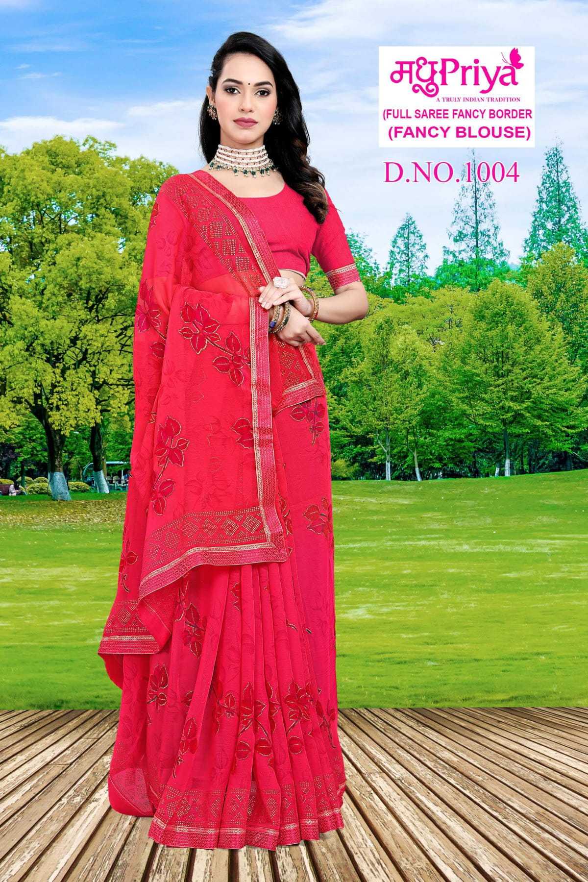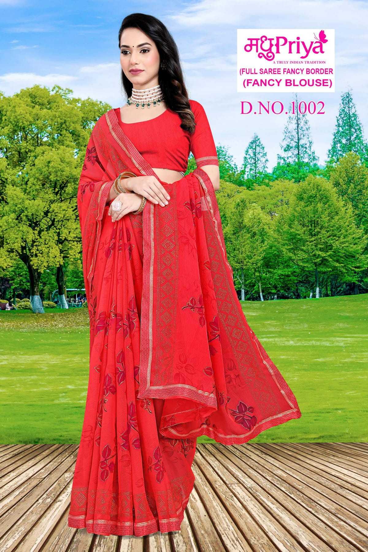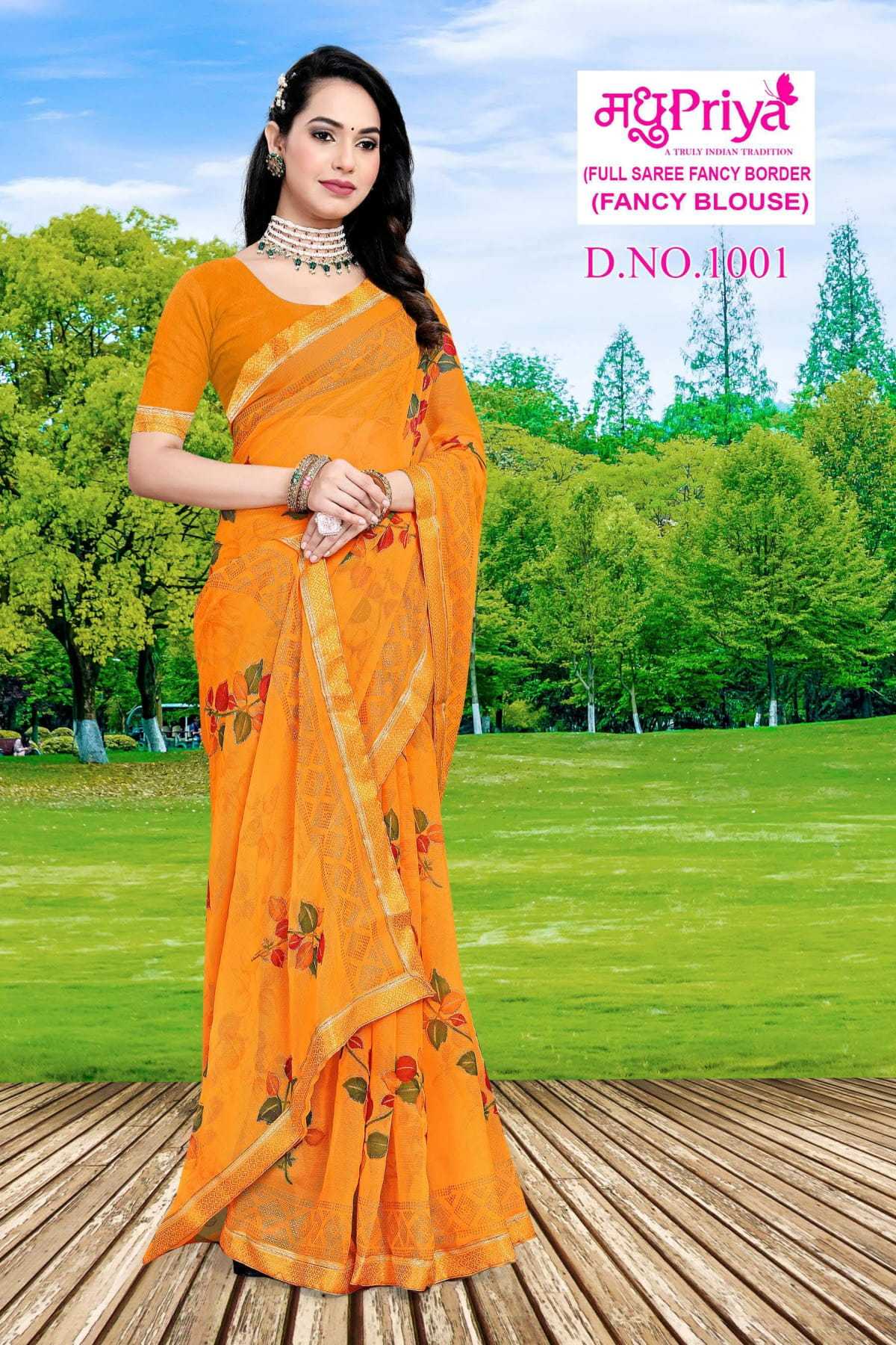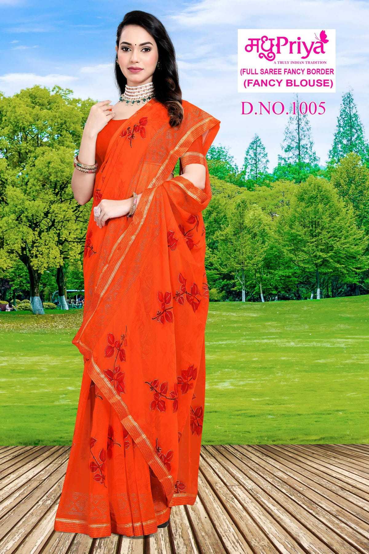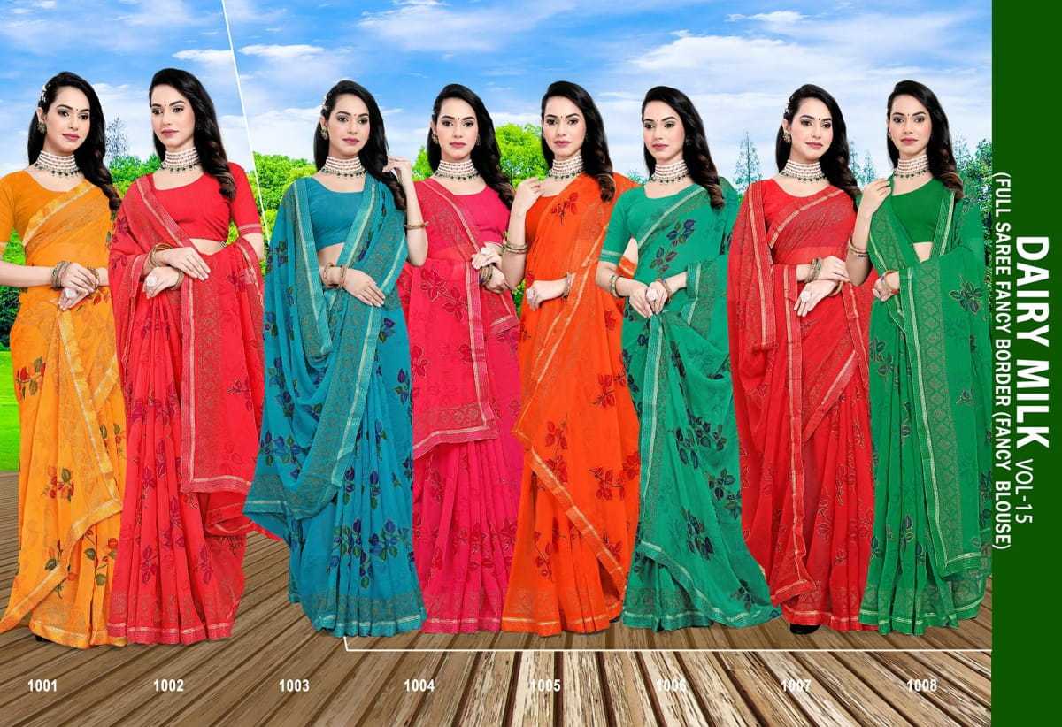 madhupriya dairy milk vol 15 fancy print jari work unique saree with blouse