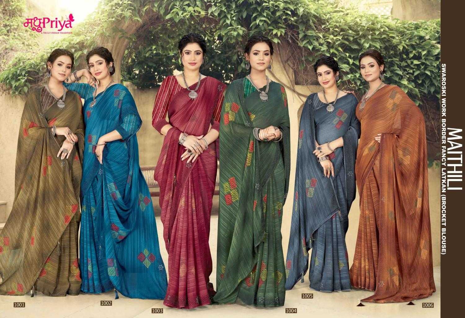 MADHUPRIYA WEIGHTLESS PATTREN FANCY PRINT WITH FULL SAREE PAIPING+ HEAVY SWAROSKI WORK BORDER WITH FANCY BROCKET BLOUSE RATE 420/- |