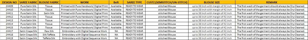 ♻ OUR NEW READY-TO-WEAR DESIGNER SAREE COLLECTION ♻️ BRAND NAME : MAHOTSAV CATALOG NAME : "MOHMANTHAN 24400 SERIES ADAH PRICE :- FABRIC DETAILS : ATTACHED BLOUSE TYPE : STITCHED (SIZE : UP to 38 Inch with margin of 42 inch) SAREE TIME : READY TO WEAR(ONE MINUTE SAREE) |