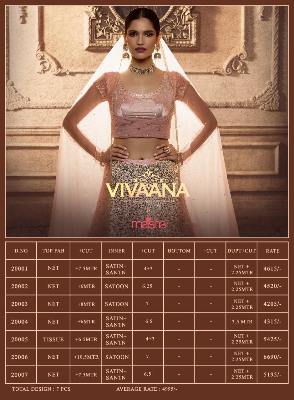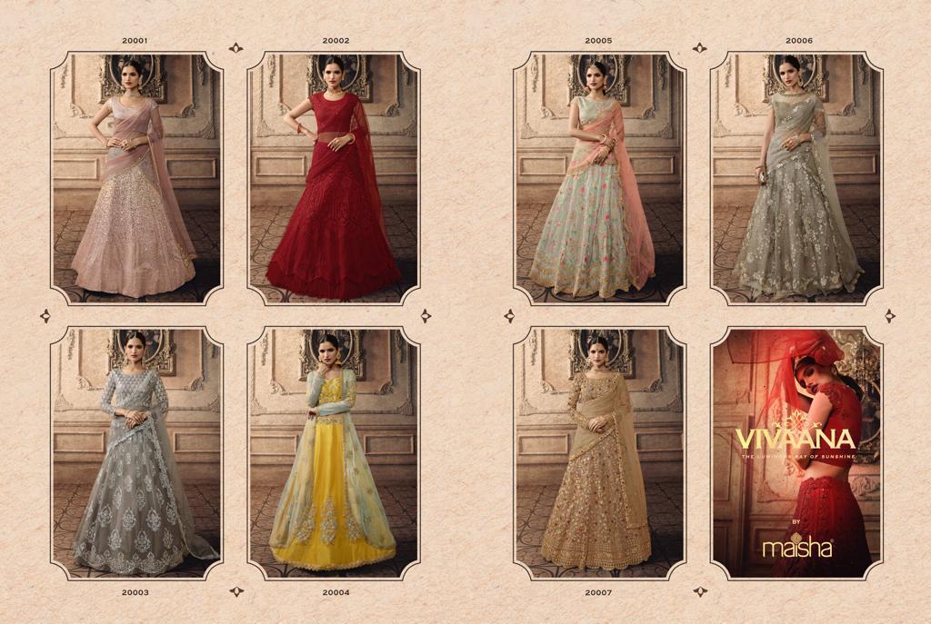Brand - Maisha Maskeen. Type - Lehenga . Catlog Name - VIVAANA . Series -20001 to 20007. GST 12 Percent Extra. Delivery 7 days . Book your order |