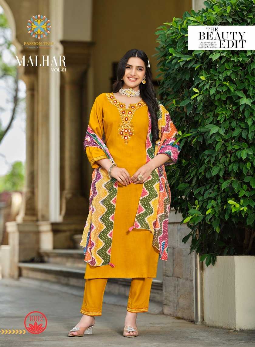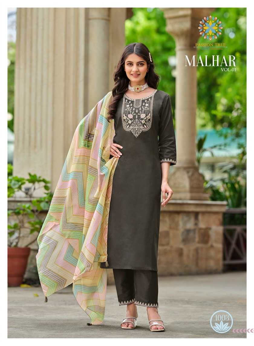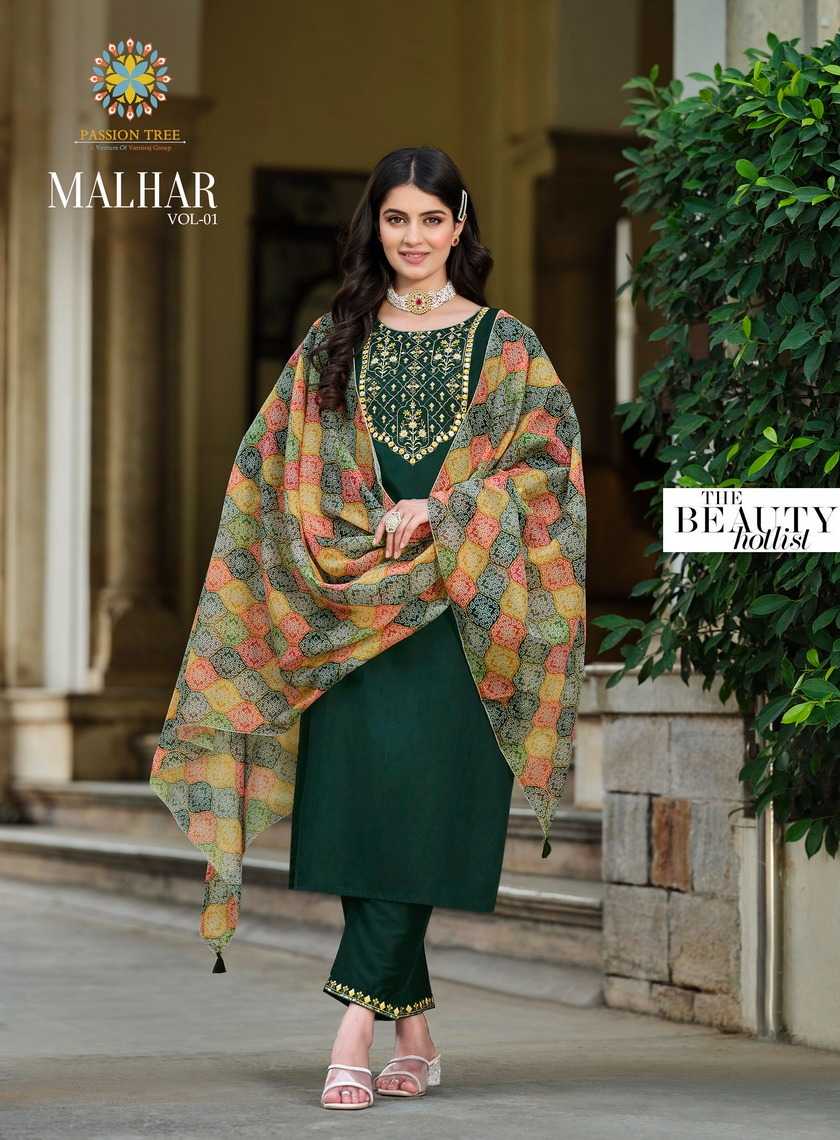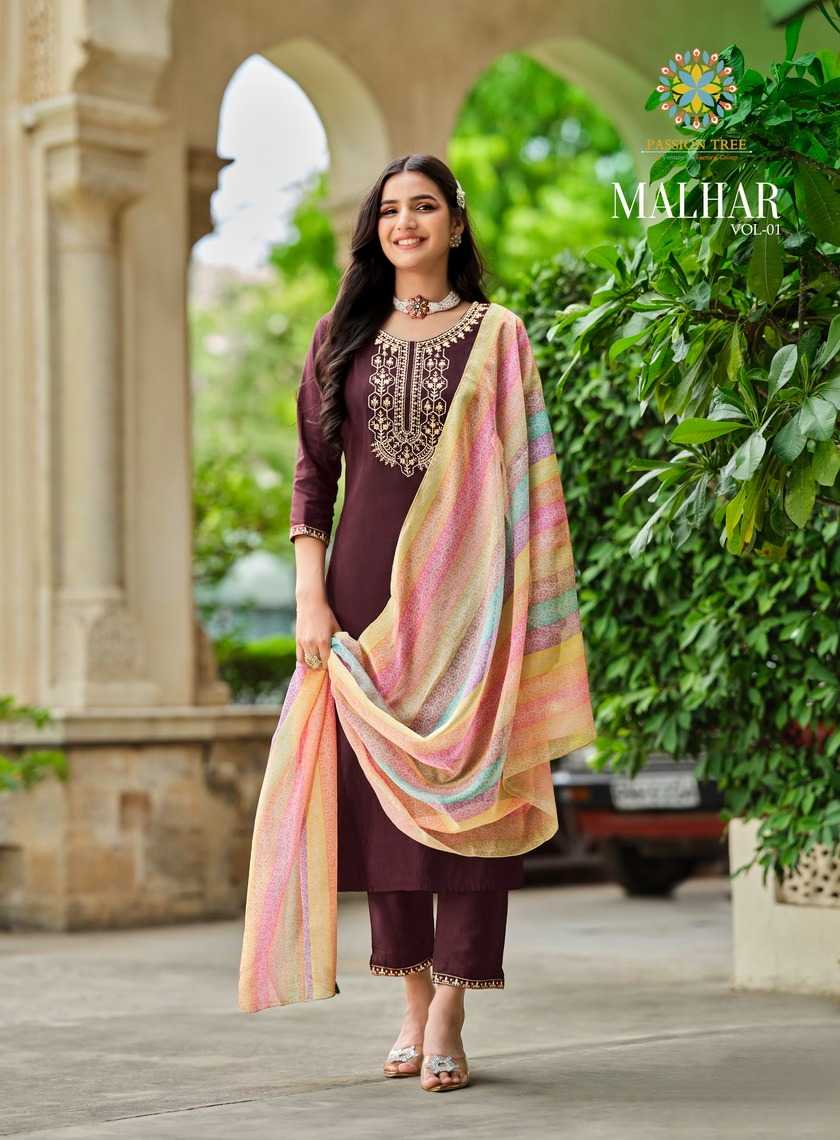 malhar vol 1 by passion tree full stitch stylish roman silk straight kurti with pant & dupatta