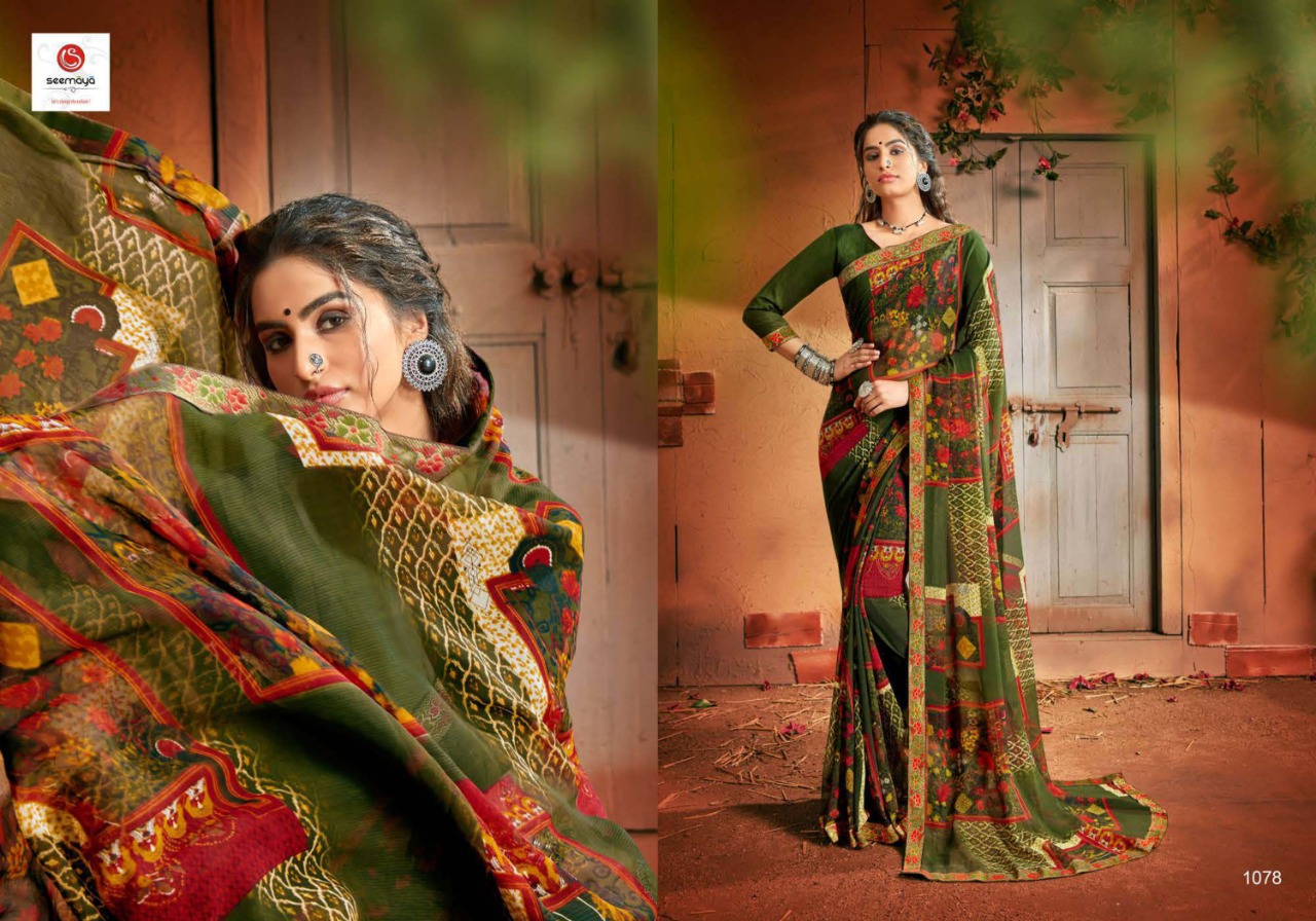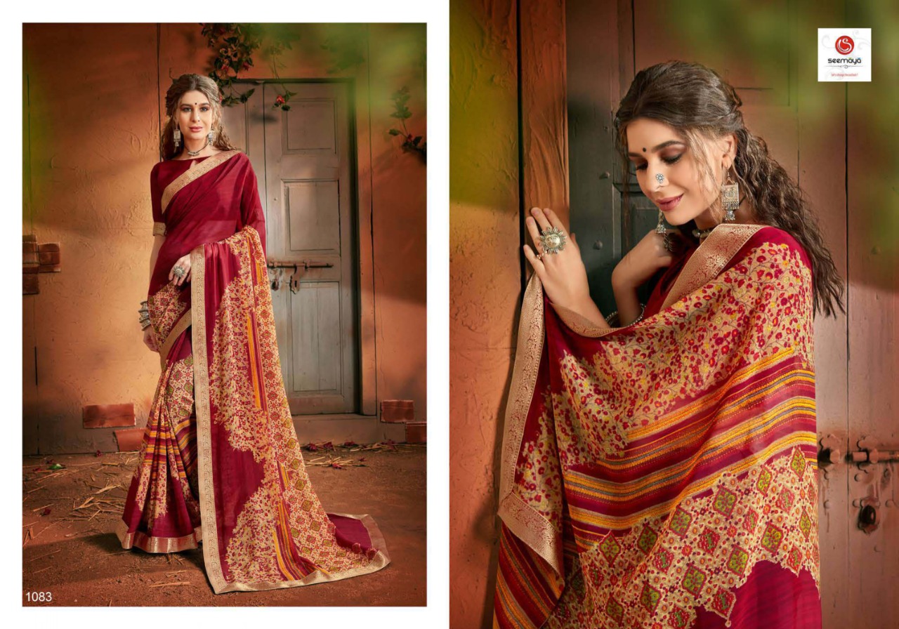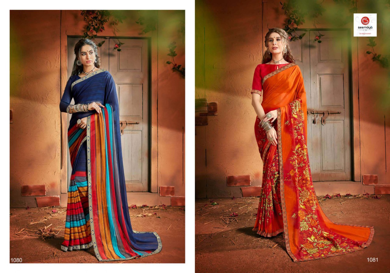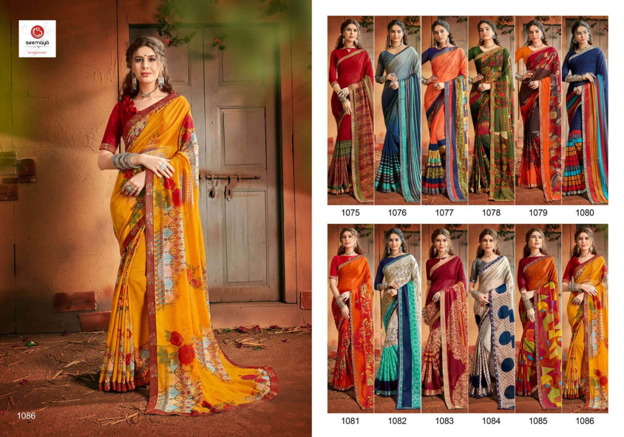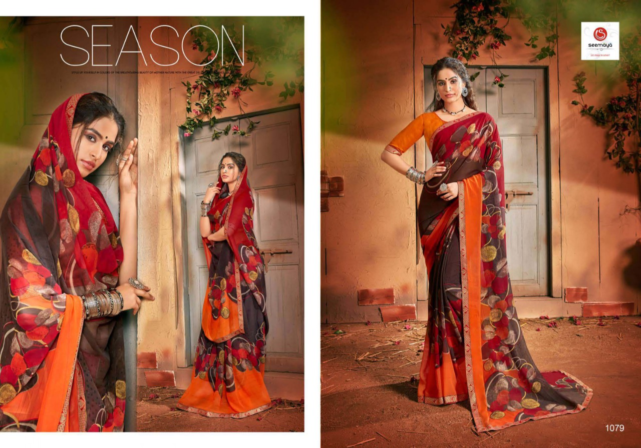 _MALINA Brand:- SEEMAYA Rate:- 360-/ Fabric:- FANCY GEORGATTE FABRIC FANCY PRINT WITH BORDER Total Designs:- 12 _Packing pcs :- set to set Set to set Matching :- SINGLE COLOR Cut :- 6/30mtr |