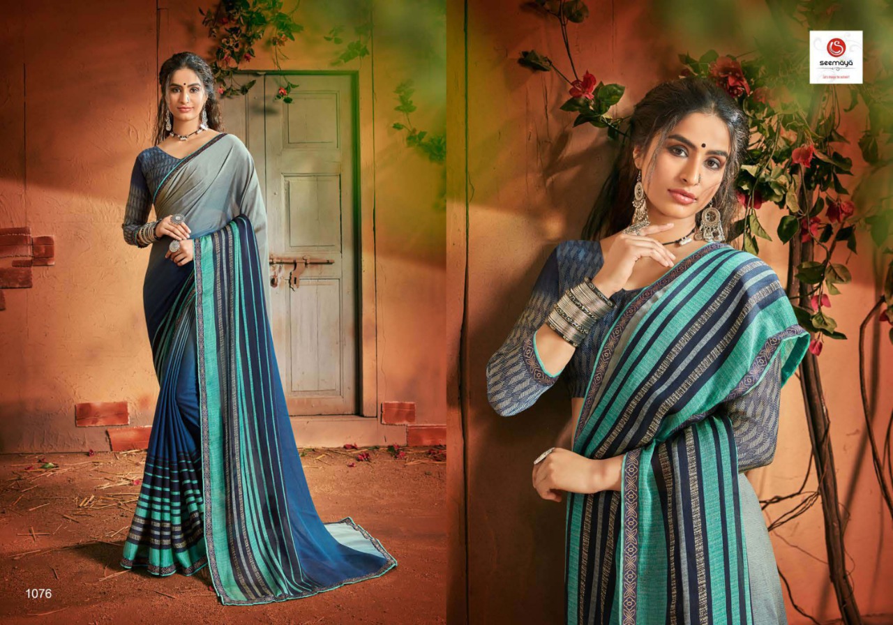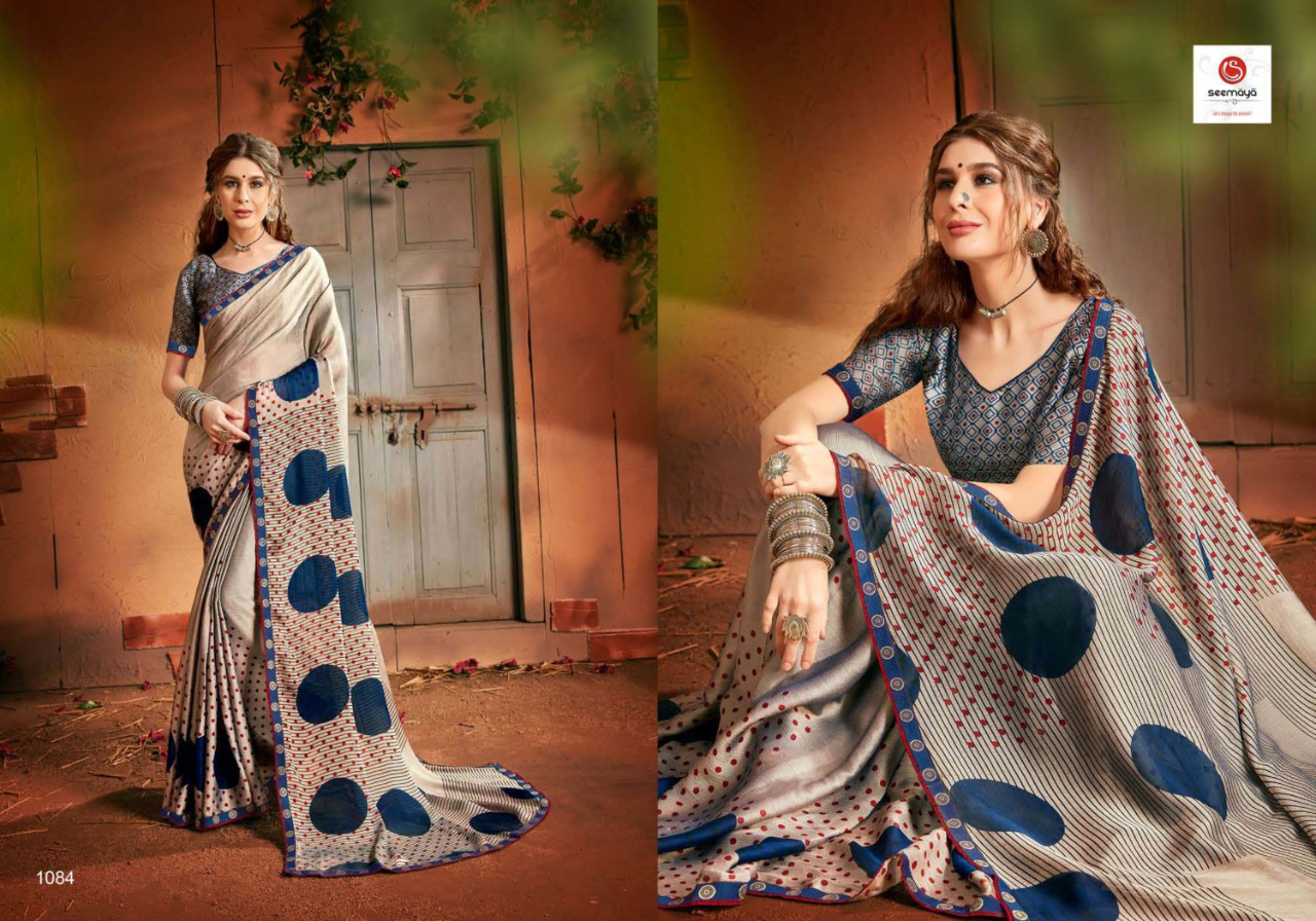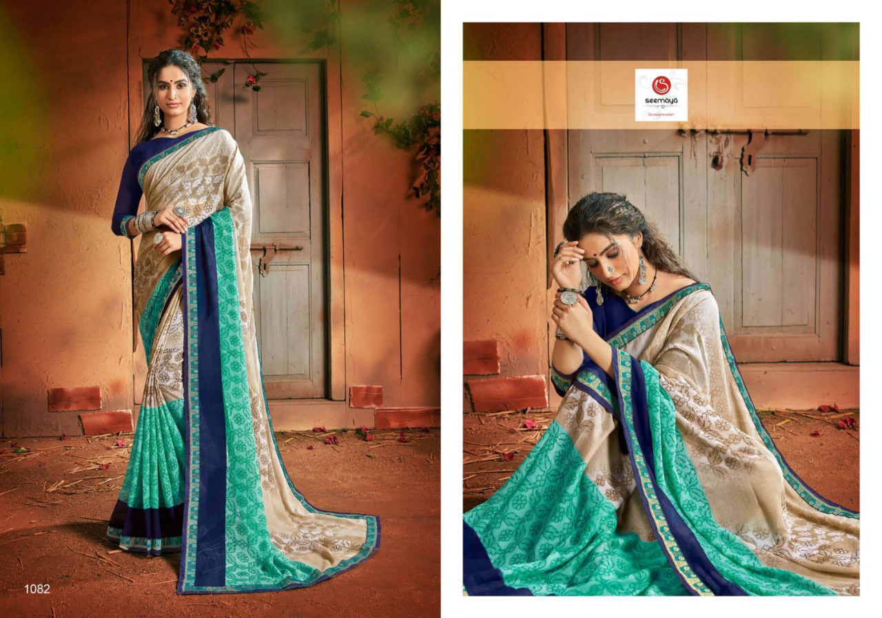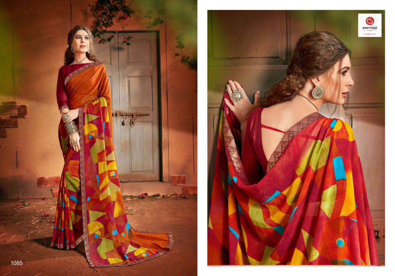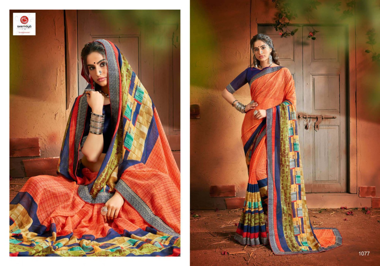 _MALINA Brand:- SEEMAYA Rate:- 360-/ Fabric:- FANCY GEORGATTE FABRIC FANCY PRINT WITH BORDER Total Designs:- 12 _Packing pcs :- set to set Set to set Matching :- SINGLE COLOR Cut :- 6/30mtr |
