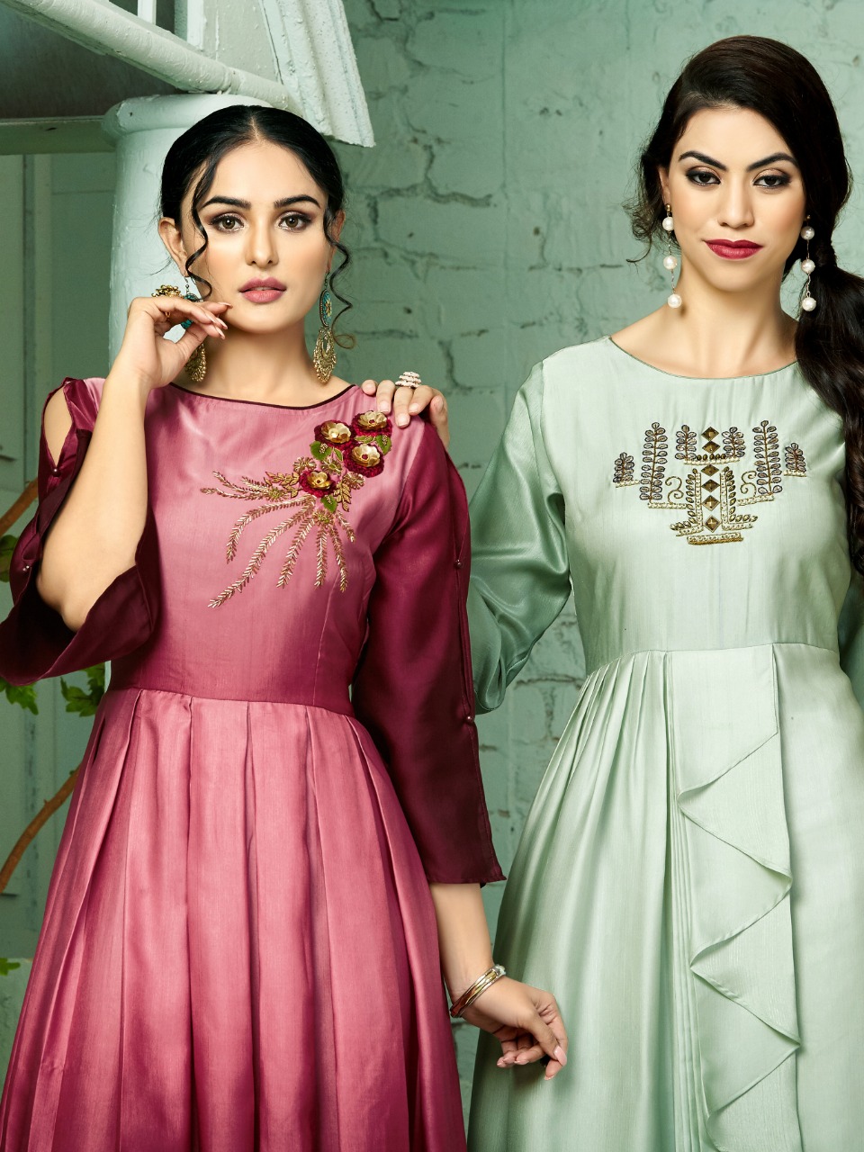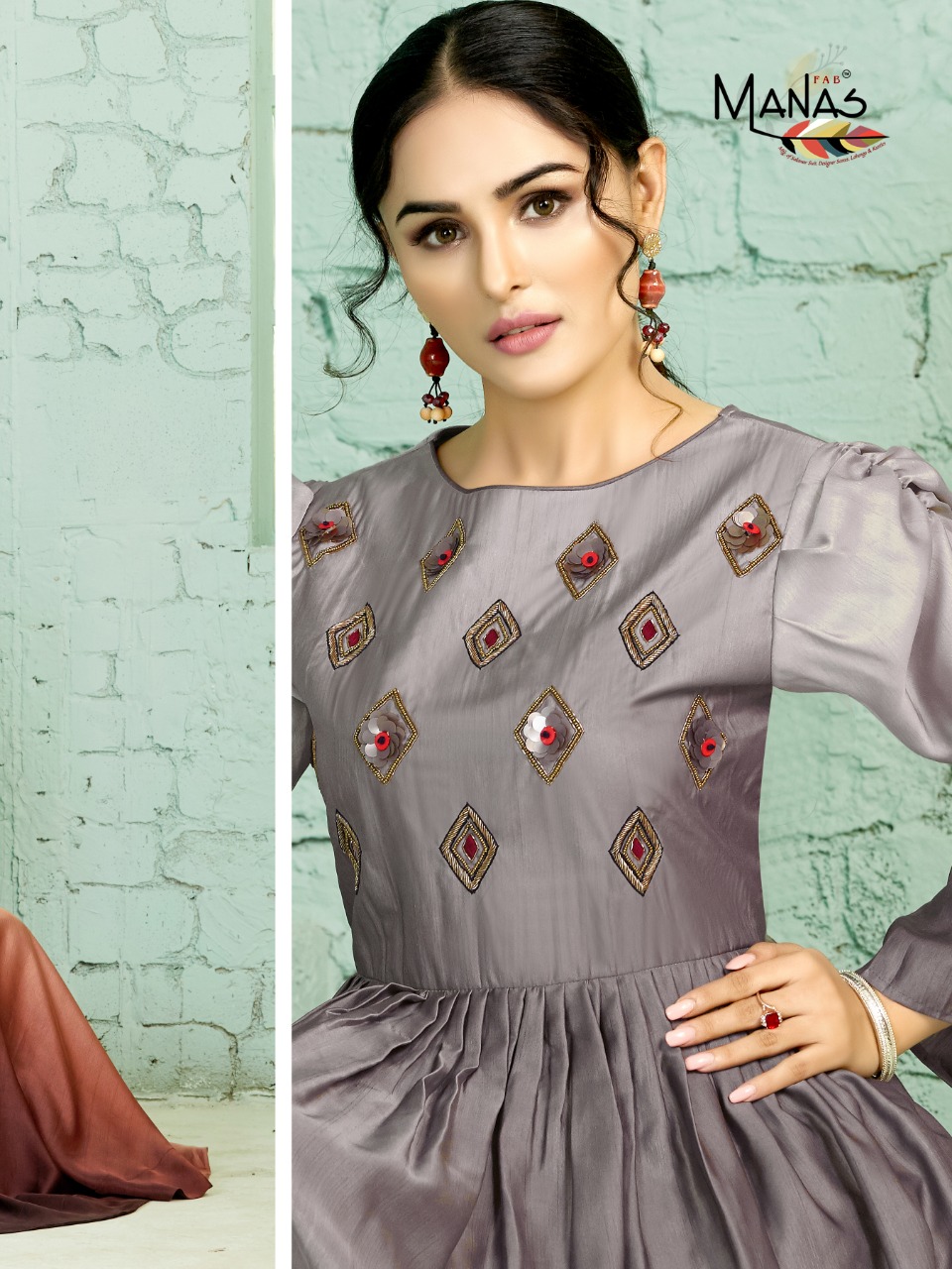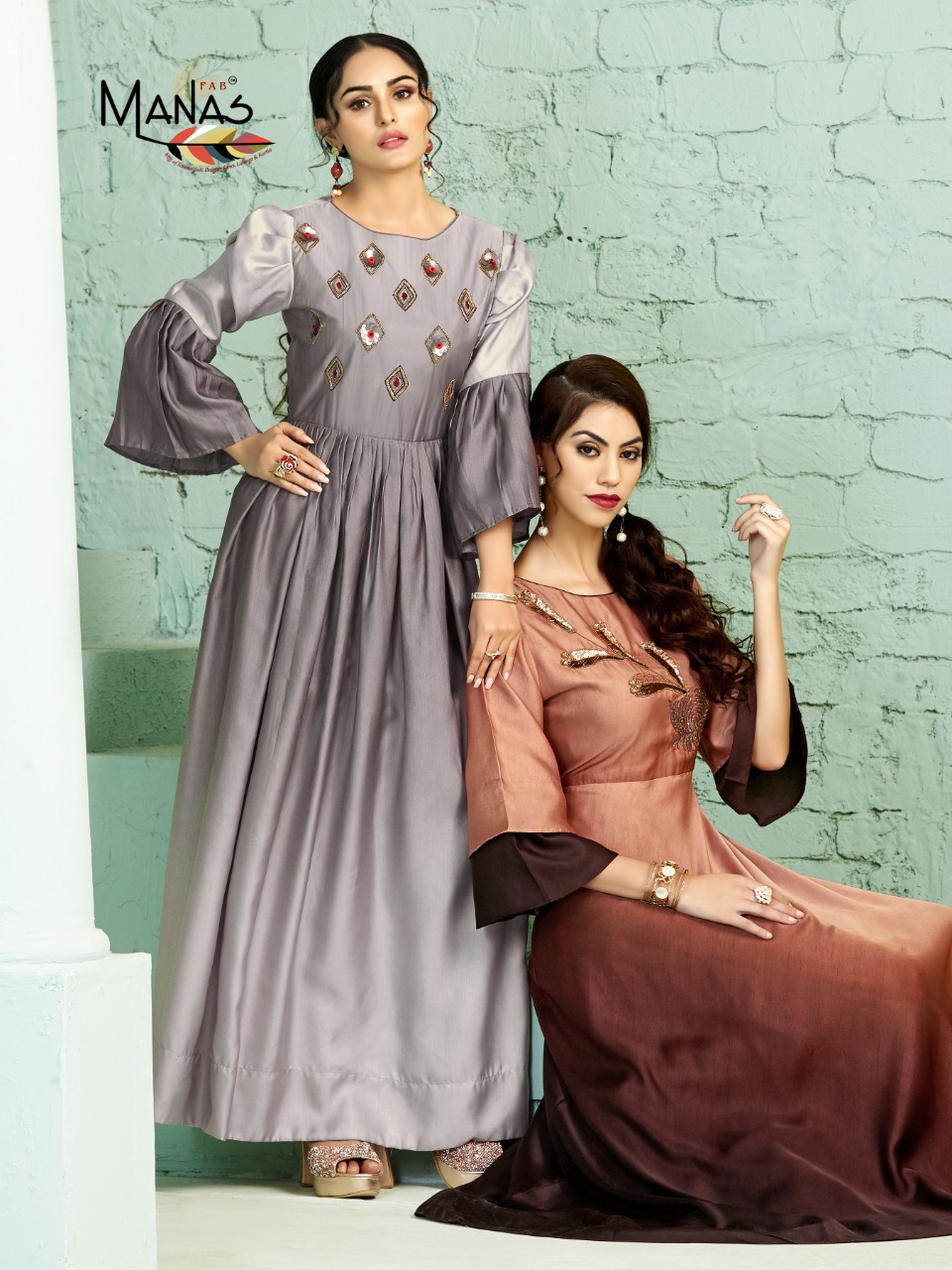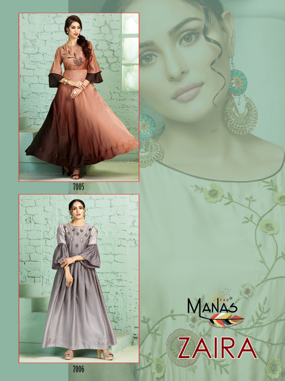 Manas Launch Zaira Fancy Silk Long Gown Style Kurti Wholesale Exporter In Surat