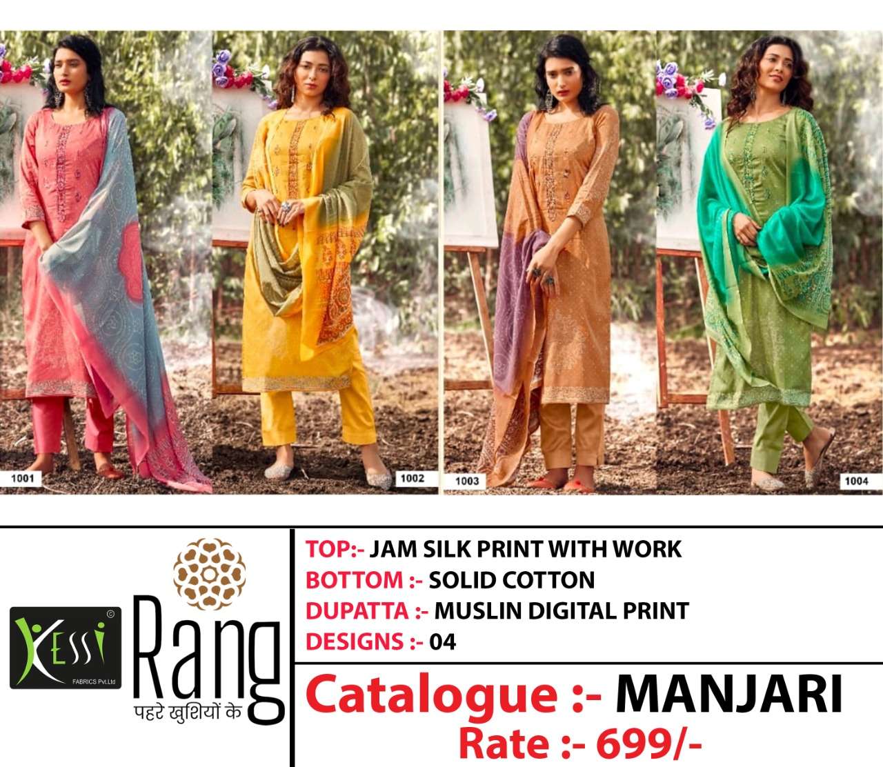 RANG (kessi fabrics)  has launched New  Catalog Name:  MANJARI Fabric Details Top:- Jam Silk Print With Work Bottom:- Solid Cottan Dupatta:- Muslin Print Total Design:- 4 Rate -: 699/-  Set to set GST 5 Percent Extra Dispatching today Booking started from now... Order yours soon.... |