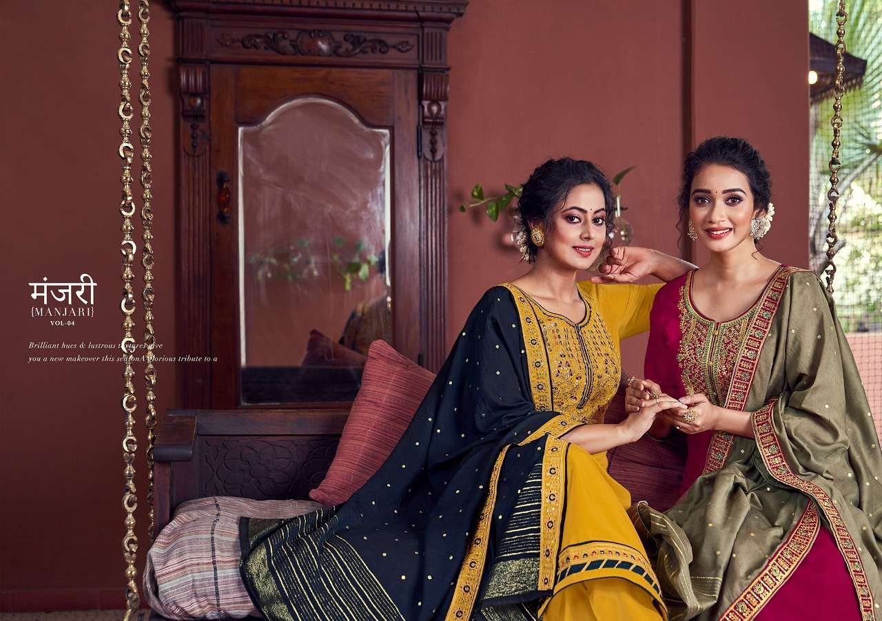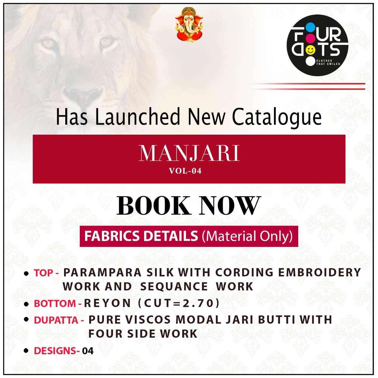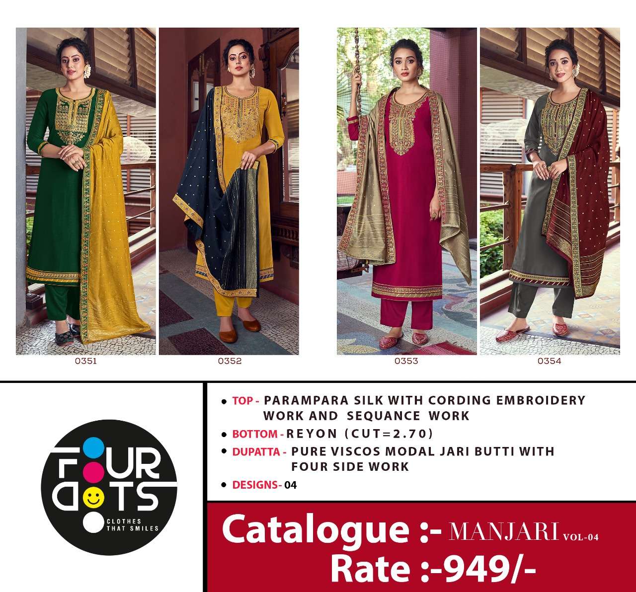 * * FOURDOTS  has launched  Catalog name :  * MANJARI VOL-4 * Fabric Details Top:- Parampara Silk With Cording Embroidery Work And Sequance Work Bottom:- Reyon (Cut=2.70) Dupatta:- Pure Viscos Modal Jari Butti With Four Side Work           Total Design:- 4  Rate- 949 per pcs . Set to set . GST 5 Percent Extra Dispatching 5 to 6 days later |