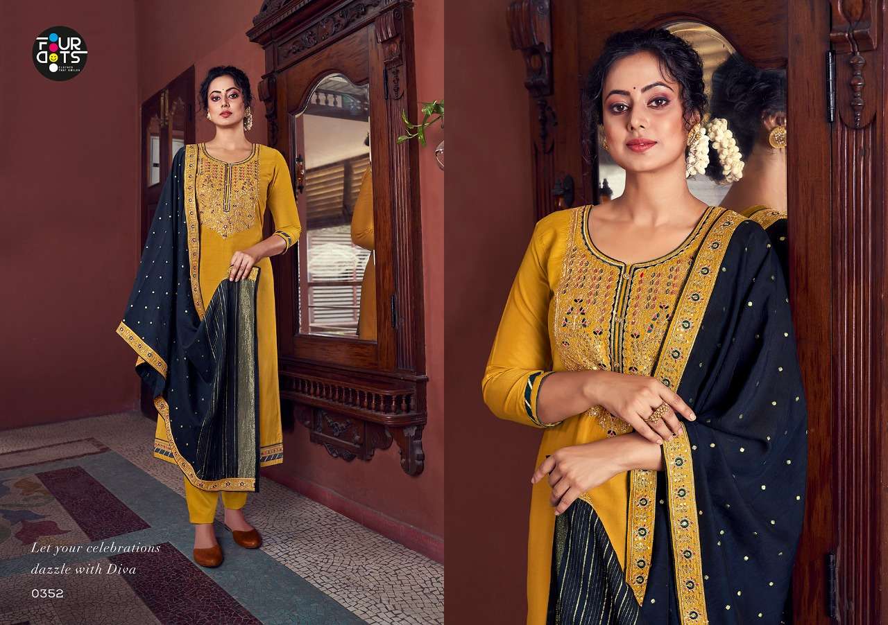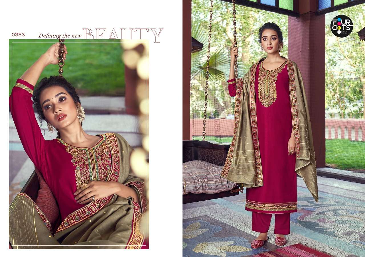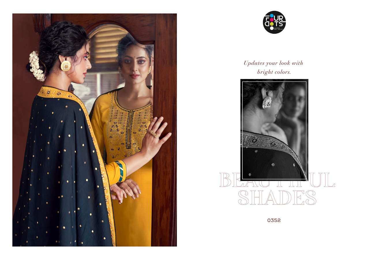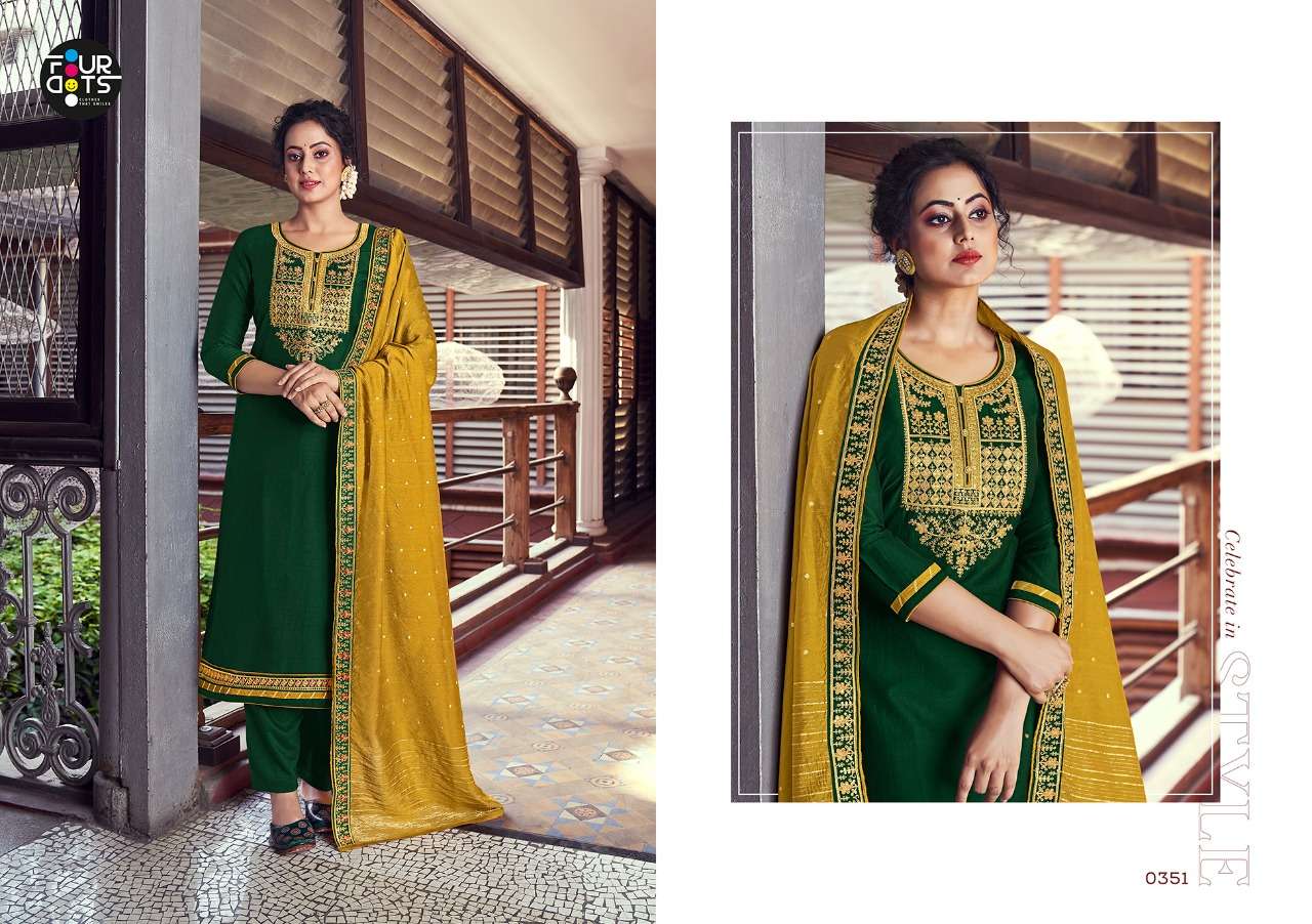 * * FOURDOTS  has launched  Catalog name :  * MANJARI VOL-4 * Fabric Details Top:- Parampara Silk With Cording Embroidery Work And Sequance Work Bottom:- Reyon (Cut=2.70) Dupatta:- Pure Viscos Modal Jari Butti With Four Side Work           Total Design:- 4  Rate- 949 per pcs . Set to set . GST 5 Percent Extra Dispatching 5 to 6 days later |