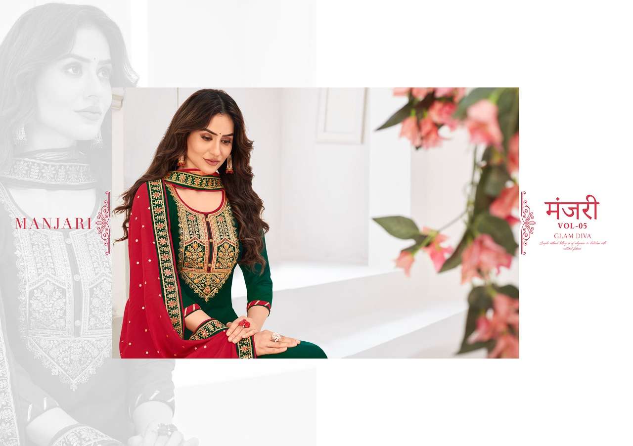 * FOURDOTS  has launched  Catalog name :  * MANJARI VOL-5 * Fabric Details Top:- Parampara Silk With Cording Embroidery Work Sequance Work Bottom:- Rayon (Cut=2.70) Dupatta:- Pure Viscose Modal Jari Butti With Four Side Work           Total Design:- 4  Rate:- 949 per pcs . Set to set Dispatching 5 to 6 days later |