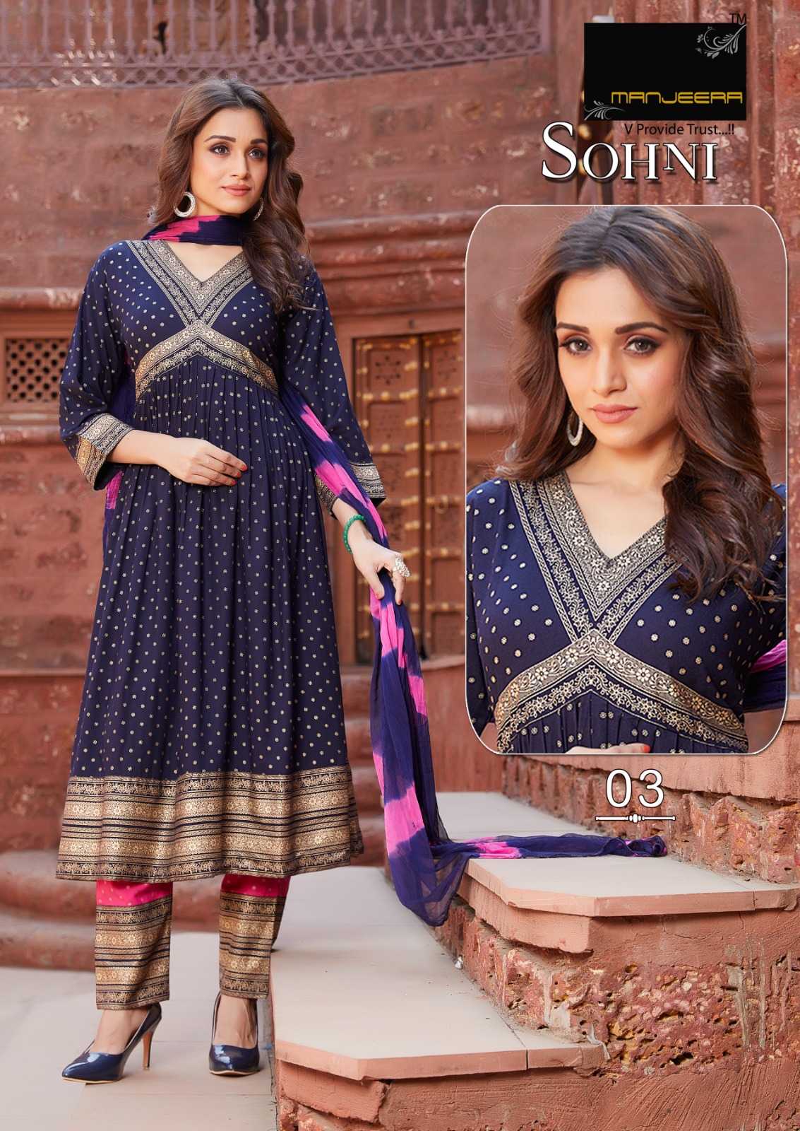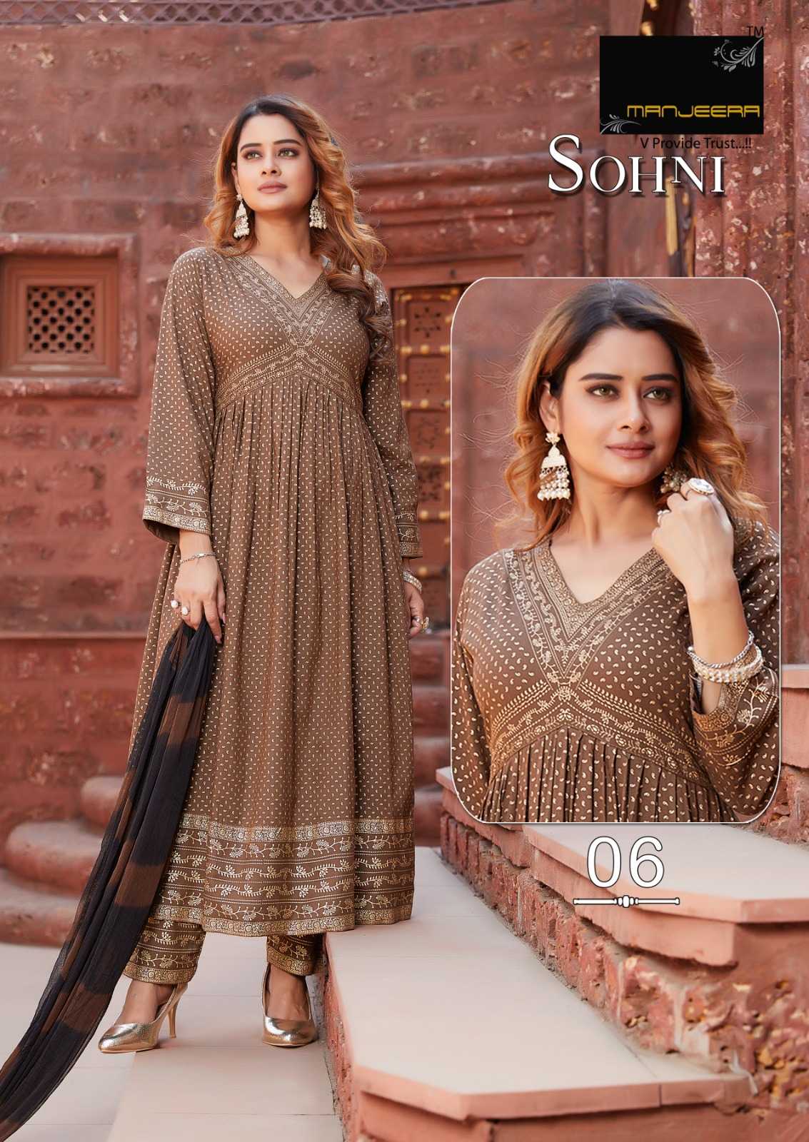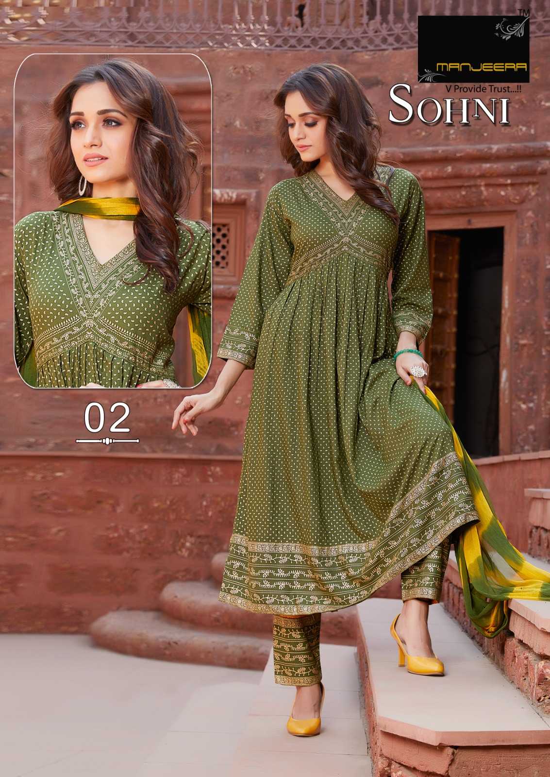 manjeera sohni stylish alia cut rayon full stitch top bottom dupatta catalog