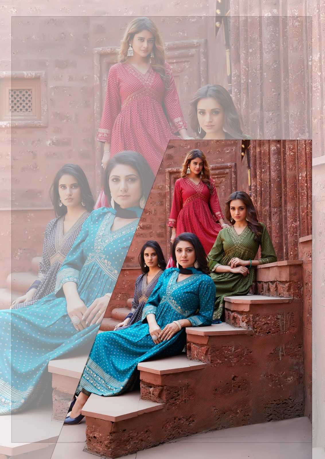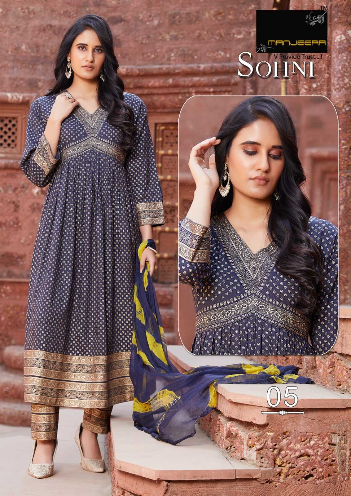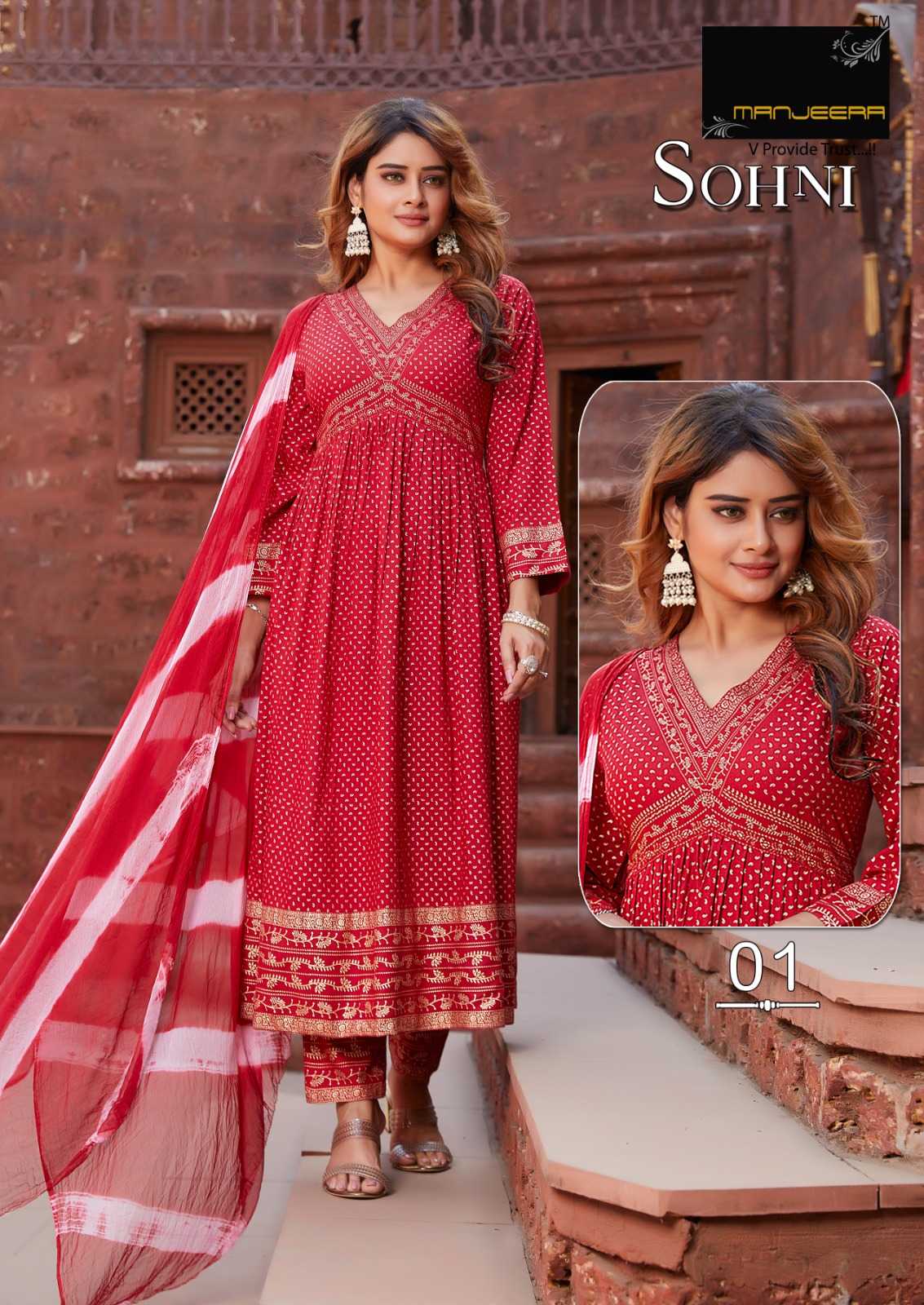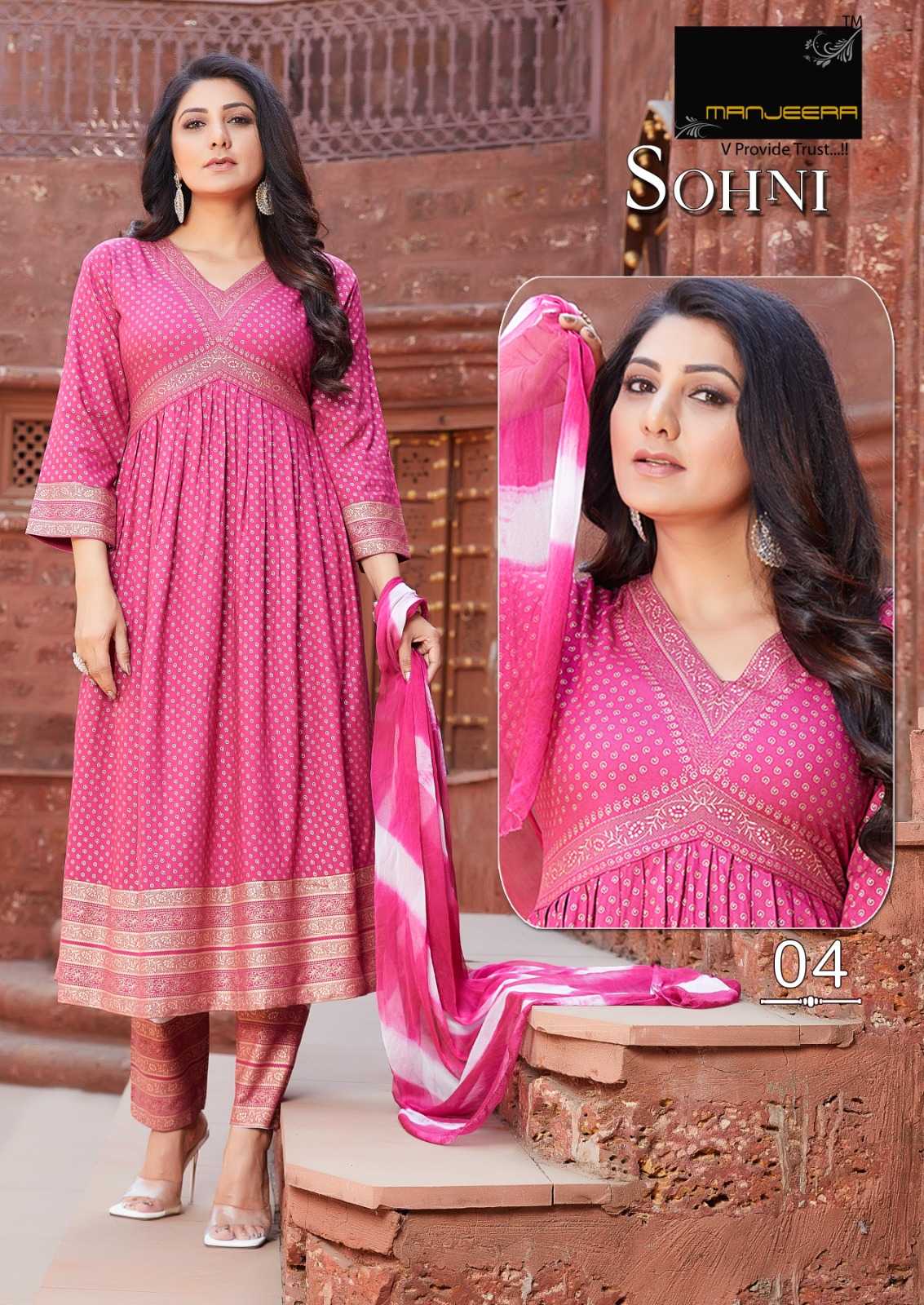 manjeera sohni stylish alia cut rayon full stitch top bottom dupatta catalog