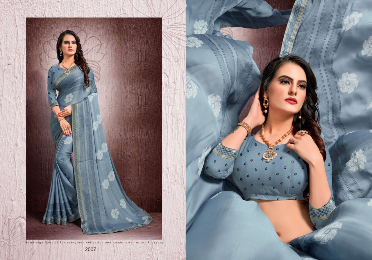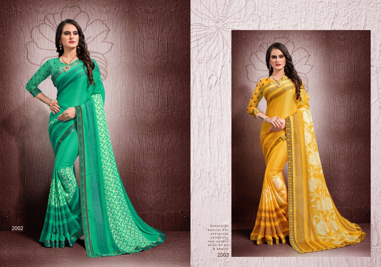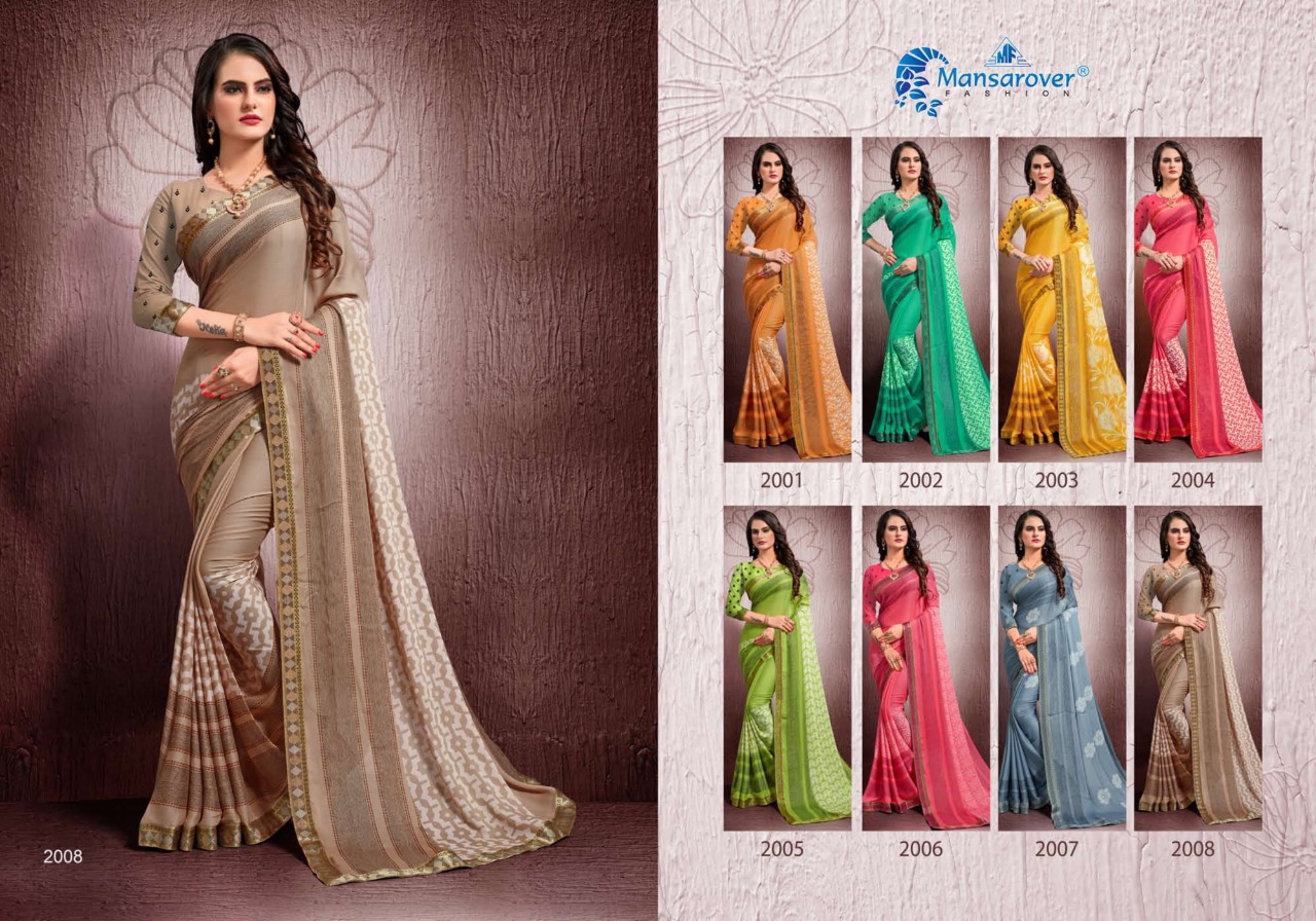 SURAT NEW INTRODUCING Kohinoor Brand:- MANSAROVER FASHION Rate:- 525/- GST 5 Percent Extra _Fabric:- Moss CHIFFON WITH EXCLUSIVE DYABLE FANCY BODER Total Designs:- 08 _Packing pcs :- set to set Matching :- SINGLE COLOR WITH BLOUSE Delivery from today |
