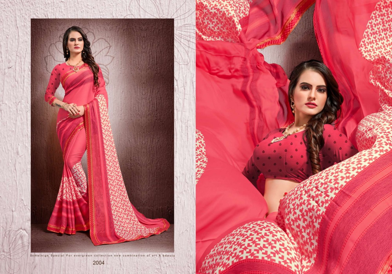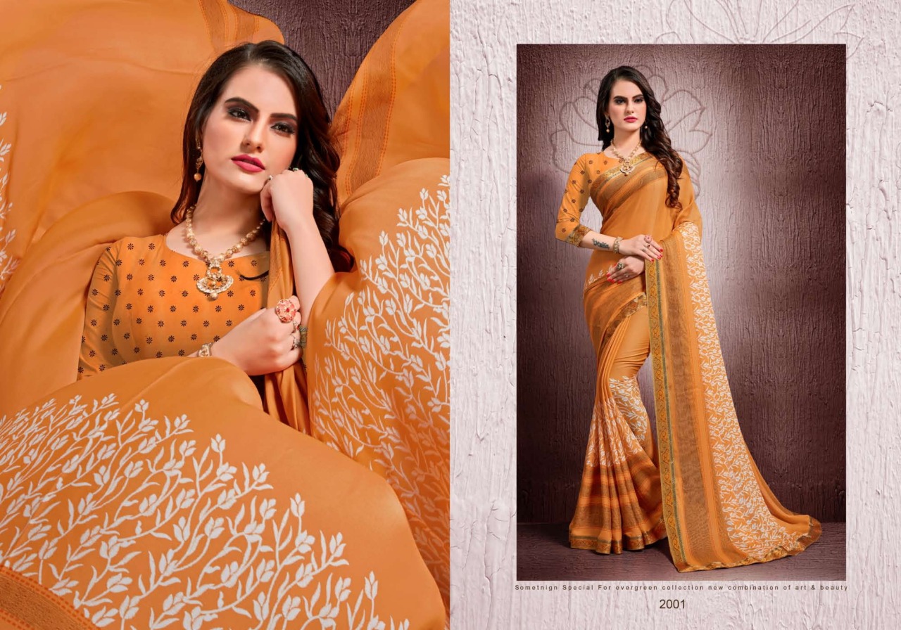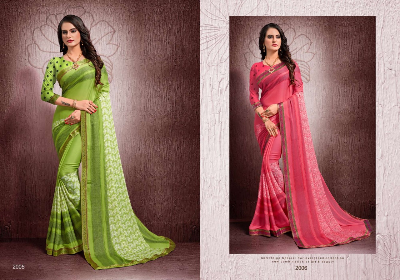 SURAT NEW INTRODUCING Kohinoor Brand:- MANSAROVER FASHION Rate:- 525/- GST 5 Percent Extra _Fabric:- Moss CHIFFON WITH EXCLUSIVE DYABLE FANCY BODER Total Designs:- 08 _Packing pcs :- set to set Matching :- SINGLE COLOR WITH BLOUSE Delivery from today |