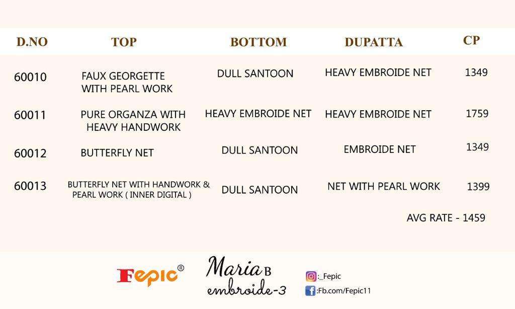 Catalogue Name:-  *ROSEMEEN MARIA B EMBROIDE-3 *    Fabric details Top : FAUX GEORGETTE/ PURE ORGANZA/ BUTTERFLY NET HEAVY EMBROIDERED Inner  : DIGITAL PRINTED/ DULL SANTOON Bottom  :DULL SANTOON/ HEAVY EMBROIDERED SANTOON â Dupatta : NET HEAVY EMBROIDERED / HEAVY PEARL WORK DELIVERY 4-5 days Set to set FEPIC |