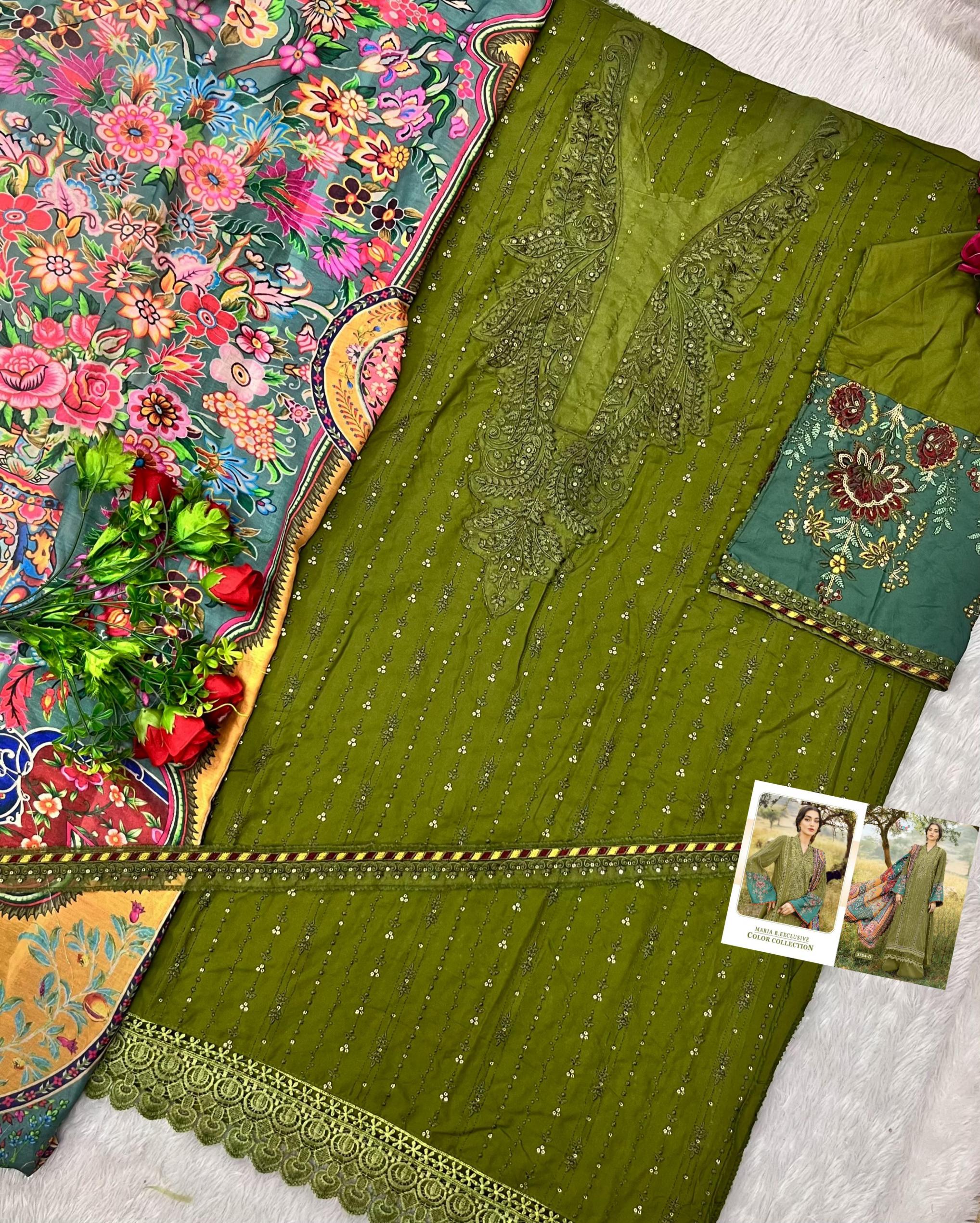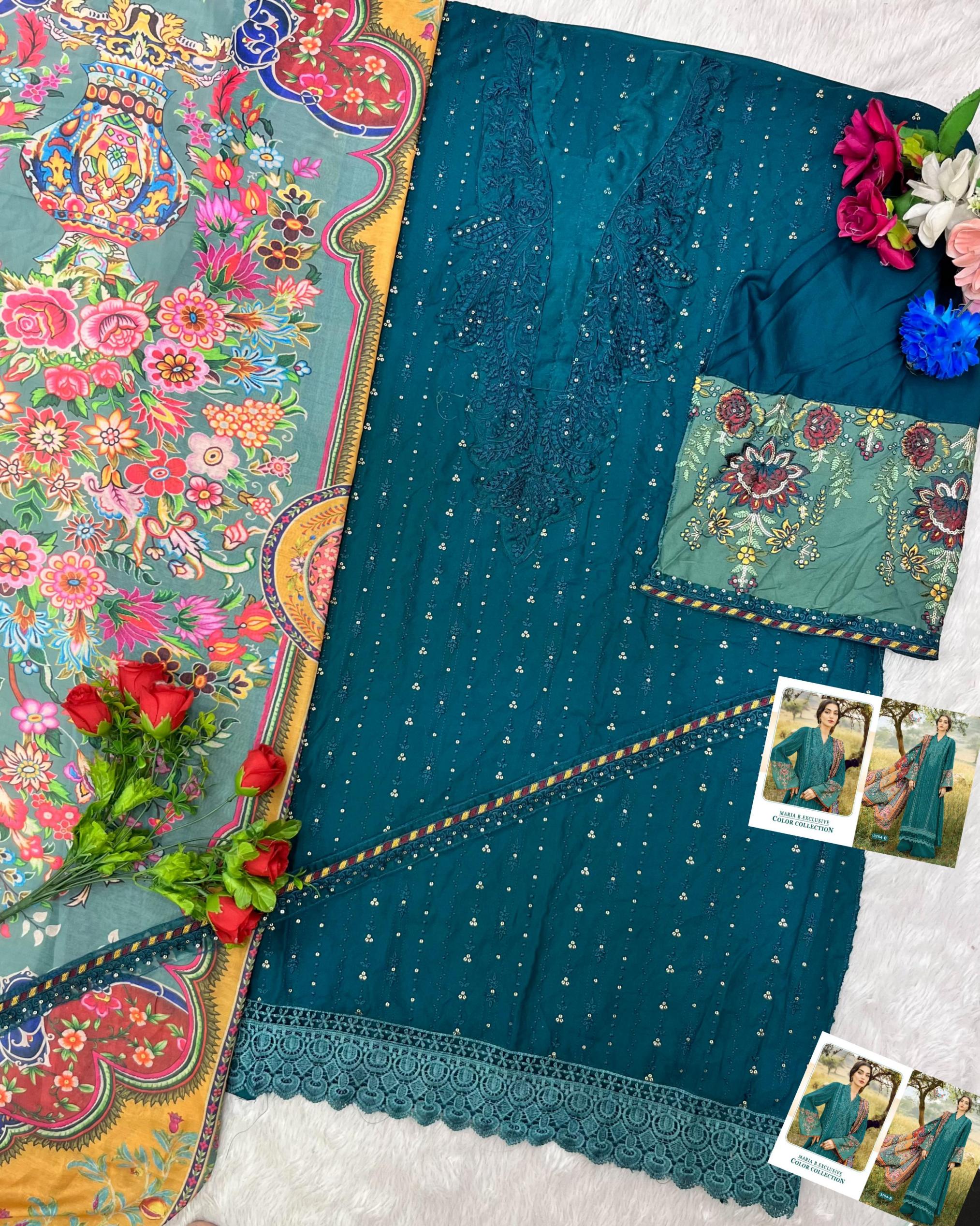 *MARIA B EXCLUSIVE COLOUR COLLECTION * Top heavy reyon embrodered Bottom reyon Duppta silver / cotton colour-4 Rate 999 + gst siffon 1050 + gst cotton Shree fabs surat©️ |