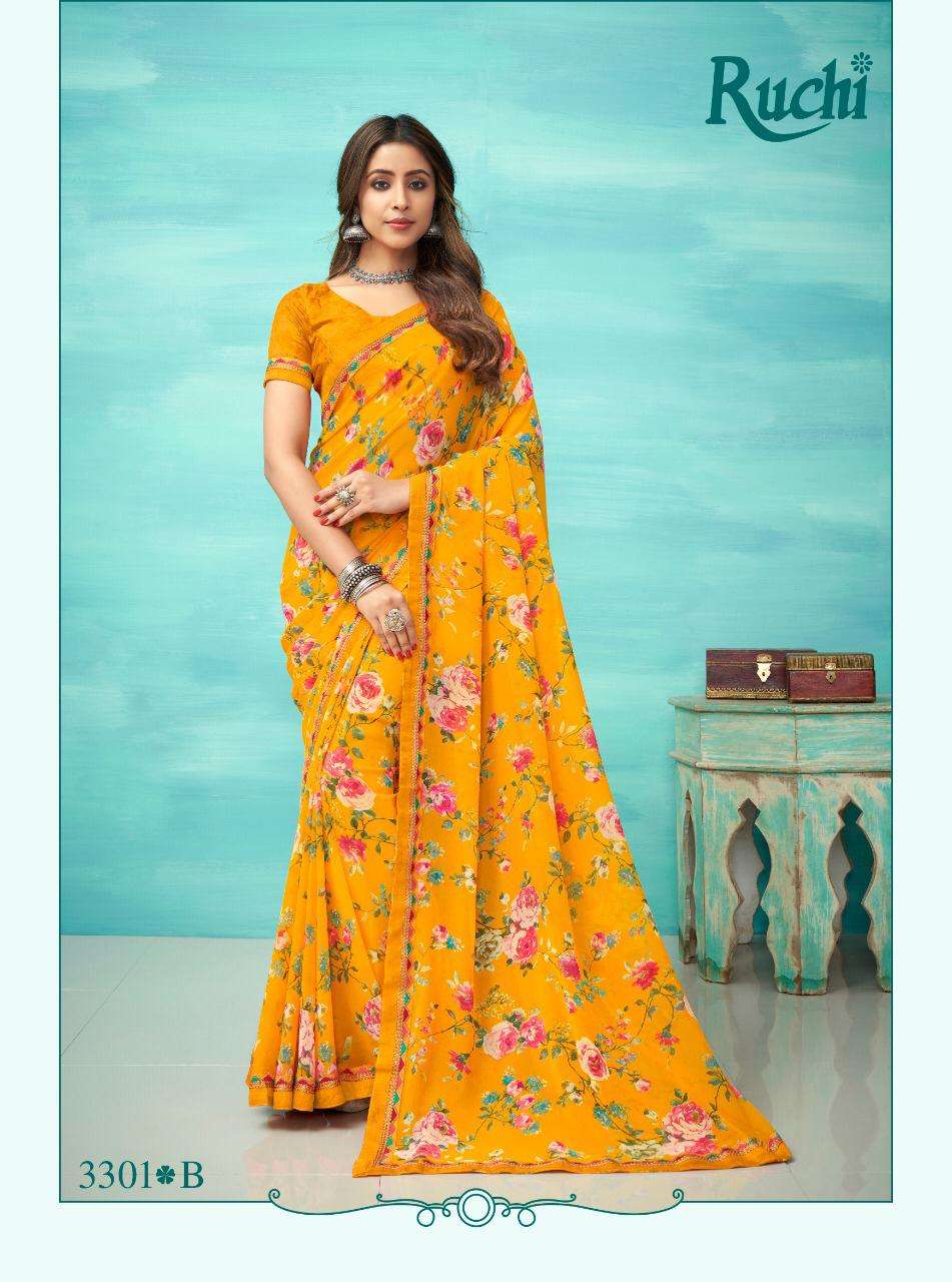 Ruchi Sarees 1). Catalog- MariGold. 2). Fabric- Saree(Pure Georgette), Blouse ( Cotton Silk), Broder (work embroidery) 3). Pcs. - 12. 4). Per pcs rate - 835 . GST 5 Percent Extra. Delivery from today |