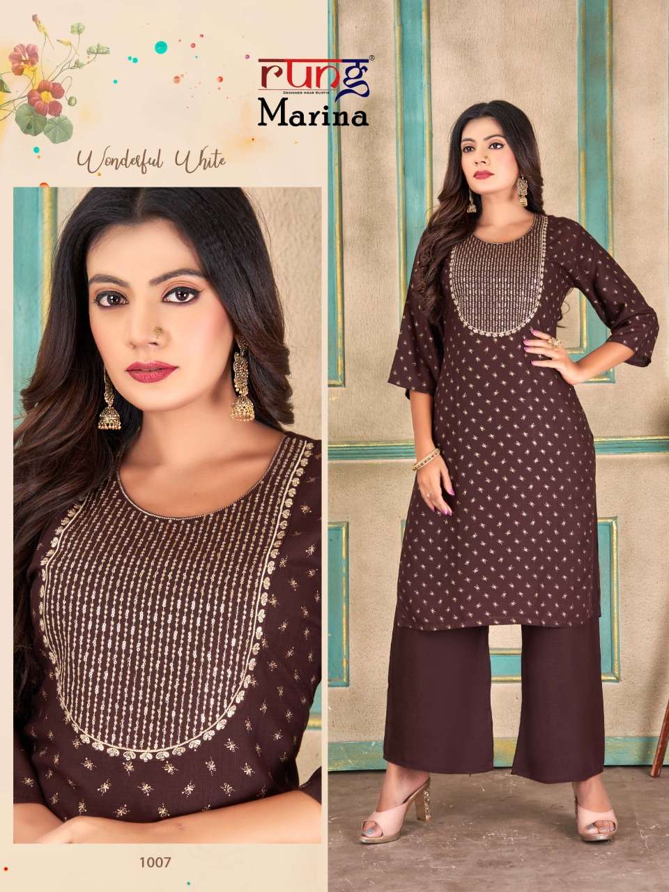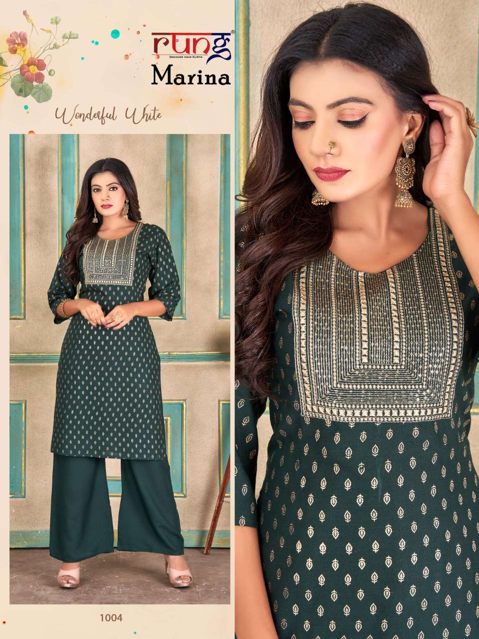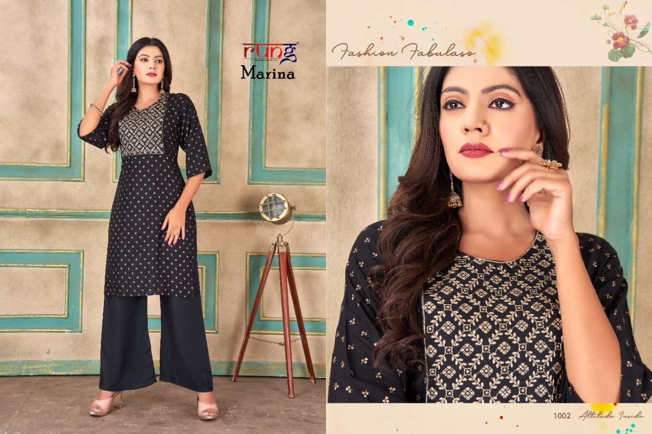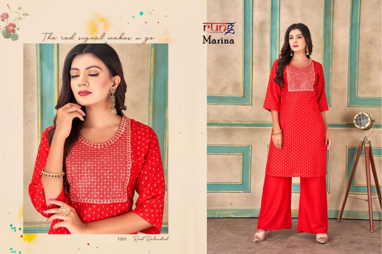 Brand - Rung KURTI WITH PLAZO CATLOG FEBRIC.. Heavy RIYON WITH GOLD PRINT AND Embroidery WORK . BOTOOM.. Bombay slub PC's. 8 Size. M. L. XL. XXXL Rate |