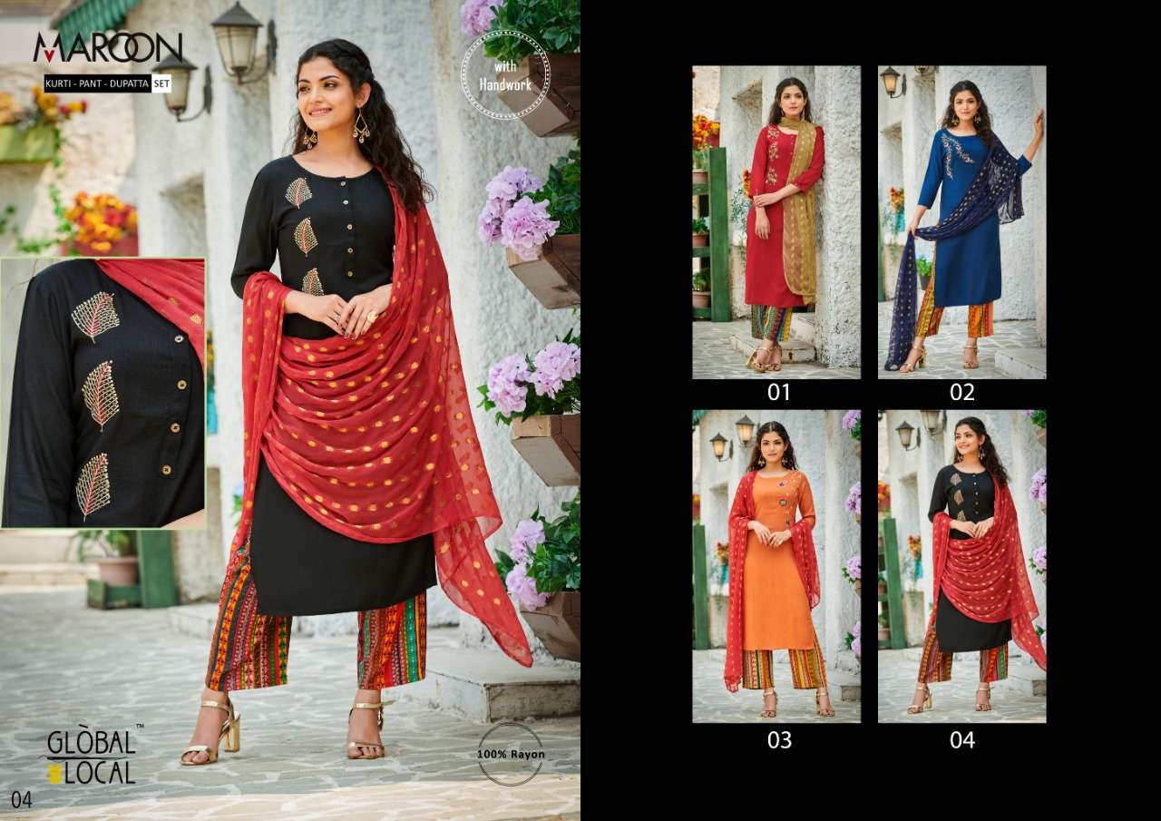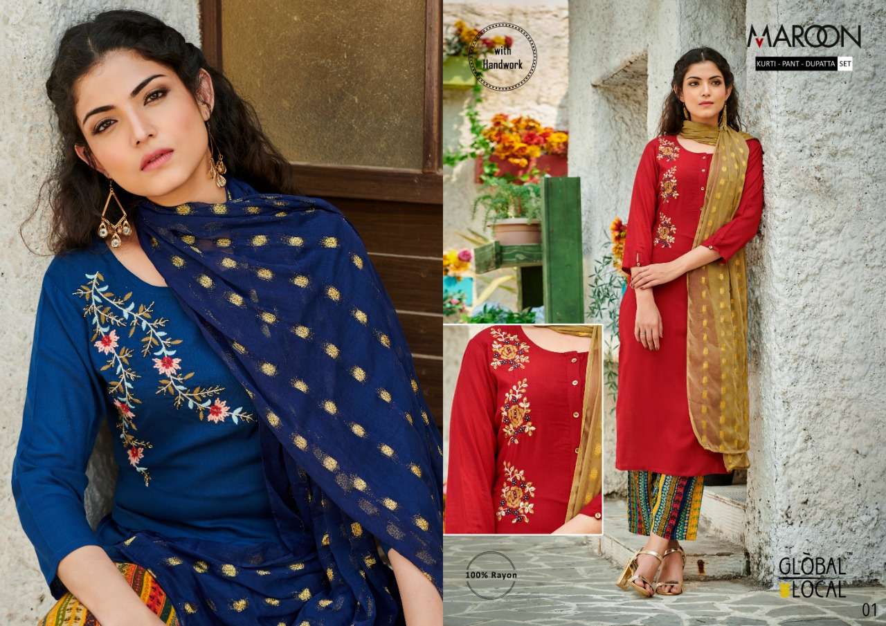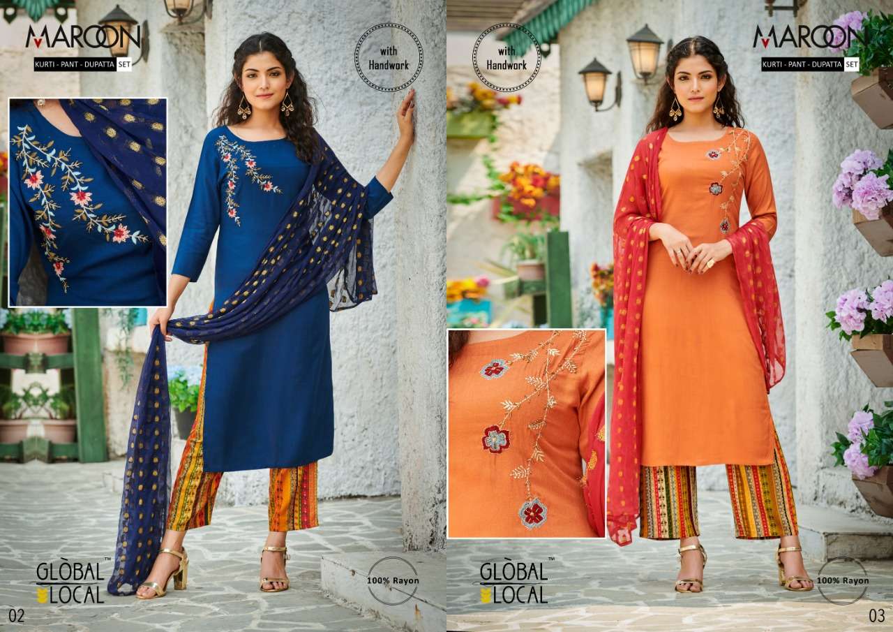 Catalog : MAROON with bottom & dupatta 3 piece readymade set BRAND : GLOBAL LOCAL⢠TYPE :  Handwork kurtis in 100% rayon with  printed pants & Jari dupatta SIZES : S to 2XL RATE : 855/-(with pant & dupatta) Pieces:  4 per Bag |