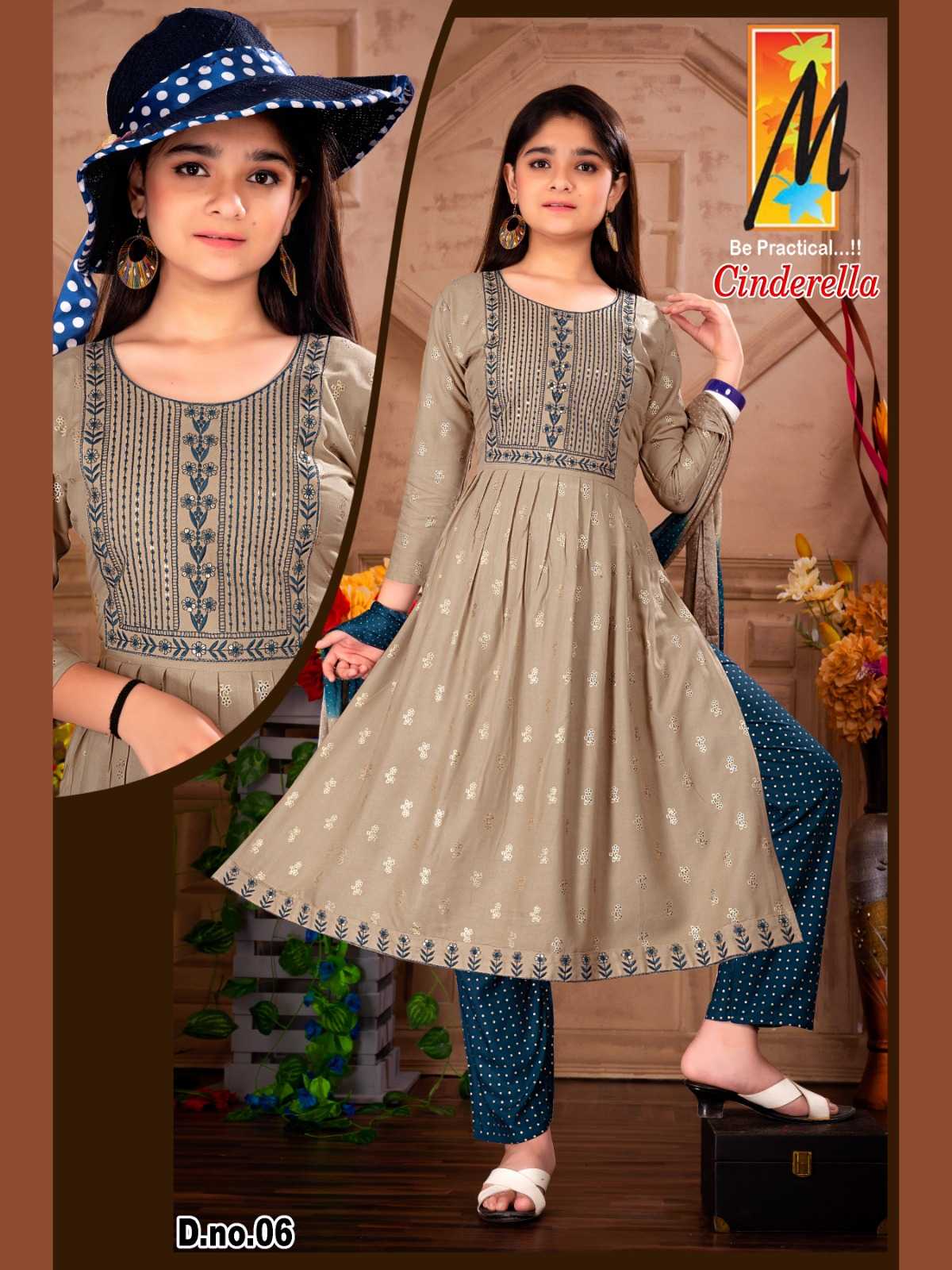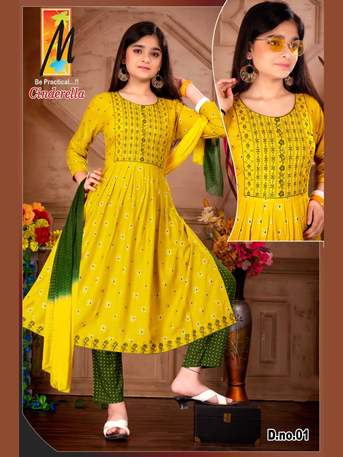 master kurti cinderella kids wear fancy gold print kurti pant dupatta