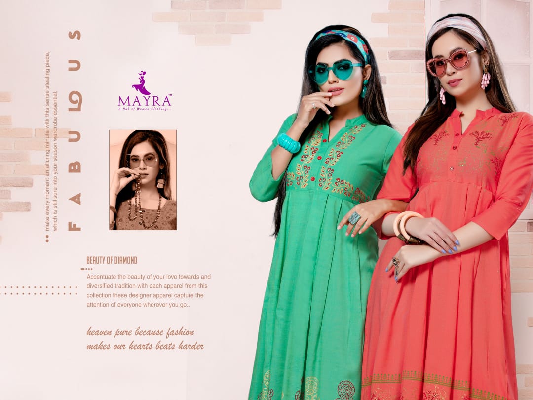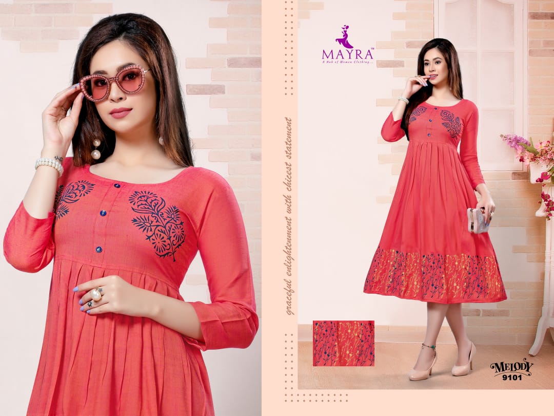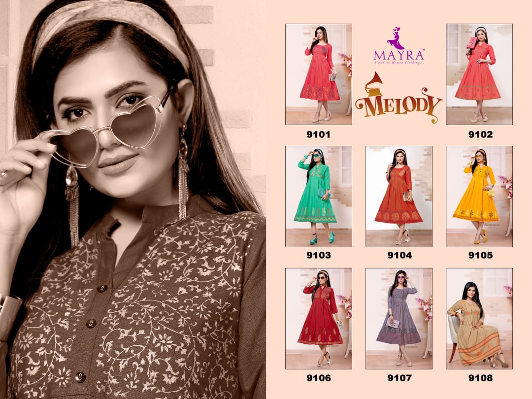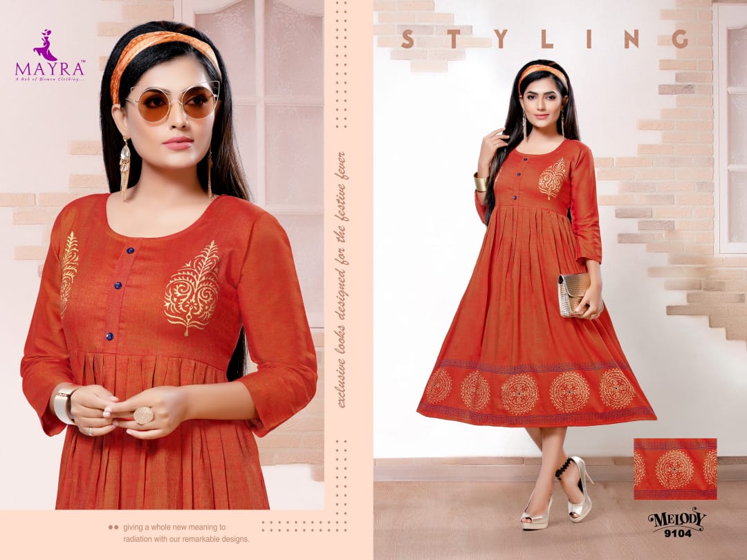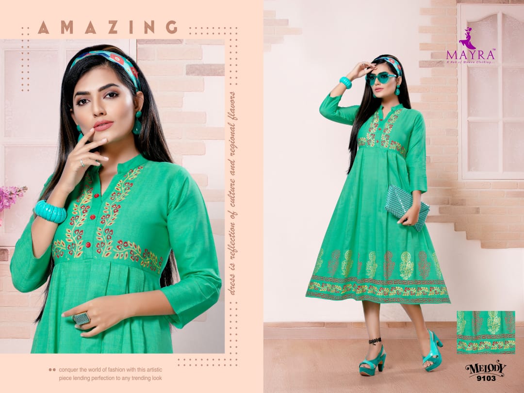 Dear Customers, Welcome to MAYRA (KURTI) .., We are introducing MAYRA S new catalog Catalogue:- MELODY cloth :- Reyon 2 ton with block and screen print â concept :- Anchor, block and screen print, silayi pattern Length :- 45âÂÂMINIMUM Size:- M,L,XL, 2XL AVAILABLE 8 DESIGNS CATALOGUE à: Dispatch :- dispatch after 4 December RATE : 395/- Always with you... Team MAYRA |