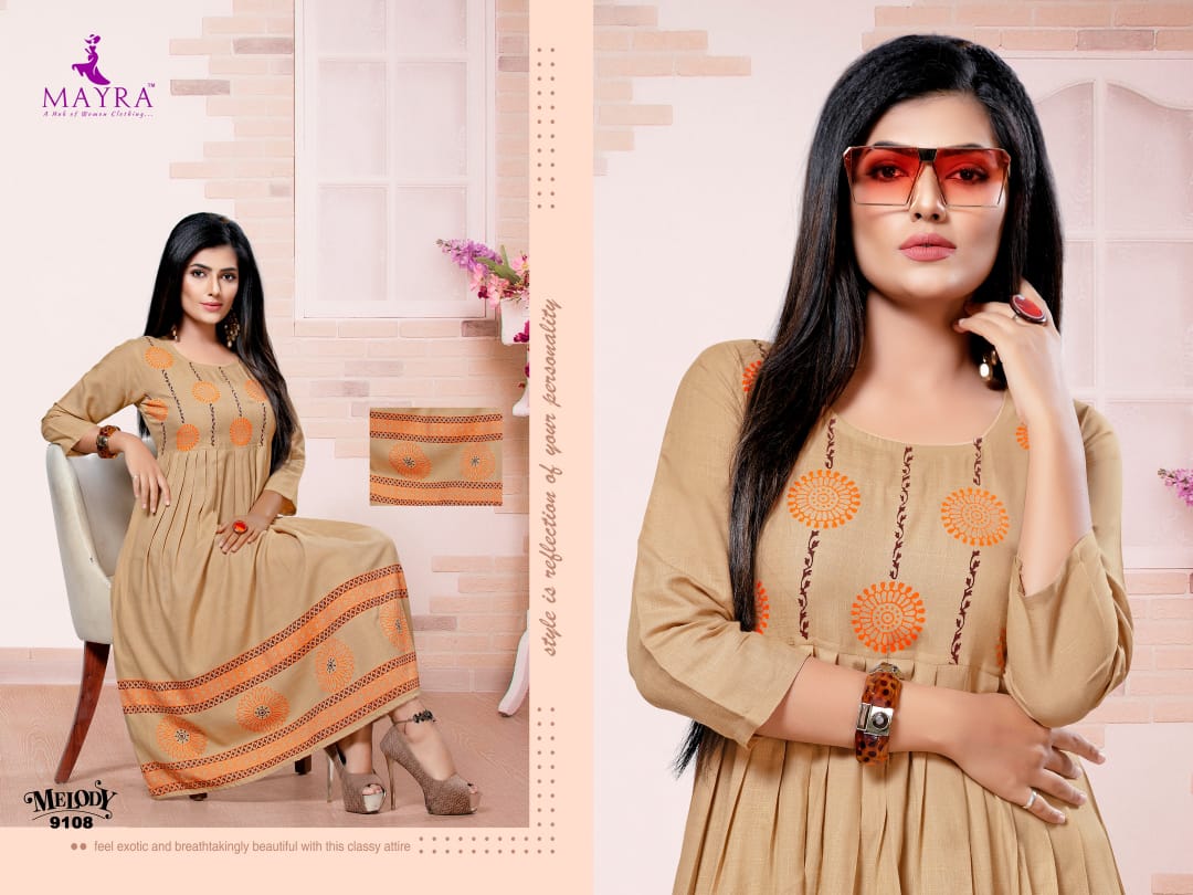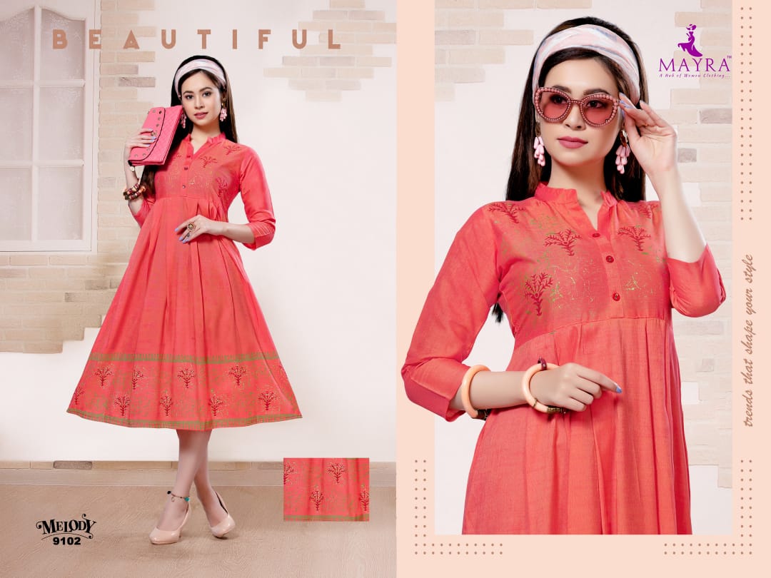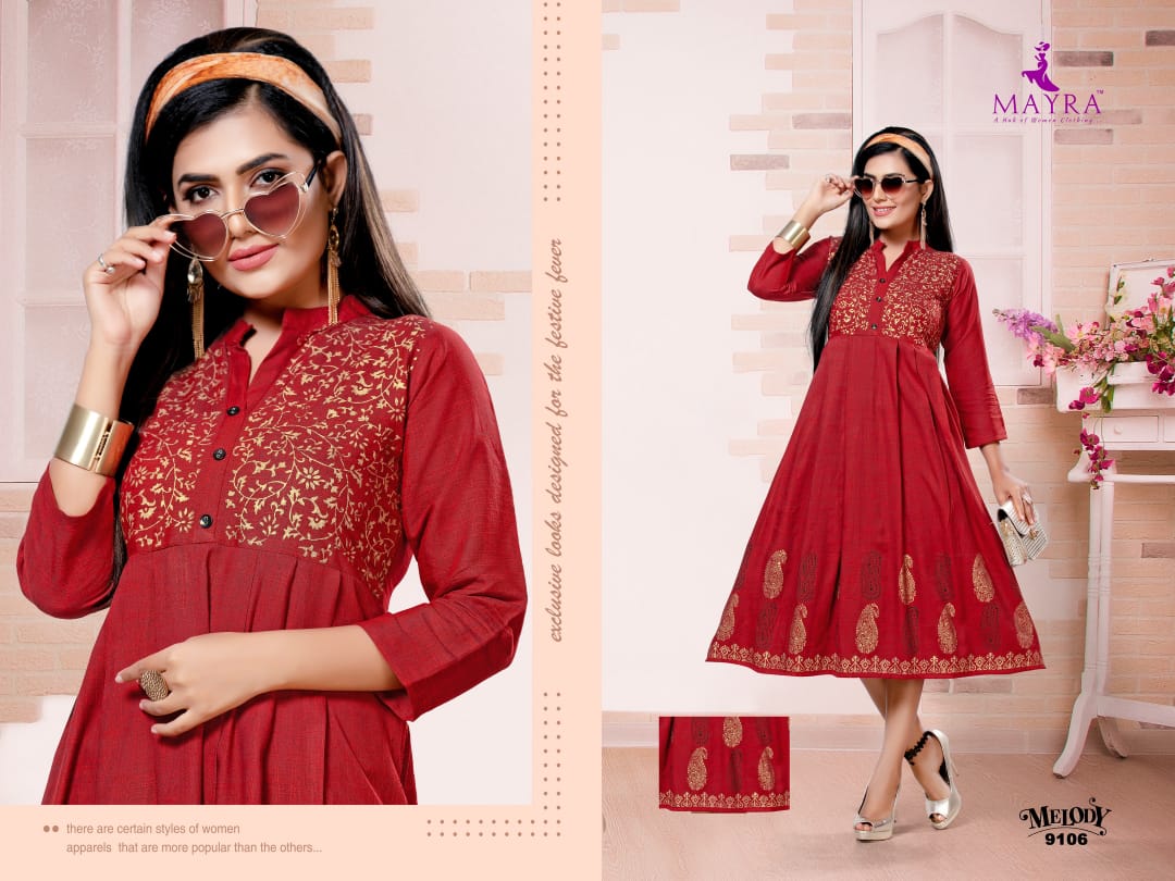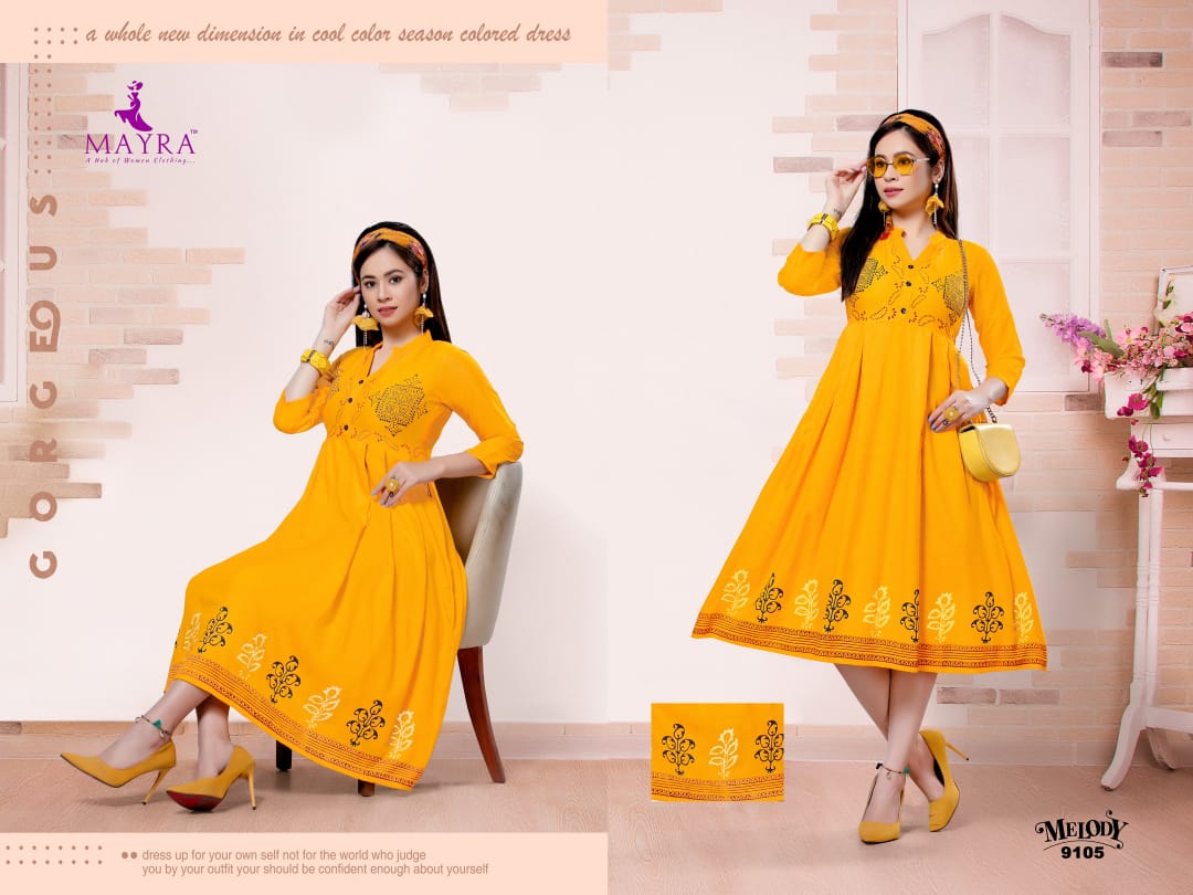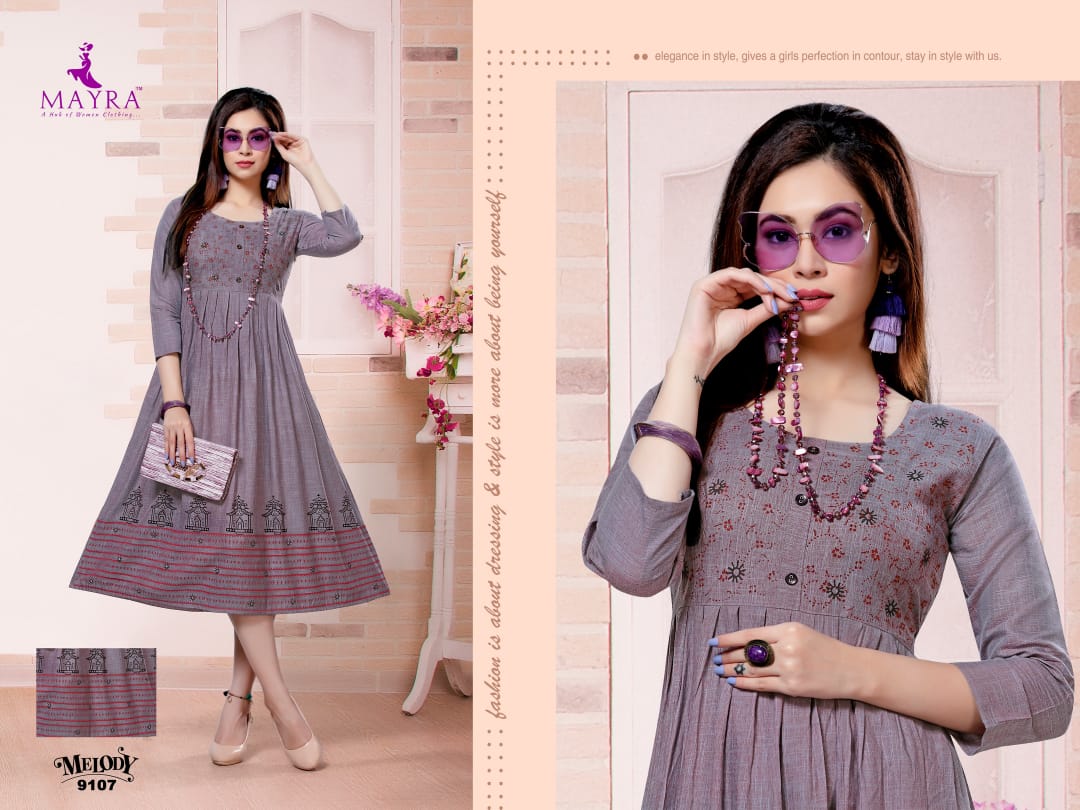 Dear Customers, Welcome to MAYRA (KURTI) .., We are introducing MAYRA S new catalog Catalogue:- MELODY cloth :- Reyon 2 ton with block and screen print â concept :- Anchor, block and screen print, silayi pattern Length :- 45âÂÂMINIMUM Size:- M,L,XL, 2XL AVAILABLE 8 DESIGNS CATALOGUE à: Dispatch :- dispatch after 4 December RATE : 395/- Always with you... Team MAYRA |