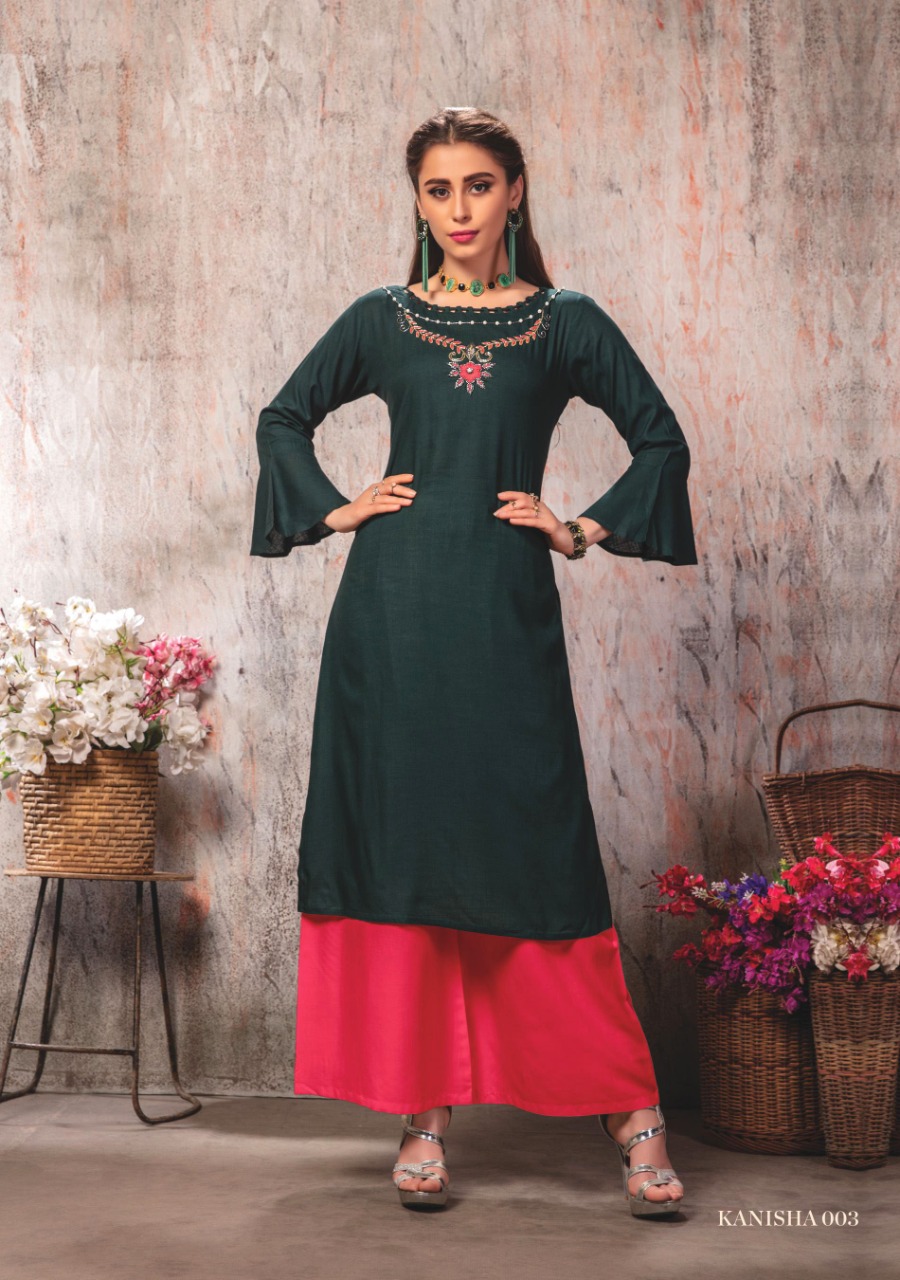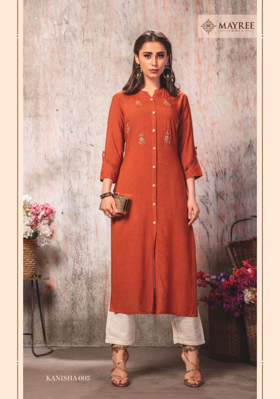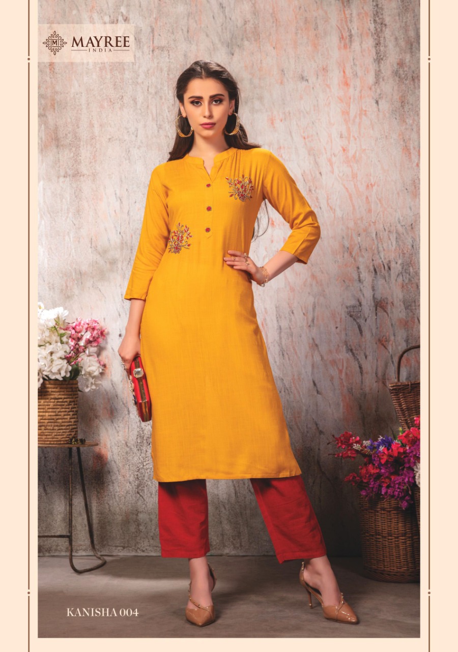 We are launching new brand with the name of âÂÂâÂÂMAYREE-INDIAâÂÂâÂÂ. Fashion At Affordable Price âÂÂThe Test of Summer Collection â âÂÂMAYREE-INDIAâ Catalogue Name-àNew series KANISHA â¨Details Fabrics :- 14 kg slub reyon with embroidery straight kurti Size :- M(19) L(20) XL(21) XXL(22) 3xxl(23) â£Designs :- 8pcs 475+GST |