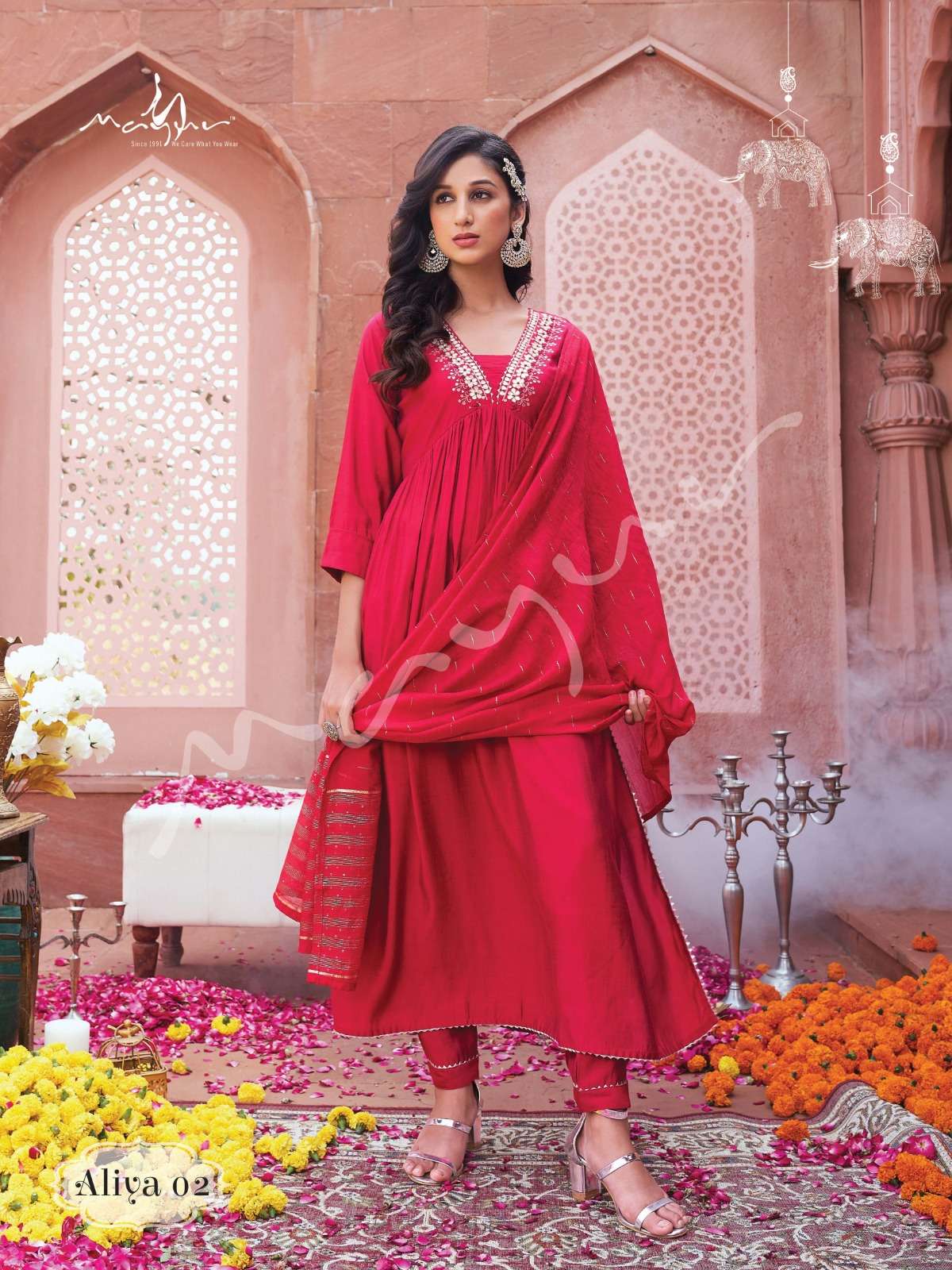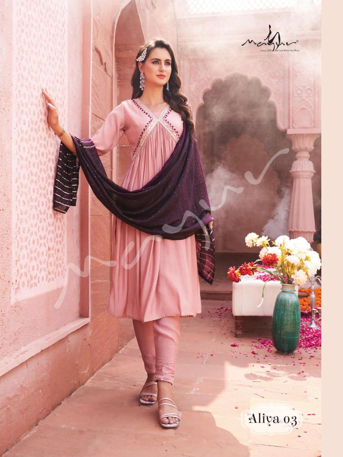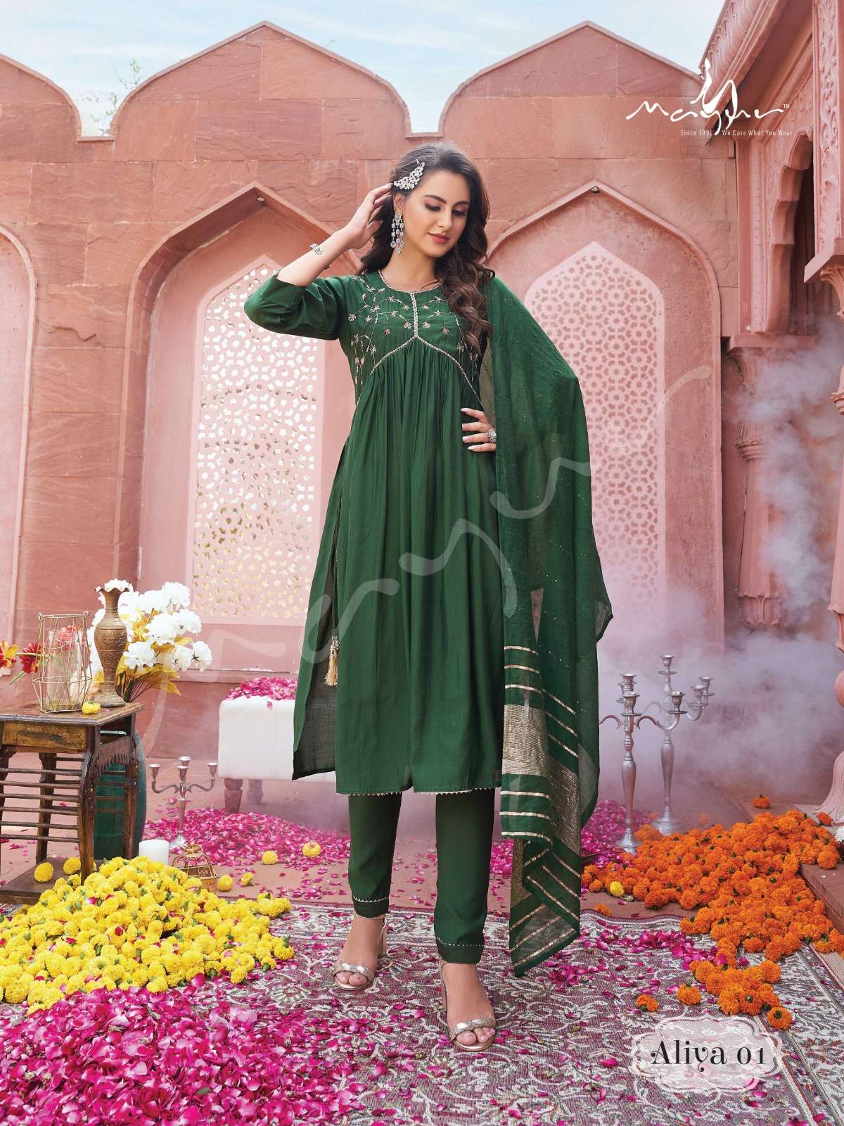 Modern, Classic, Crisp, Festive Favorite and super comfortable Ensembles by Mayur Fashion 💖 Aliya 💖 Aliya 3pcs set silhouettes are here to be your newest wardrobe addition ❤️💯 Handwork Aliya Pattern 3pcs set 👗No of Aliya Garments : 6 ✂Sizes available : M, L, XL, 2XL and 3XL Fabric Details : Kurta👚- Premium Viscous Silk with Designer Aliya Handwork Pattern - 45-46" Fancy Pant 👖 - Self Premium Viscous Silk Pant - 38-39" Dupatta 🧣 - Silk with Sequence and Weaving Pattern - 2.25mtrs Rate - 1351/- |