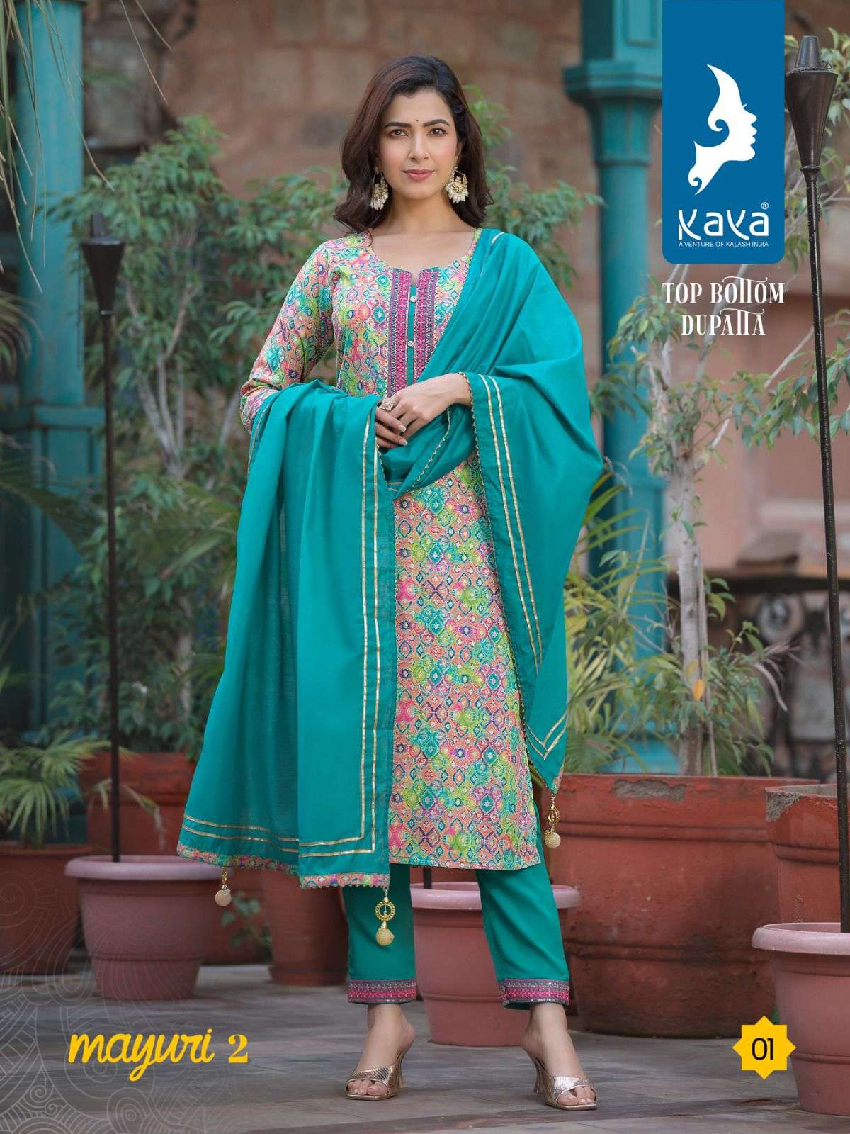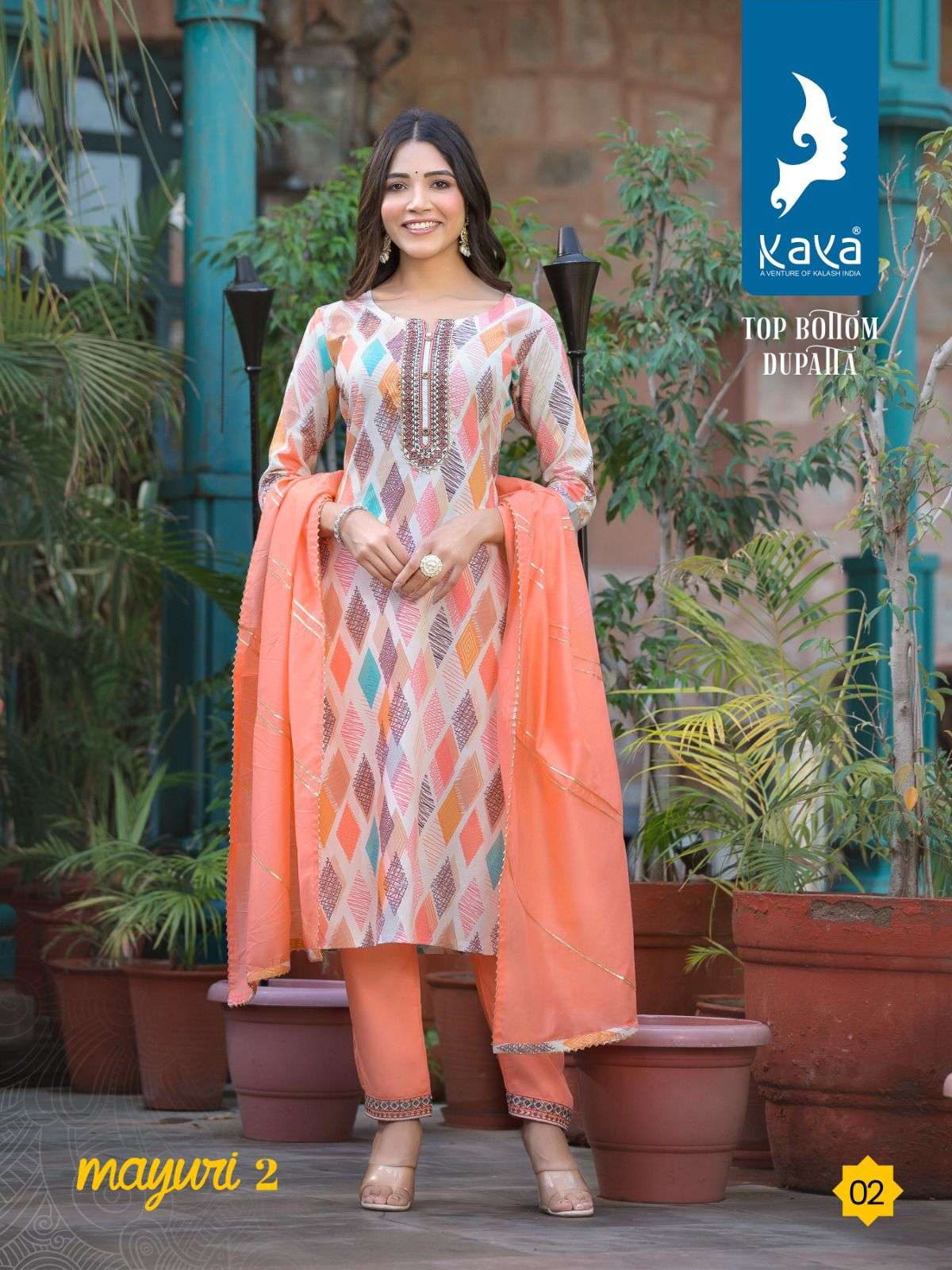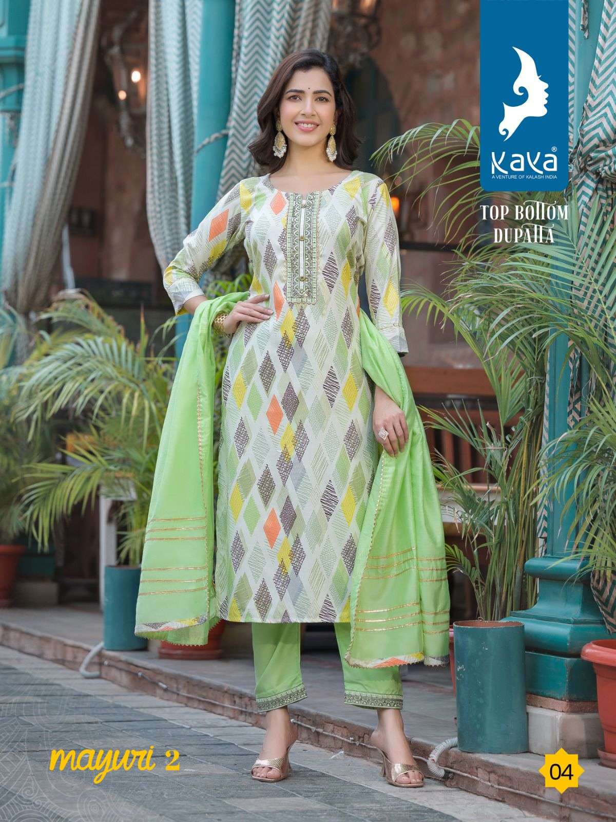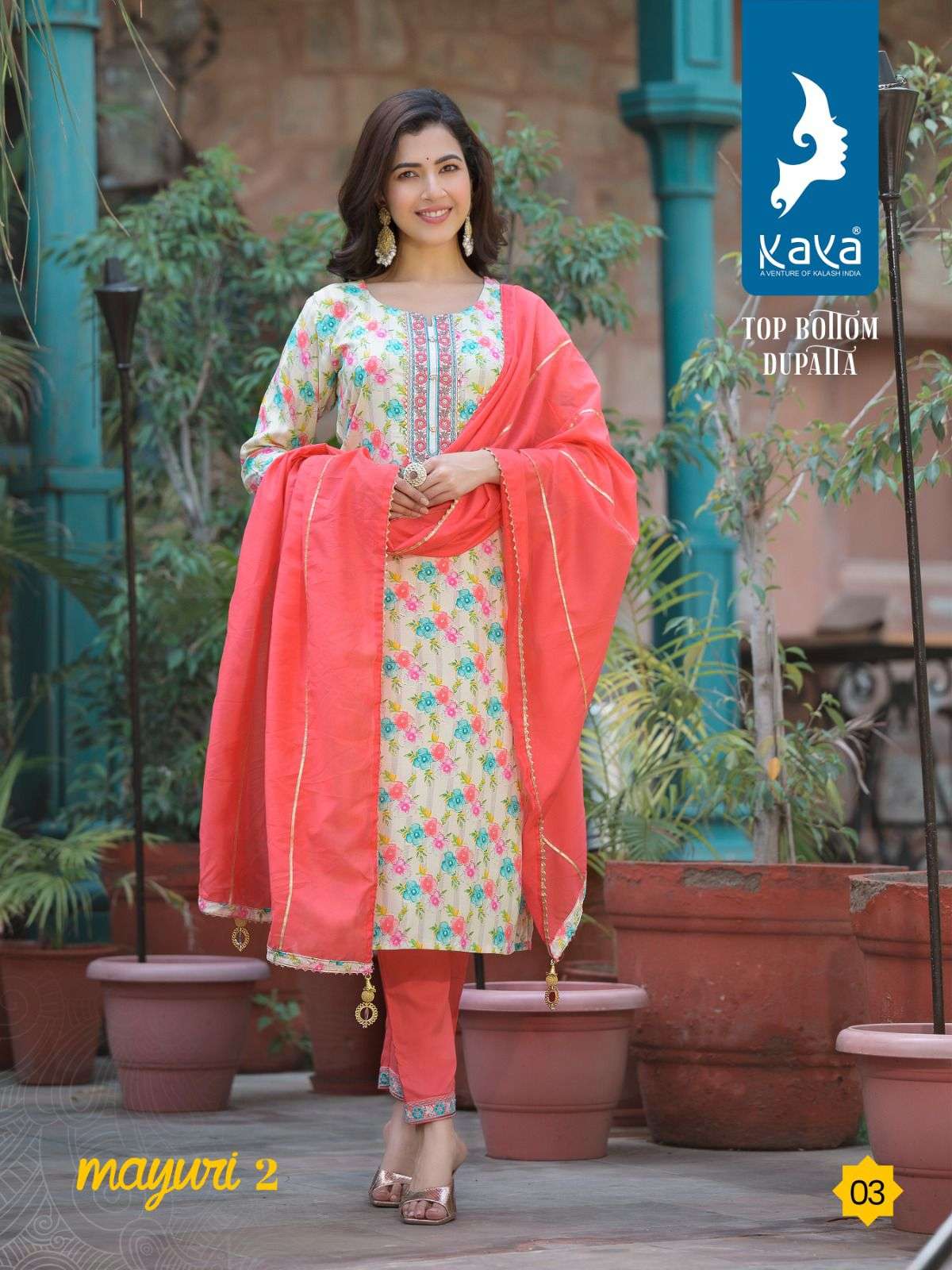 mayuri vol 2 by kaya 3pcs set amazing rayon print kurti with dyed pant and chanderi dupatta