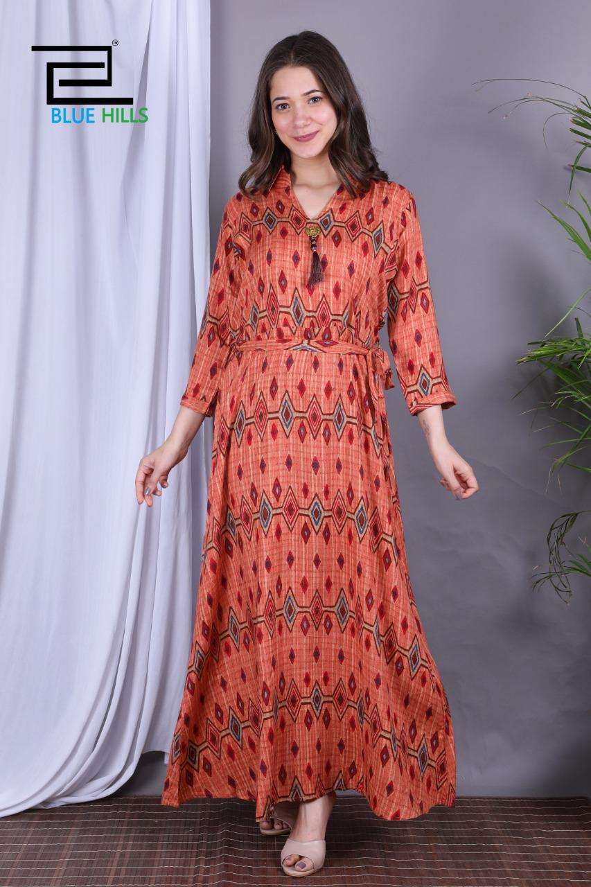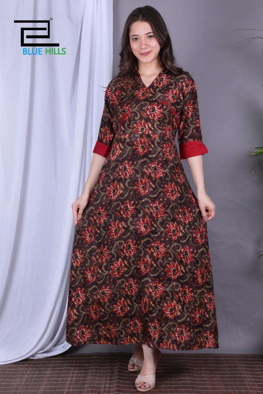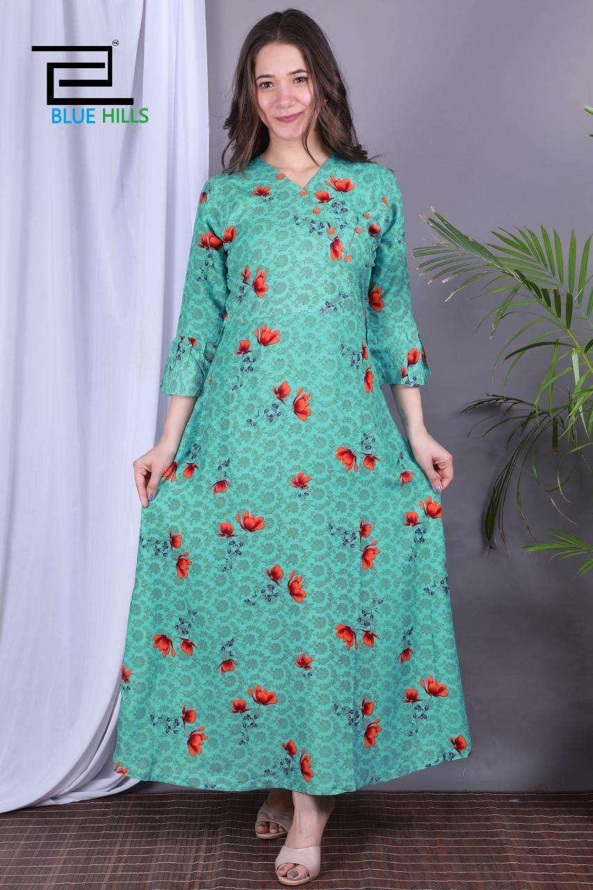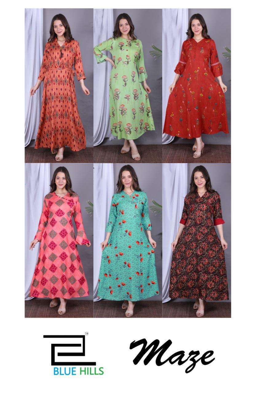 Brand name - BLUE HILLS Catalogue name - MAZE Fabric - heavy rayon print 14 KG Size L XL XXL Lenght 50+ Rate - 480+GST |