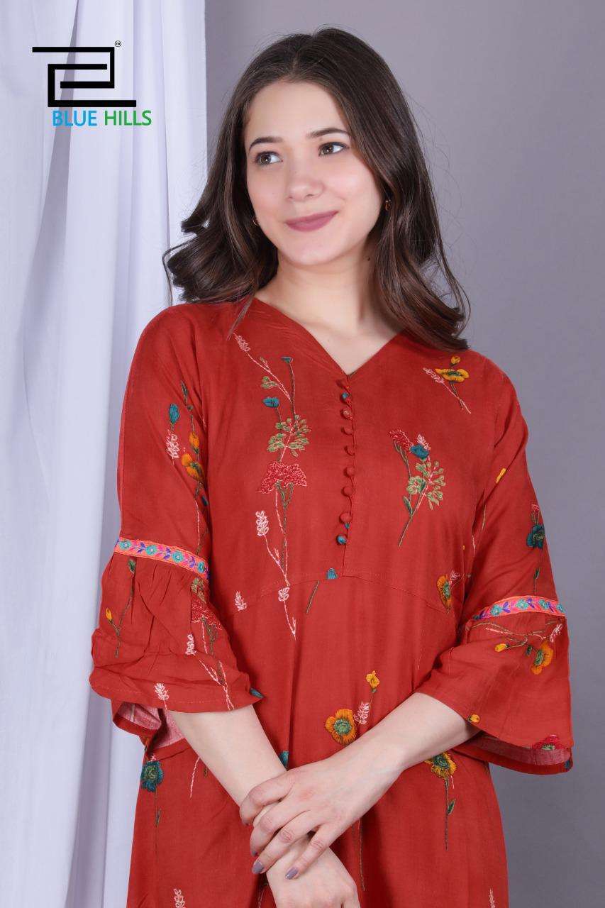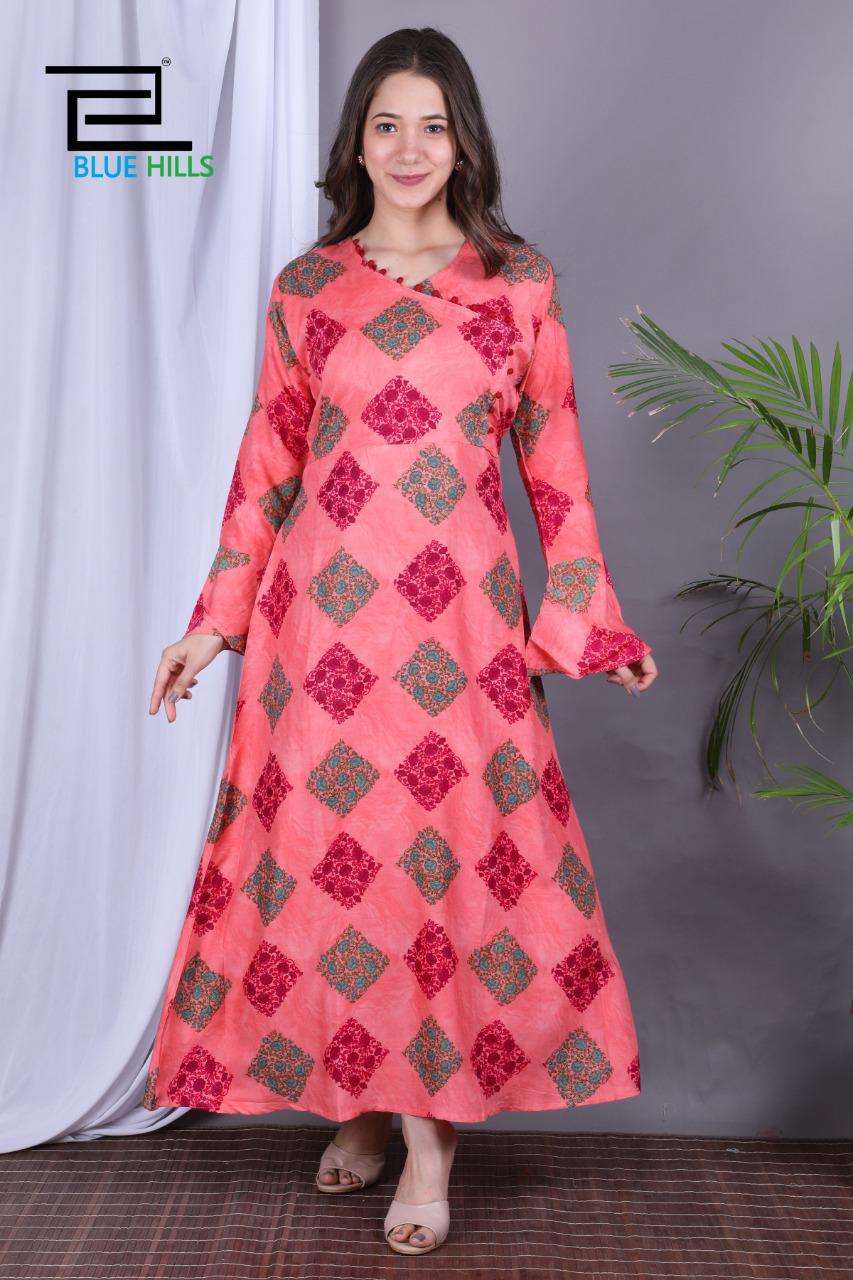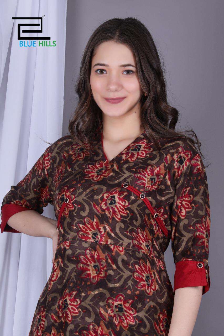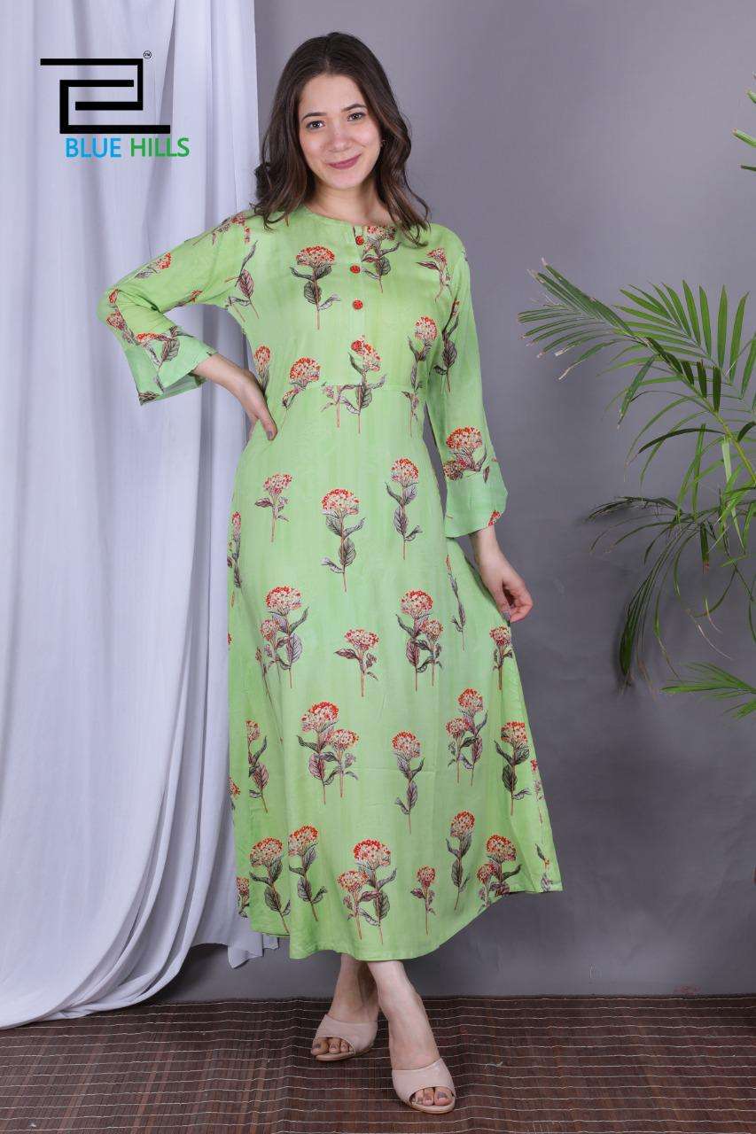 Brand name - BLUE HILLS Catalogue name - MAZE Fabric - heavy rayon print 14 KG Size L XL XXL Lenght 50+ Rate - 480+GST |